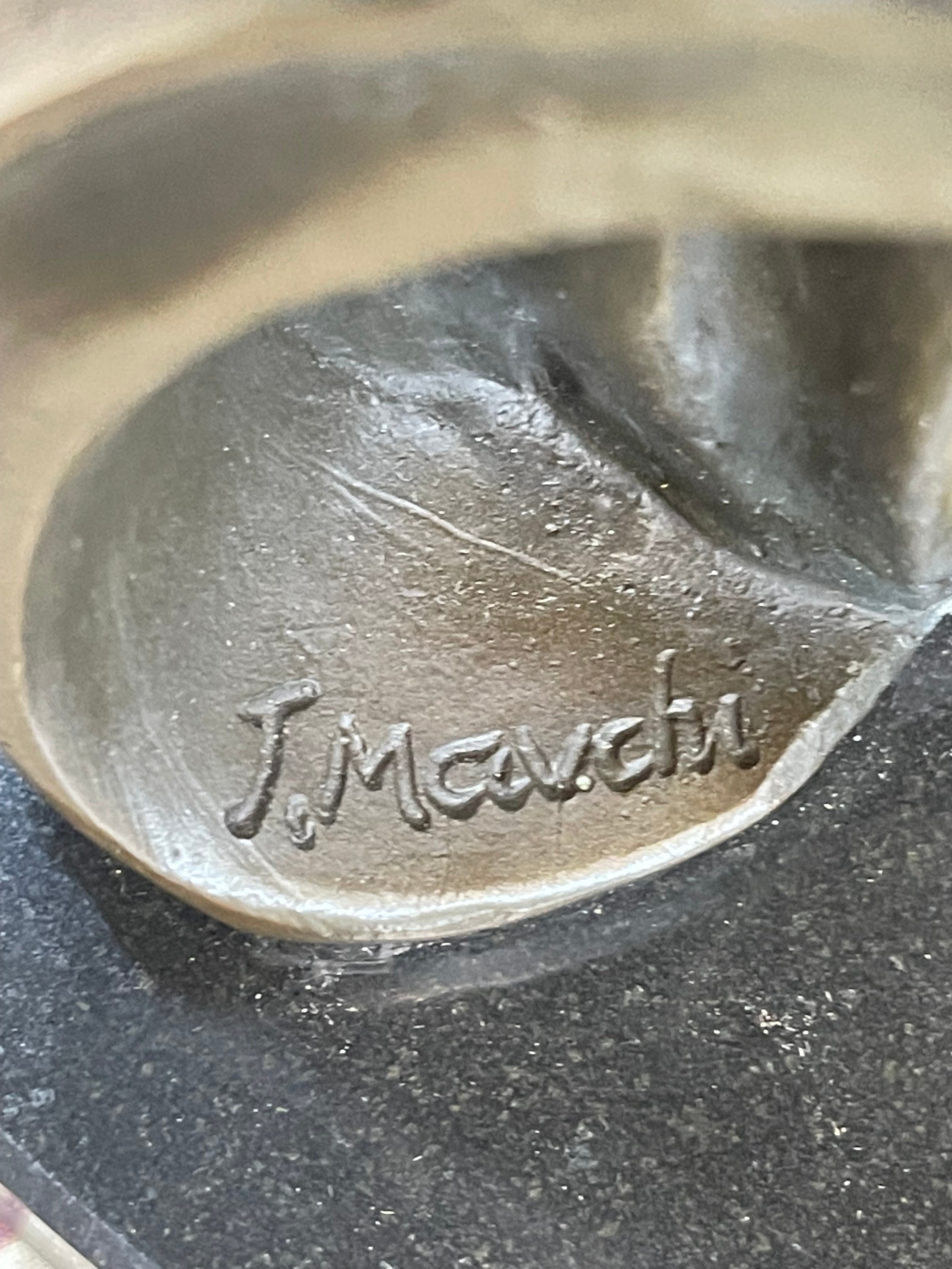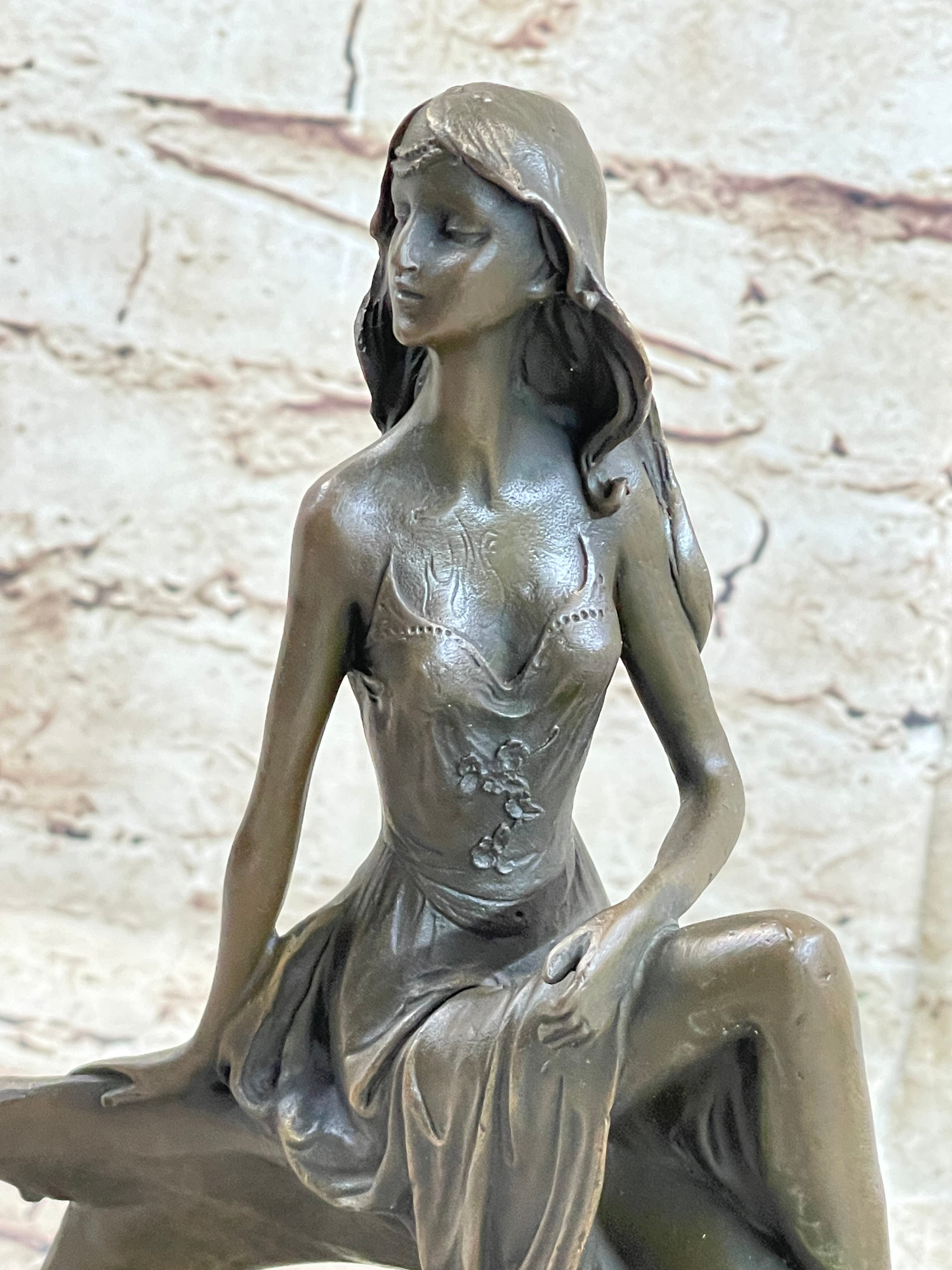 Crafted with meticulous attention to detail using the intricate lost wax method, this unique sculpture stands as a testament to the artist's unparalleled dedication to his craft. Poised on a sleek black marble base, the sculpture radiates a sense of understated elegance and sophistication, further accentuating the delicate beauty of the young girl's pose. Bearing the distinctive signature of the artist Mavchi, this exceptional piece serves as a testament to the artist's profound skill and artistic vision, reflecting the timeless allure and enduring legacy of his remarkable body of work.Bronze Dimensions with Marble Base: Height 10" X Width 6.5"