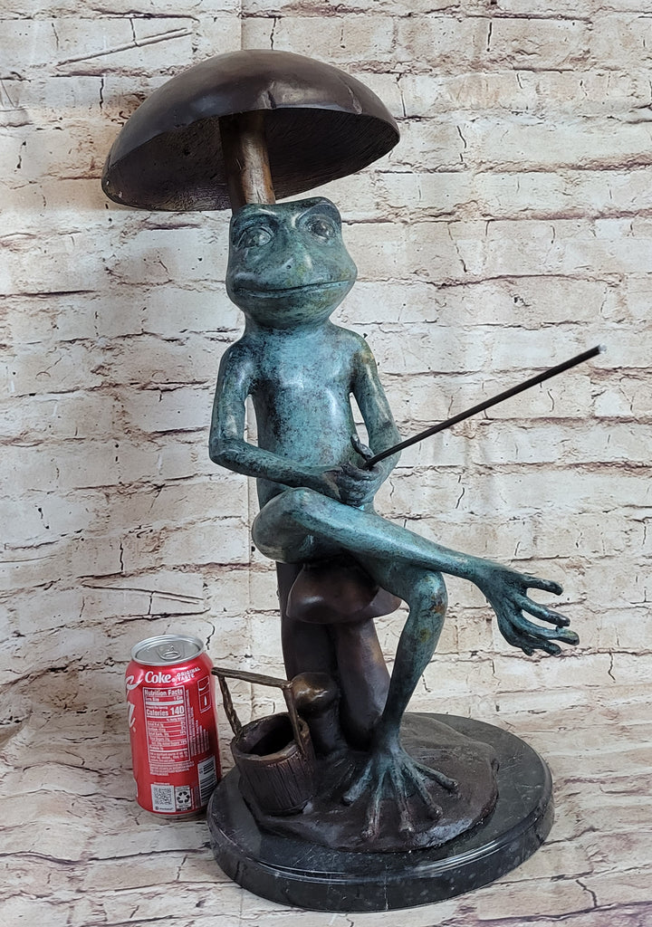 Bronze Sculpture Statue of a Frog Fishing Under a Mushroom Signed Original Art