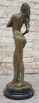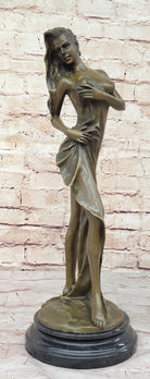 Add a touch of elegance to your space with this Nude Woman Girl Covering Herself with Towel Bronze Statue. It's not just a sculpture – it's a story captured in bronze.Bronze Dimensions with Marble Base: Height 19" X Width 8"