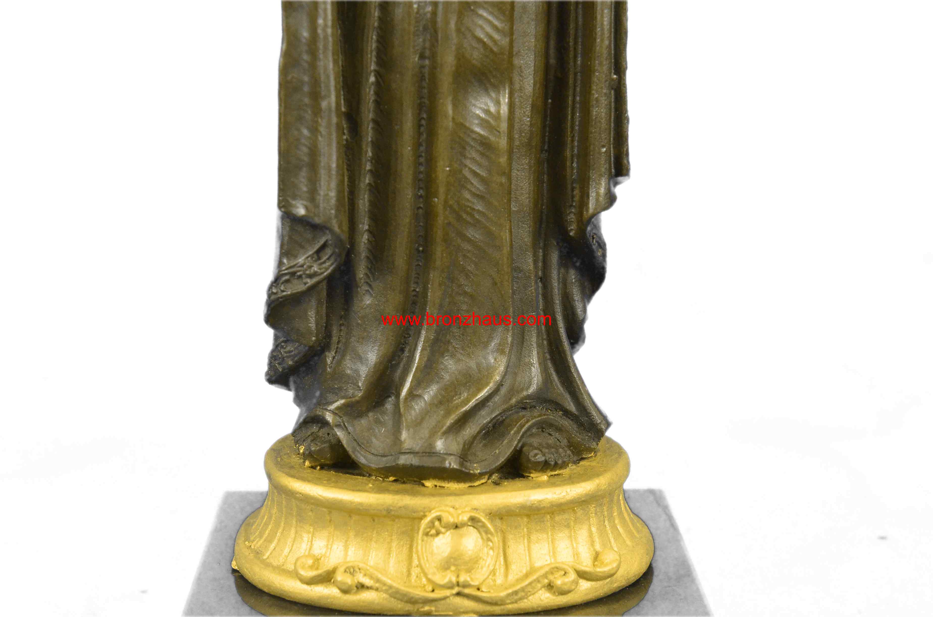 As the day moves to a close, with all worshipers and beggars of mercy gone to their homes, the Virgin Mary, overcome by the suffering and the voices of prayers, Standing tall with a crown on her head. Her compassion towards the suffering of humanity, brings tears to her eyes, that fall, blessing the ground, among the scattered tokens of flowers and wreaths left by the spiritually lost. The handmade bronze sculpture was cast using the archaic method of lost-wax casting and stained with a brown patina finish for perpetuation. She is mounted upon a black marble base with the artist Valli`s signature.Bronze Dimensions with Marble Base:Height 13" x Width 5"