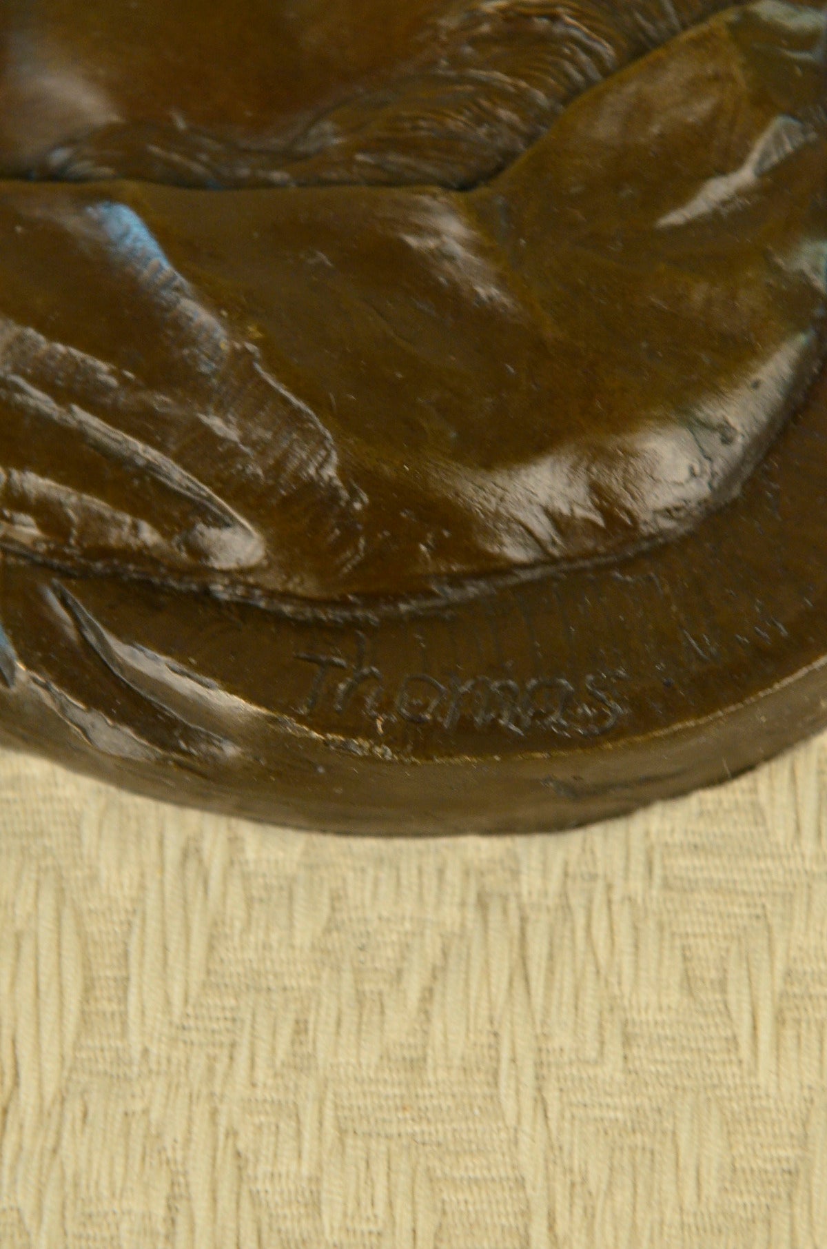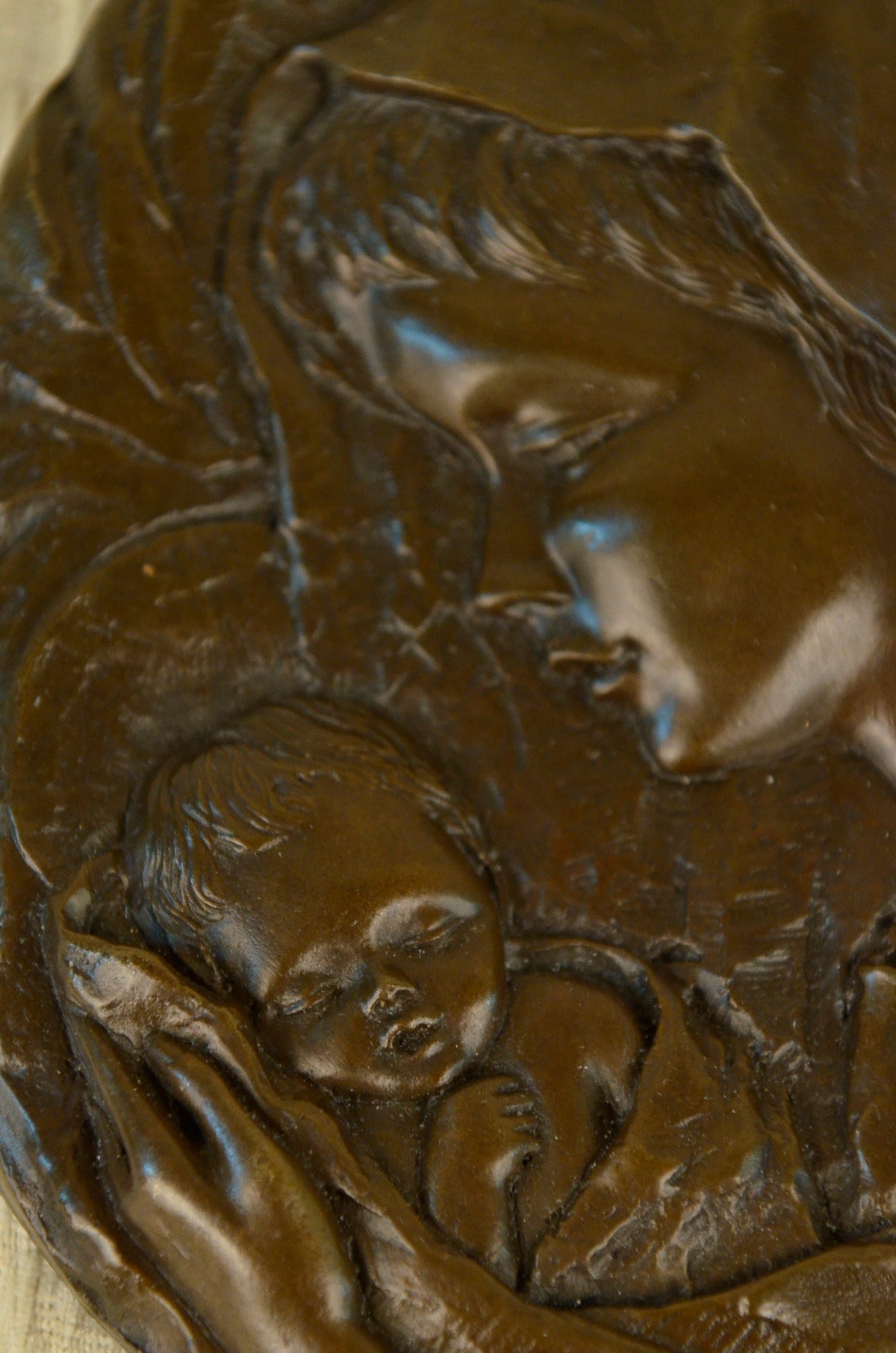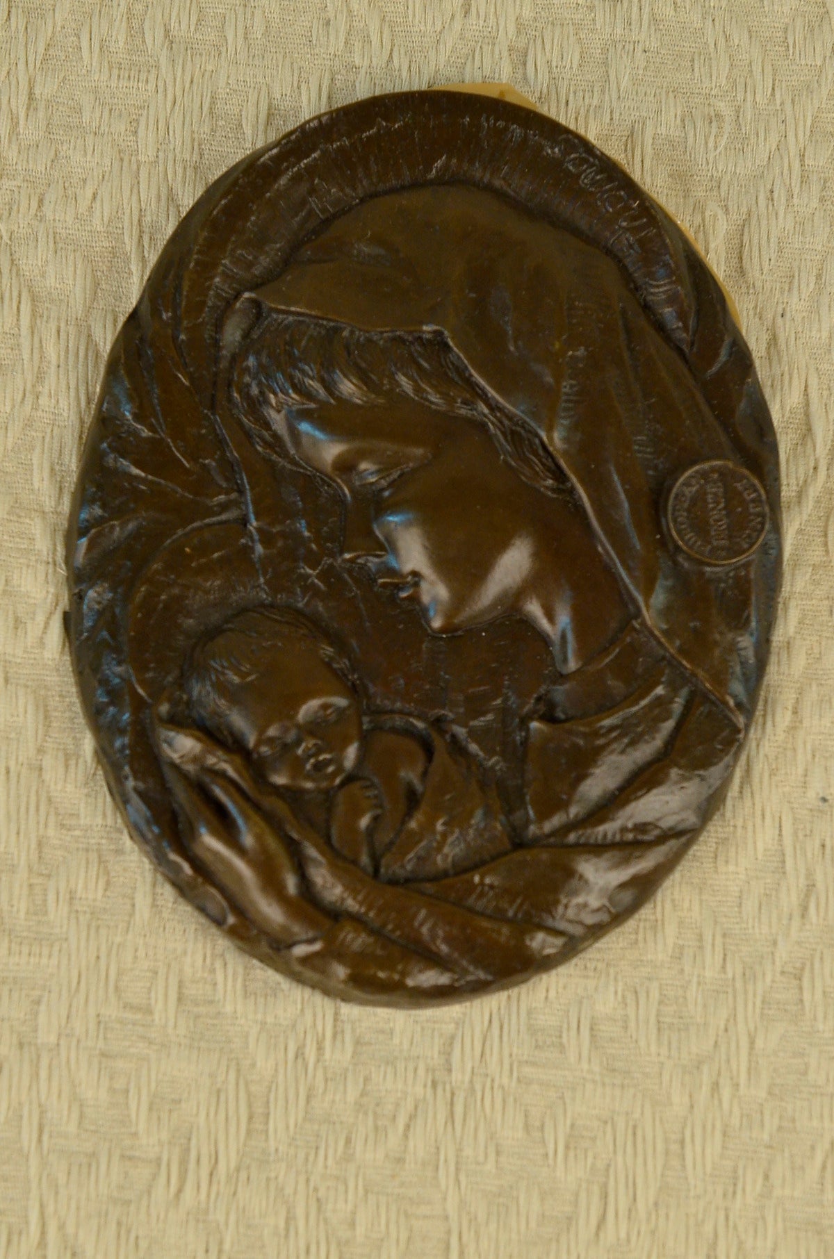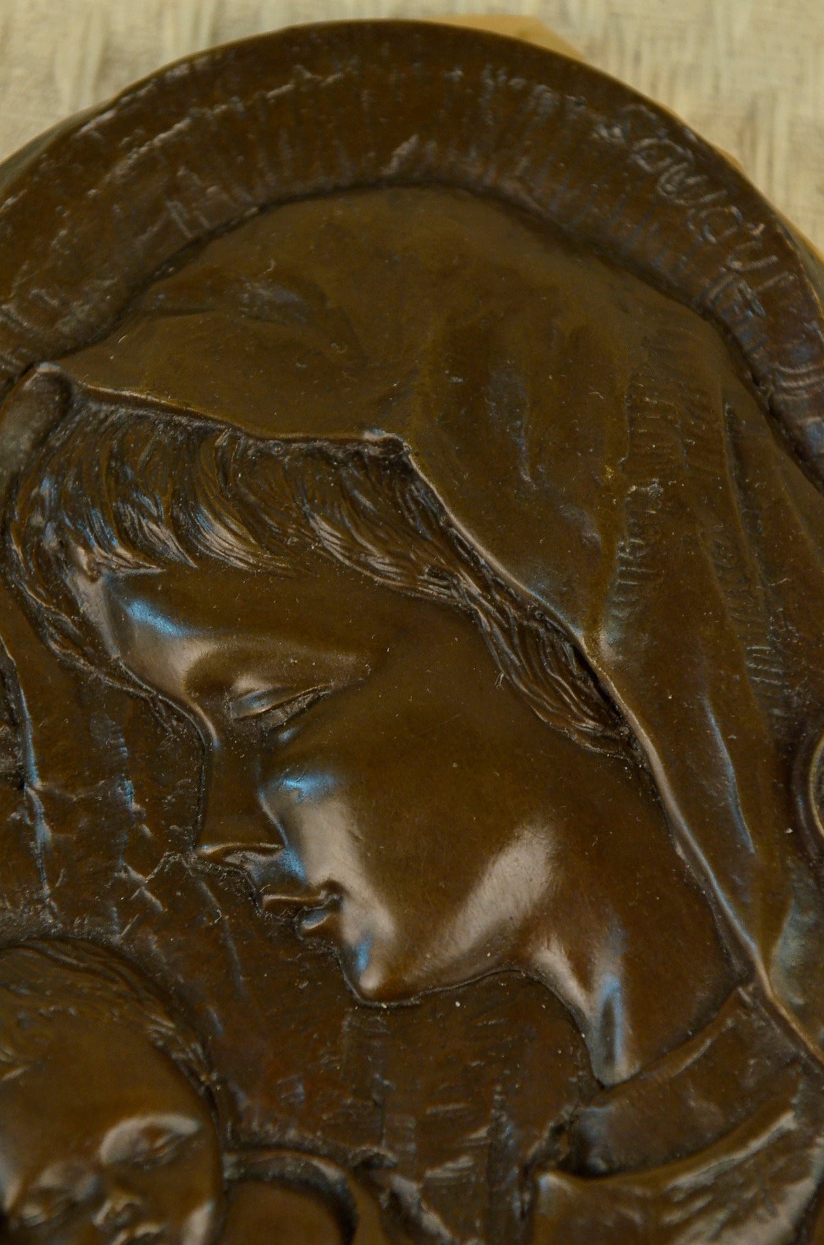 This Religious plaque of The Virgin Mary carrying baby Jesus is beyond beautiful. She has her significant holy head Vail, as she looks down towards her only son who is gracefully smiling and looking away. This sculpture would be the perfect gift for the Religious Catholic in your or a friends family. The sculpture was cast using the ancient old "Lost Wax Method" stained in a brown and greenish patina finish for preservation. 100% handmade and 100% bronze, signed by the artist ThomasBronze Dimensions :Height 8" x Width 6"