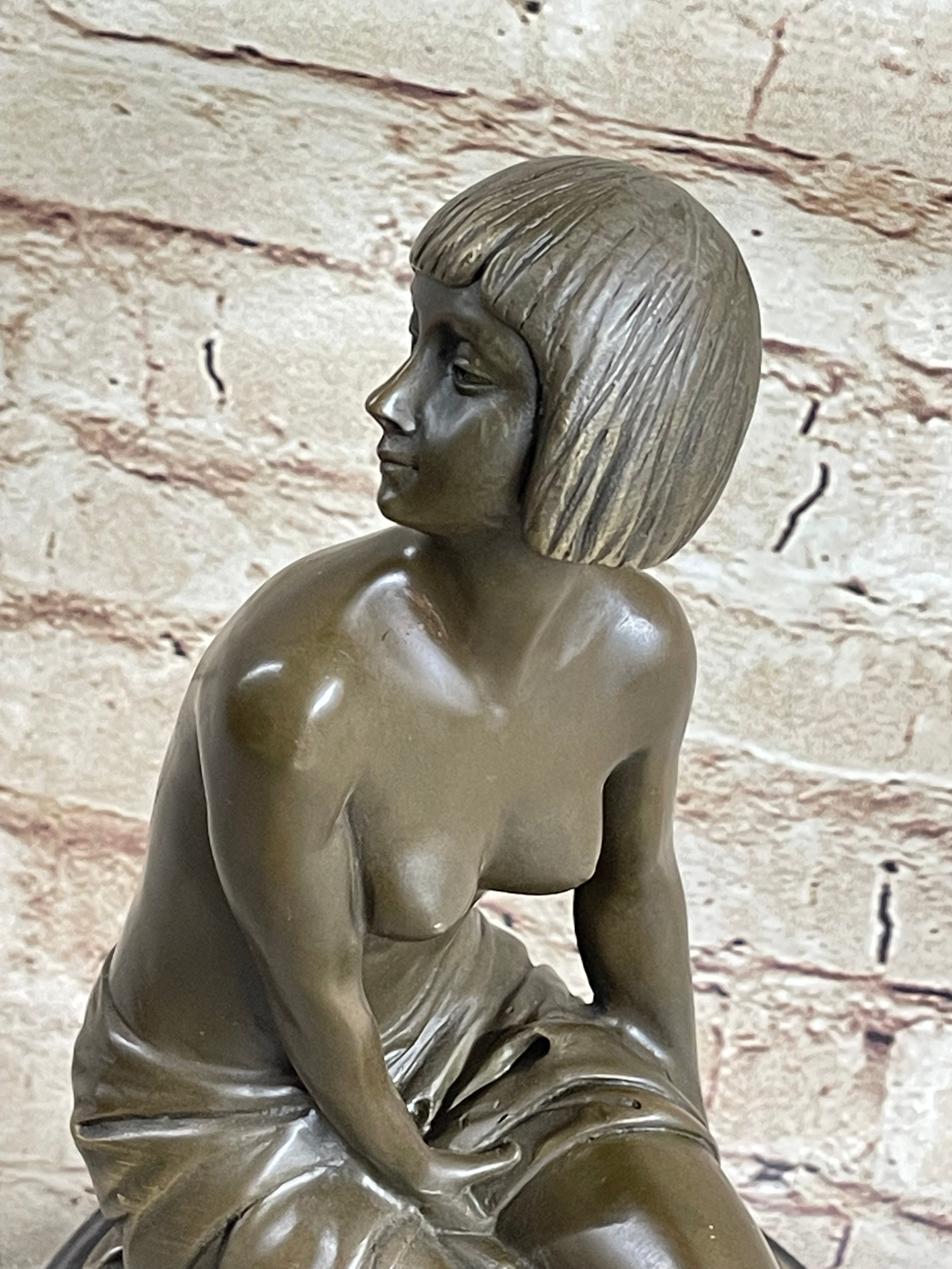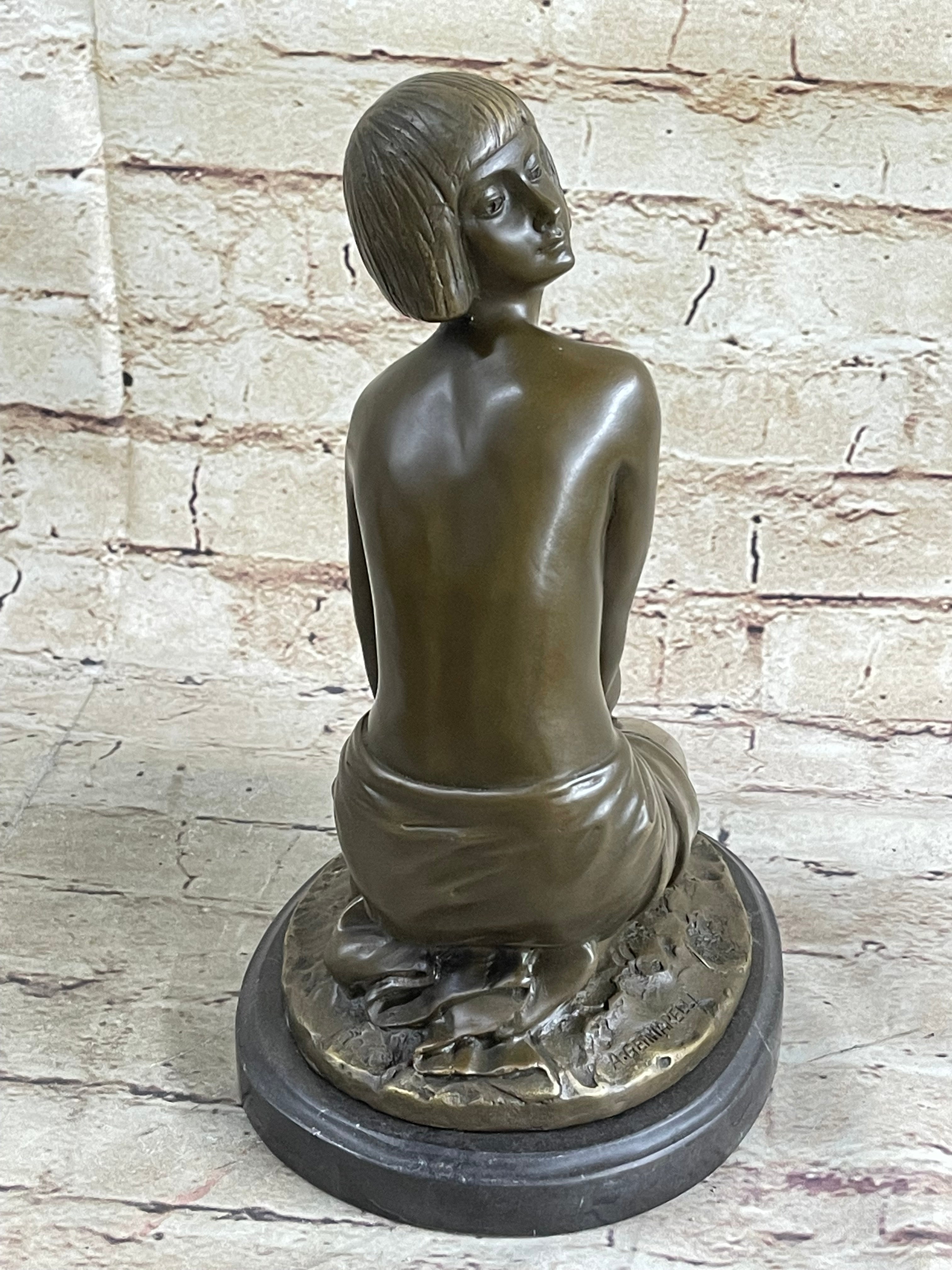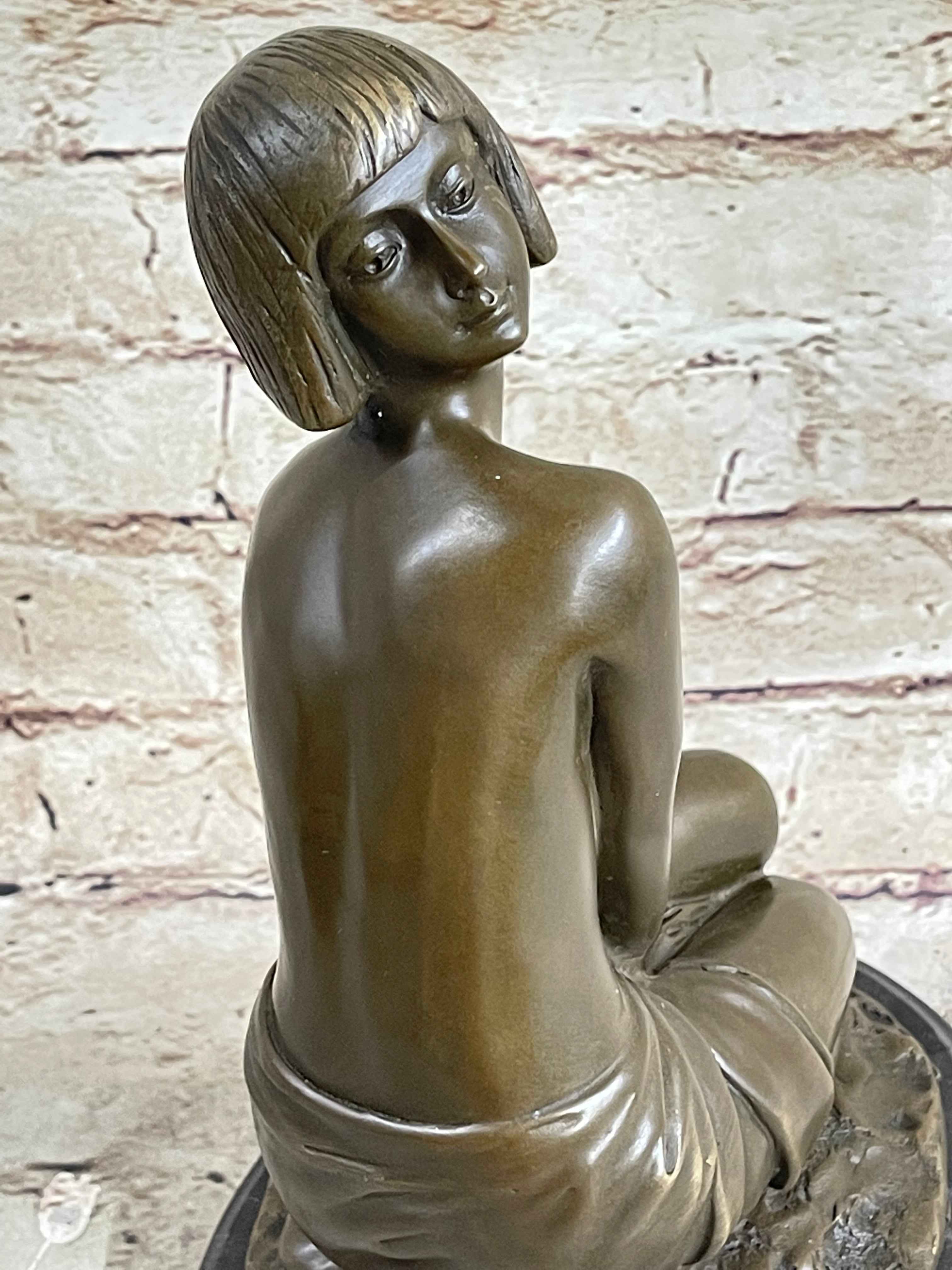 This classic Art Nouveau bronze sculpture by the French master A. Gennarelli captures the timeless grace and introspection of youth. The beautiful figure of a young nude girl sits in a pensive pose, her short, cropped hairstyle delicately framing her serene face. A soft cloth is loosely draped over her legs as she gazes thoughtfully into the distance. Every detail—from her gentle expression to the natural flow of her form—reveals the sculptor’s mastery of emotion and anatomy. The piece is mounted on a solid black marble base and stands approximately 10 inches high. Each sculpture is individually crafted and signed “A. Gennarelli” in the bronze.