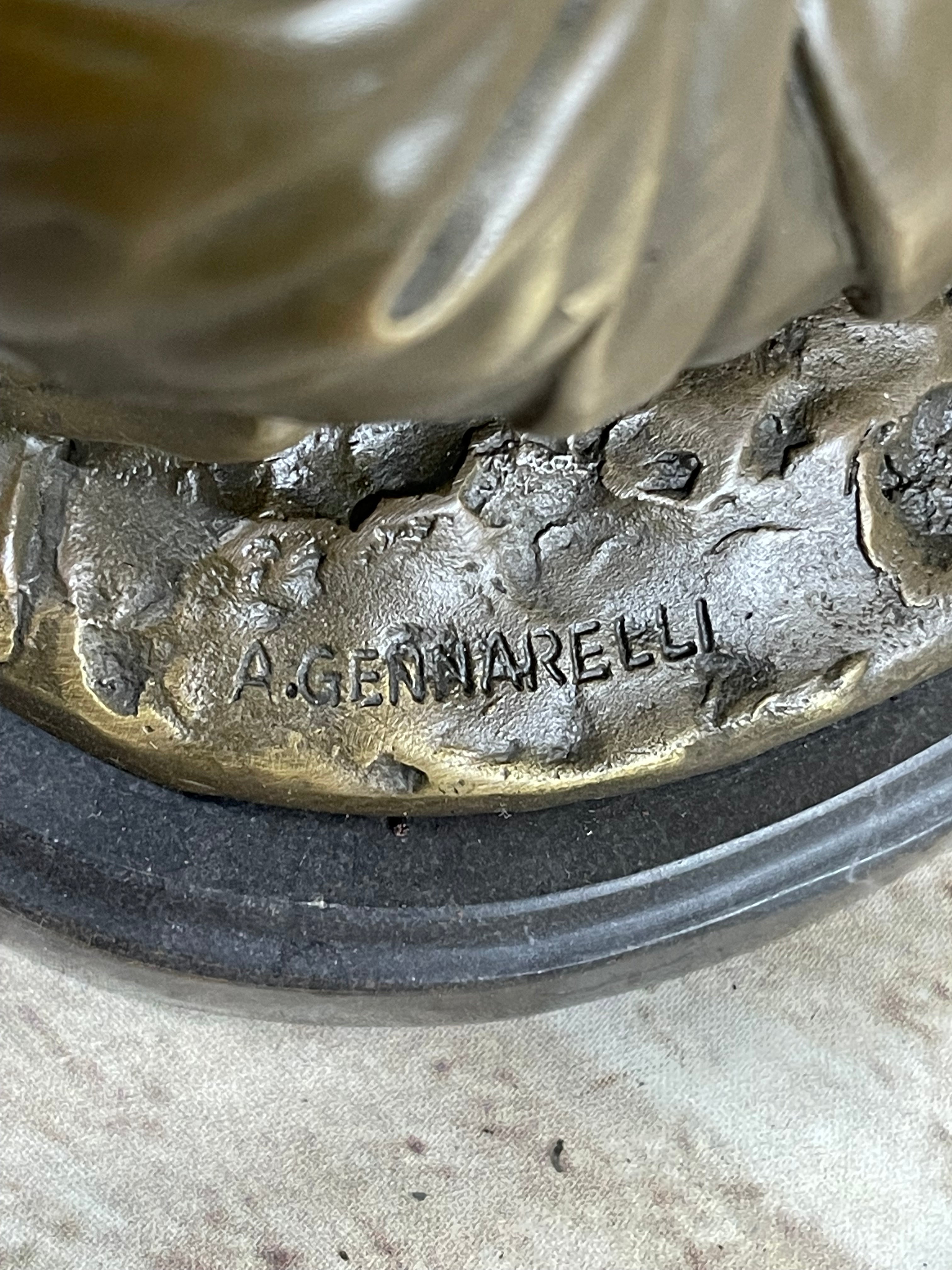 Produced in a traditional European art foundry, this piece reflects devotion to quality, fidelity, and craftsmanship. The foundry follows the same meticulous methods that have been used for centuries to cast bronze masterpieces displayed in museums, galleries, and fine art collections worldwide. This pure bronze sculpture by A. Gennarelli is more than a decorative work—it is a lasting piece of art history, destined to be cherished for generations.Bronze Dimensions with Marble Base: Height 10" X Width 6"