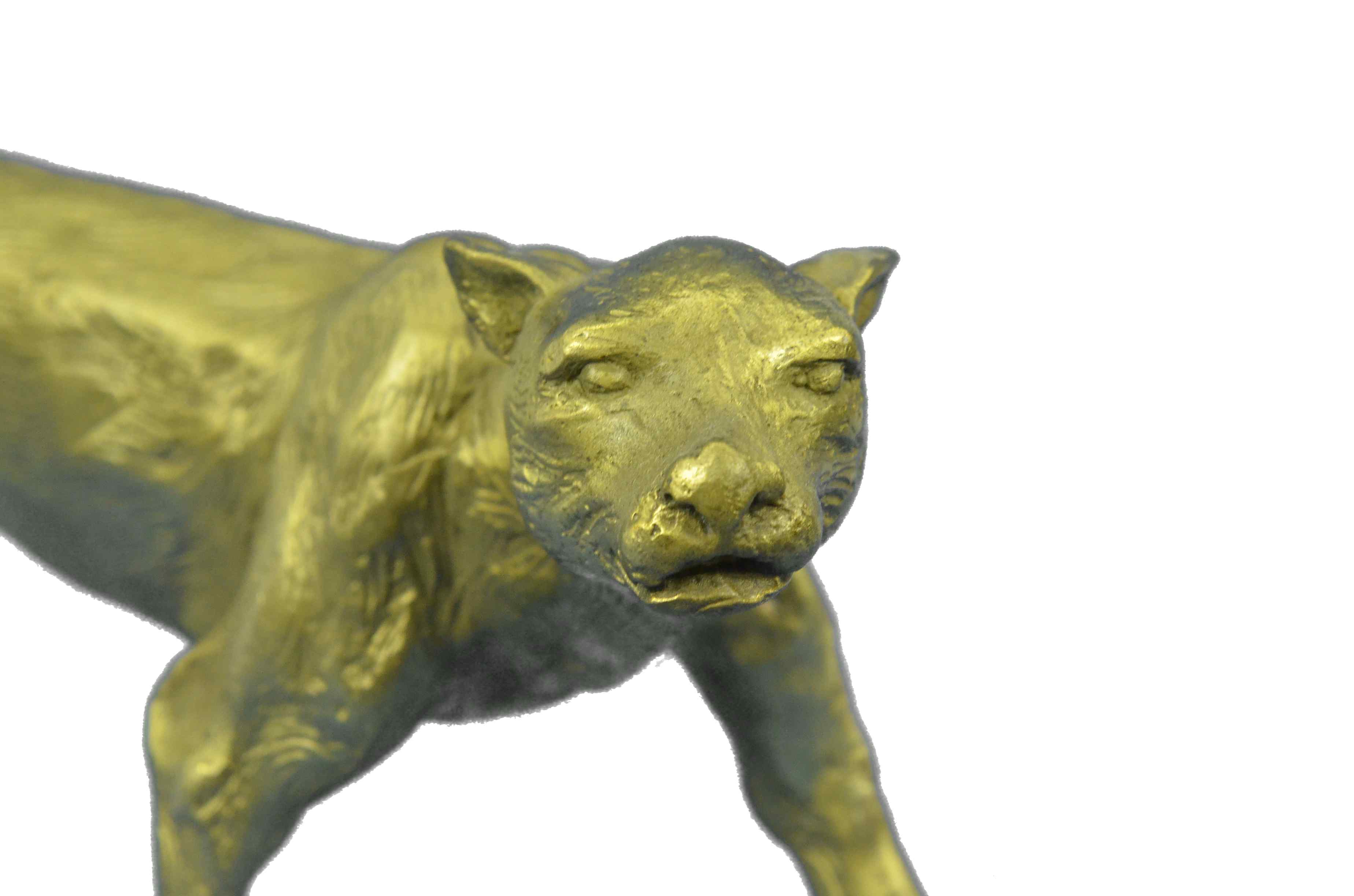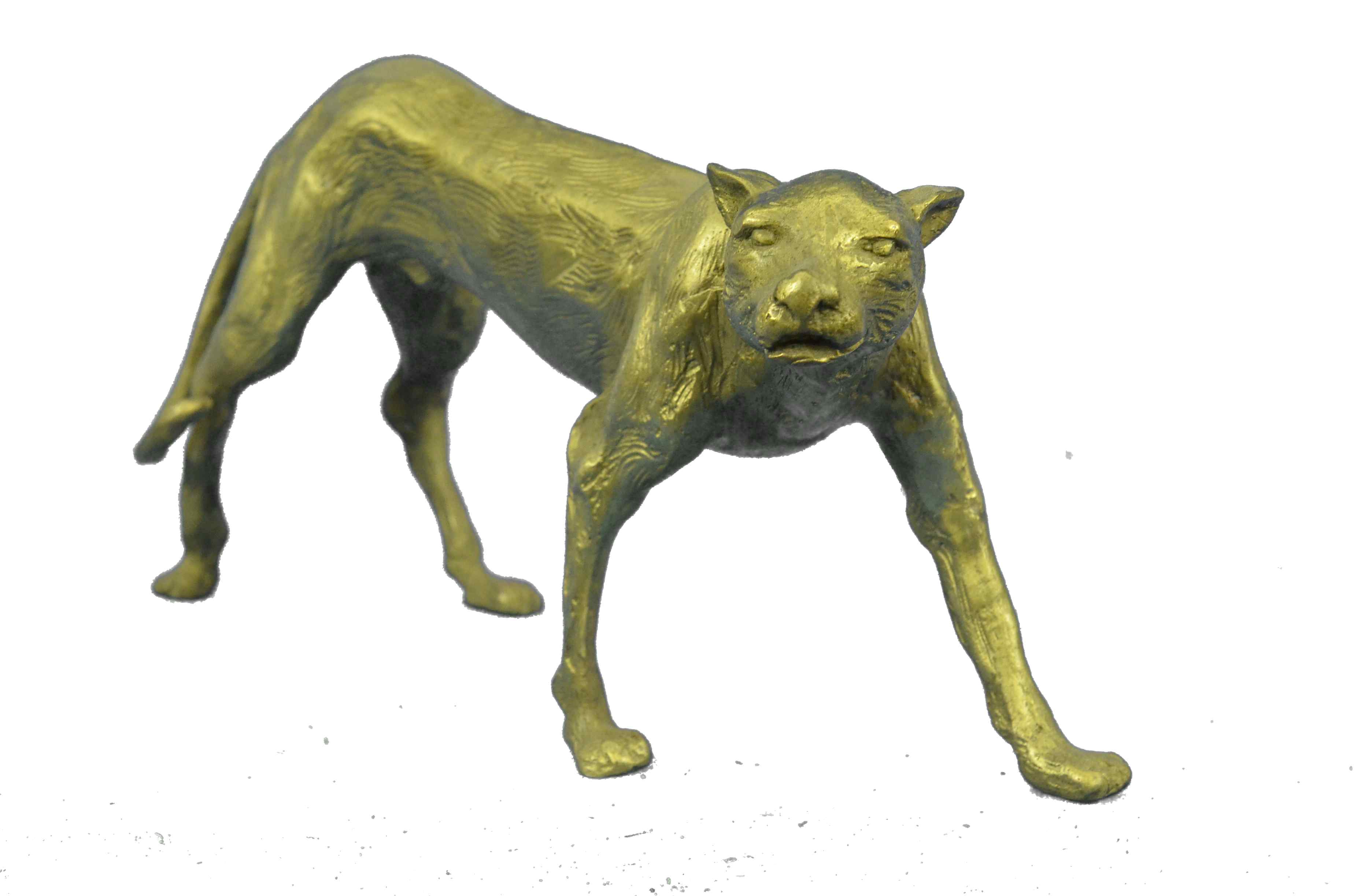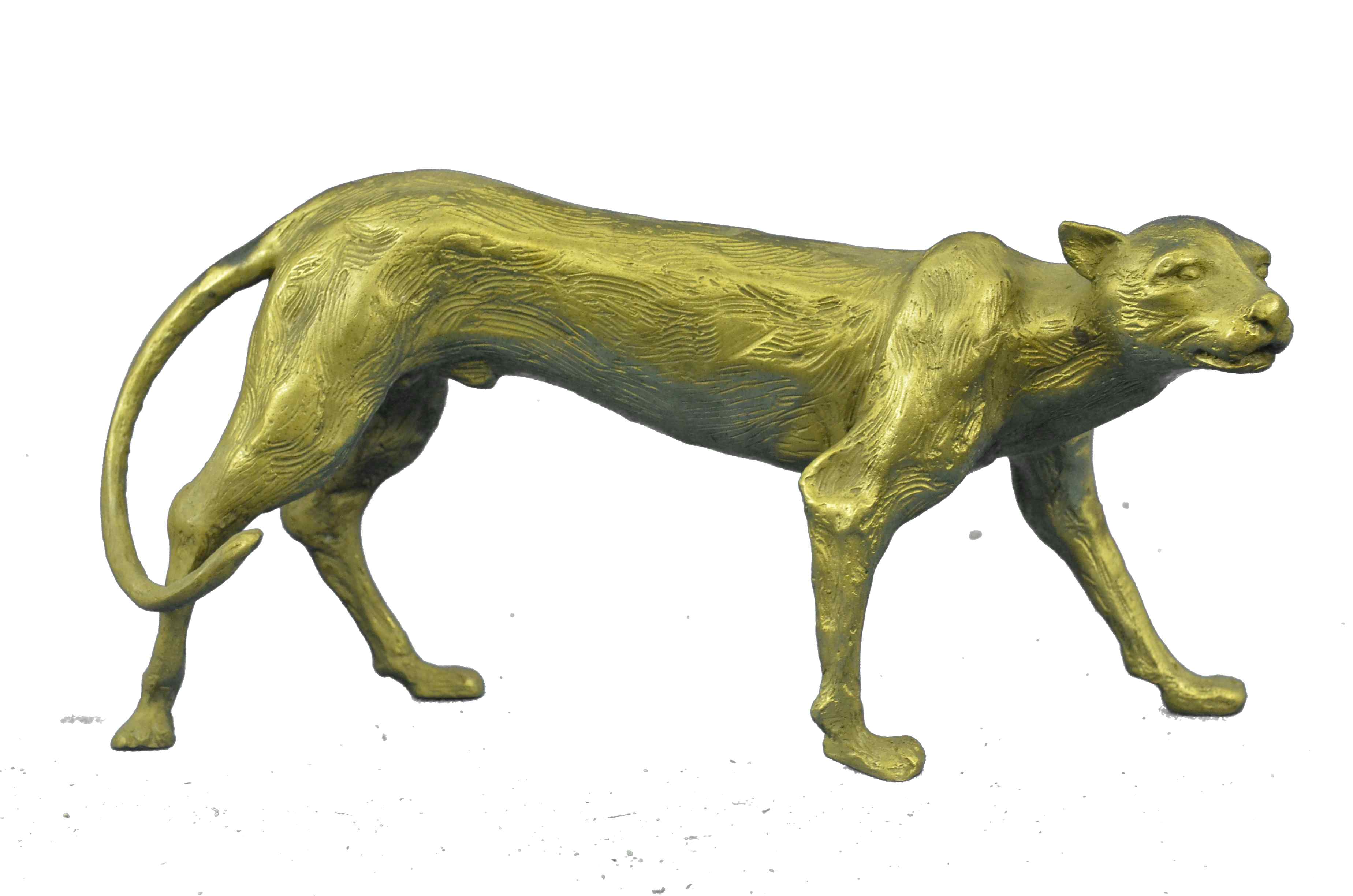 Her muscles flex as she walks across the open fields. This sculpture draws you in to the action and lets your imagination run wild as you join her on her walk across the wide open plains of the outdoors. This amazingly detailed sculpture portrays the Cougar stride beautifully as she transitions her paw and her weight while walking. Her facial expression shows calm, cool, and playful as she paws at the ground. A suiting soft brown patina highlights the muscles on the tiger’s legs, paws, & head. The head of the tiger is beautifully detailed right down the shape of the skull, jaw line, ears and facial structure. This bronze sculpture was casted using the “Lost was Method”. This Sleek and Graceful piece is perfect for the wildlife lover in you.Original or Reproduction: Reproduction