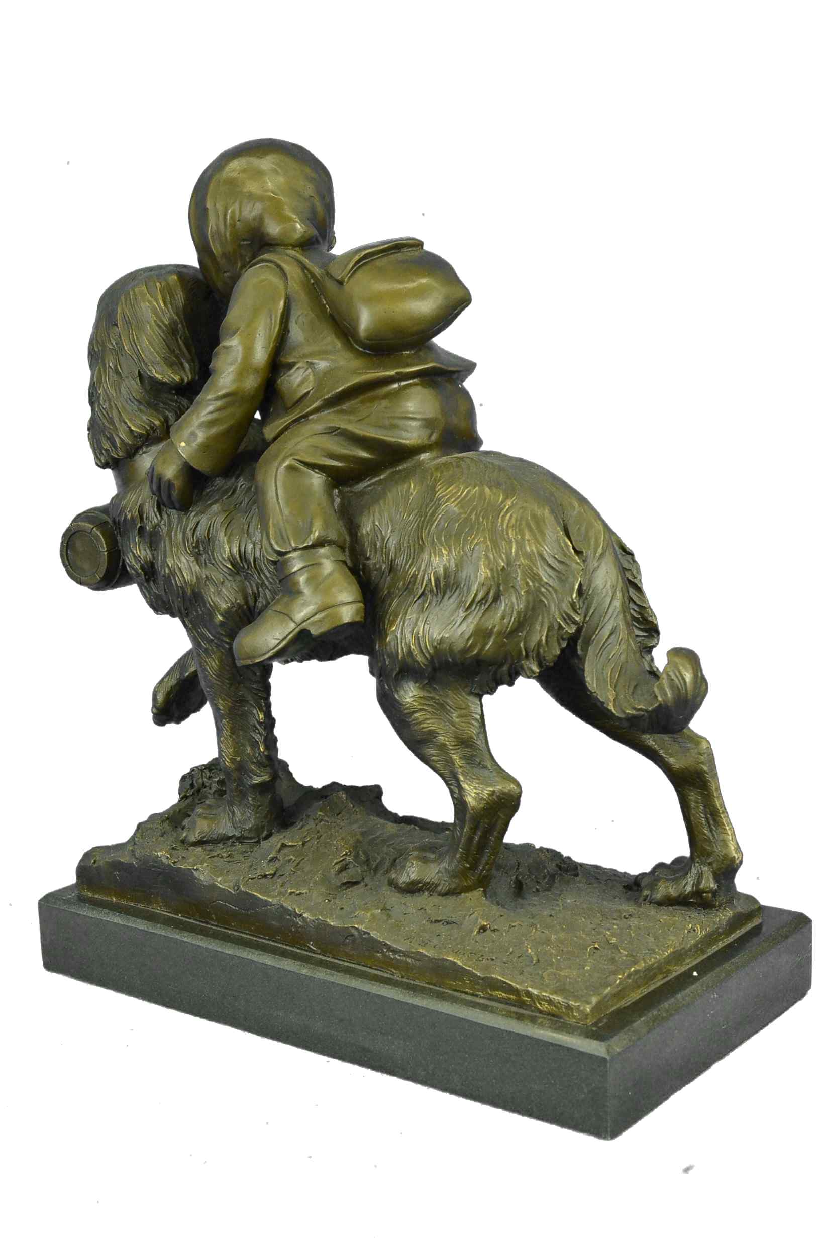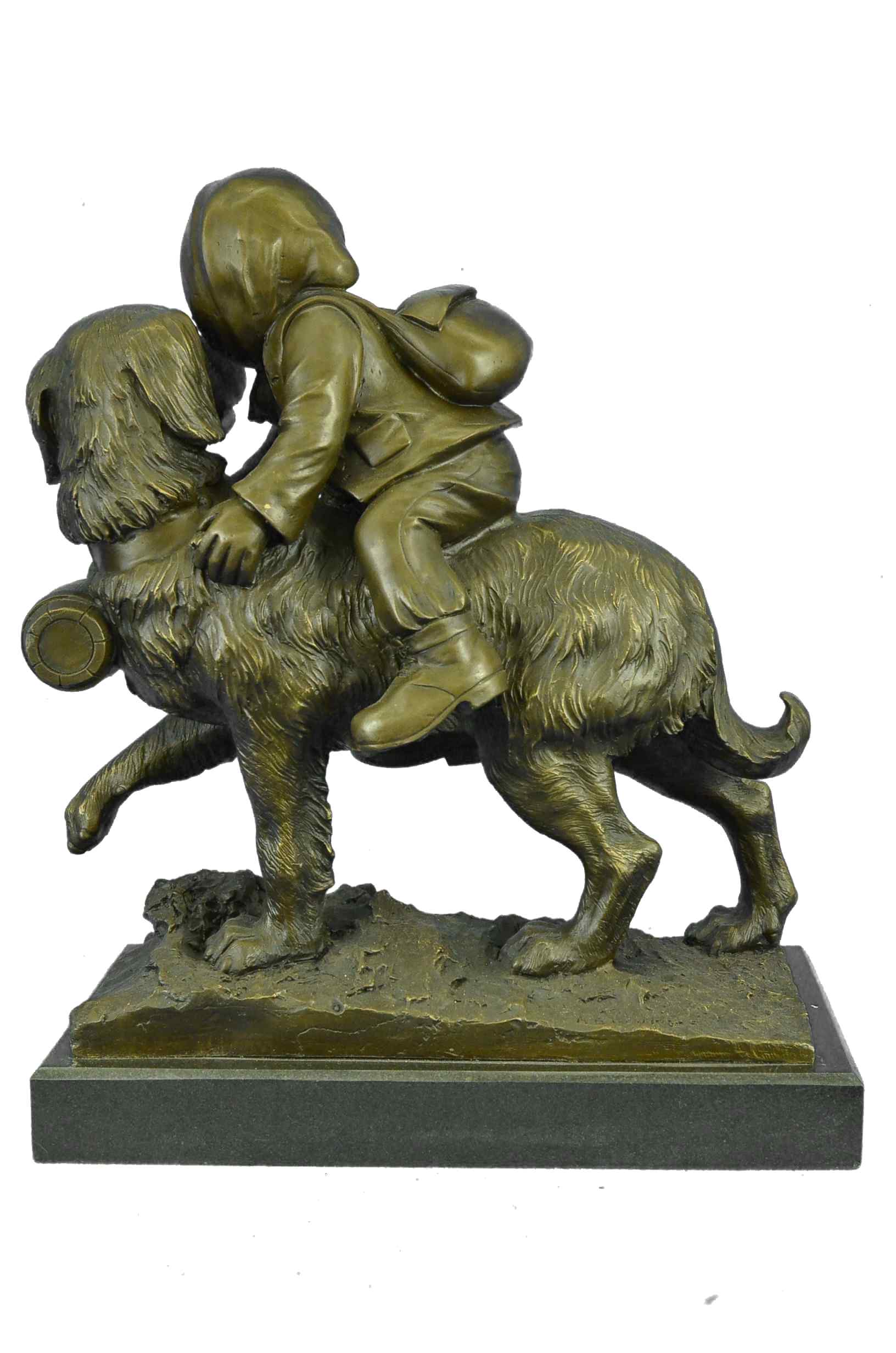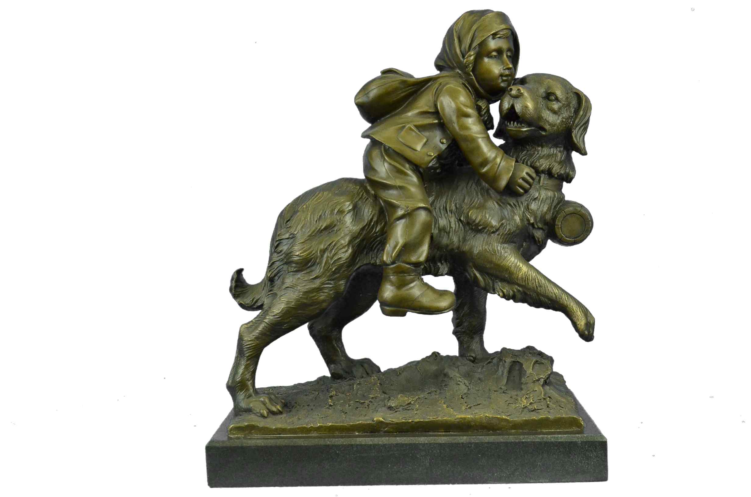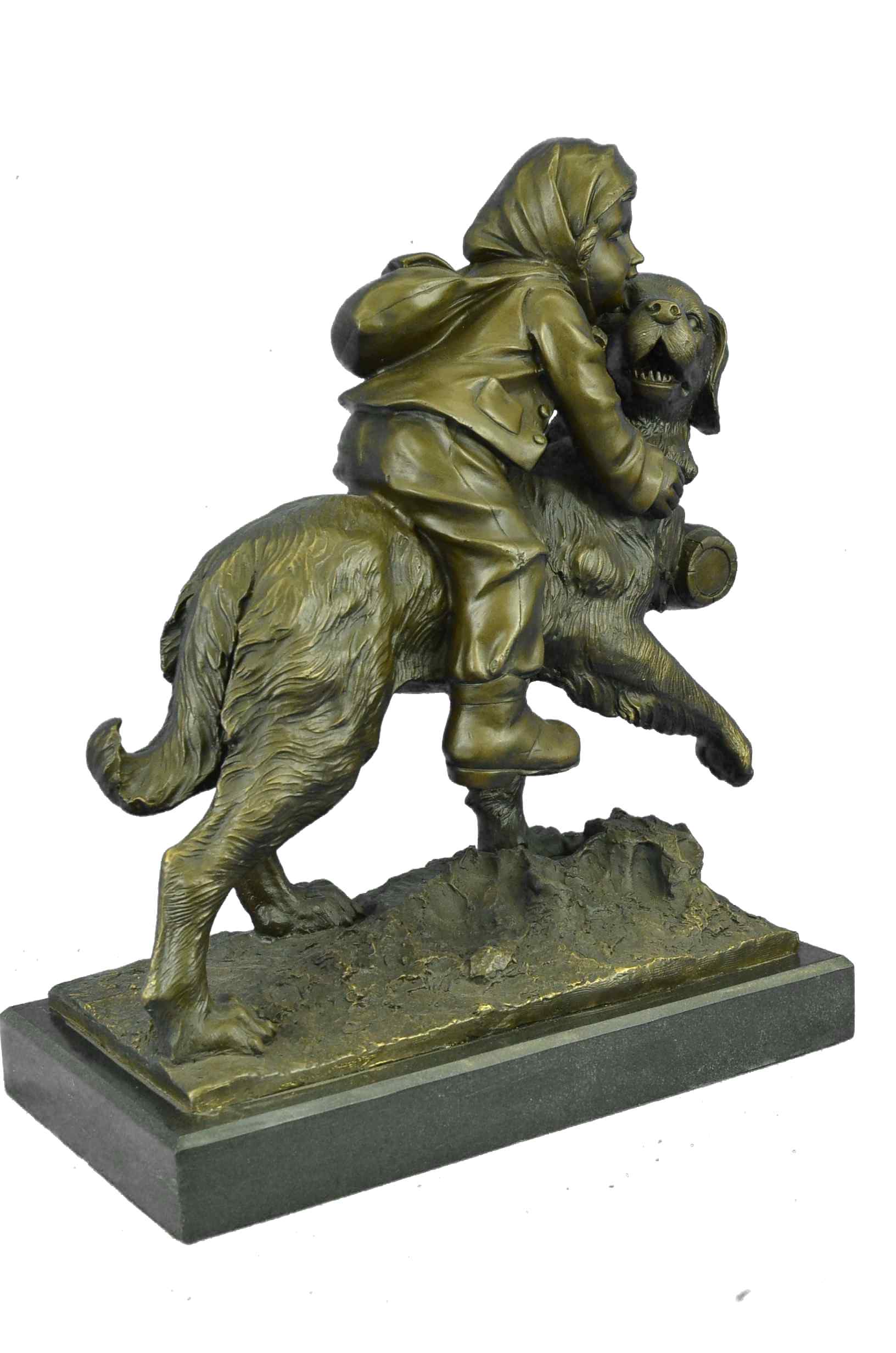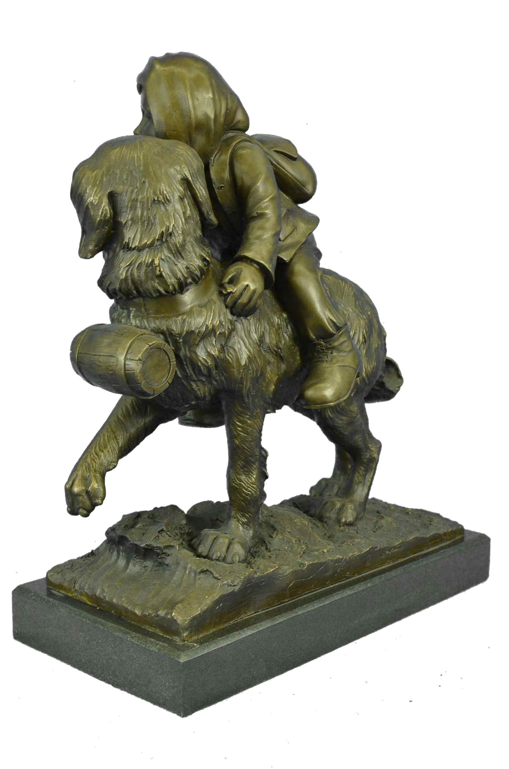 Chien Du St. Bernard St. Bernard popular dog of the 19th century, was bred by monks for intelligence, bravery and power. Guadez work captures these traits. Dog is sculpted returning from mission of finding young traveler lost on mountain trail. The bronze masterpiece was cast using the lost-wax casting method and stained with a brown patina finish. The sculpture stands upon a black marble square base with the artist Guadez signature.Bronze Dimensions with Marble Base:Height 16" x Width 14"