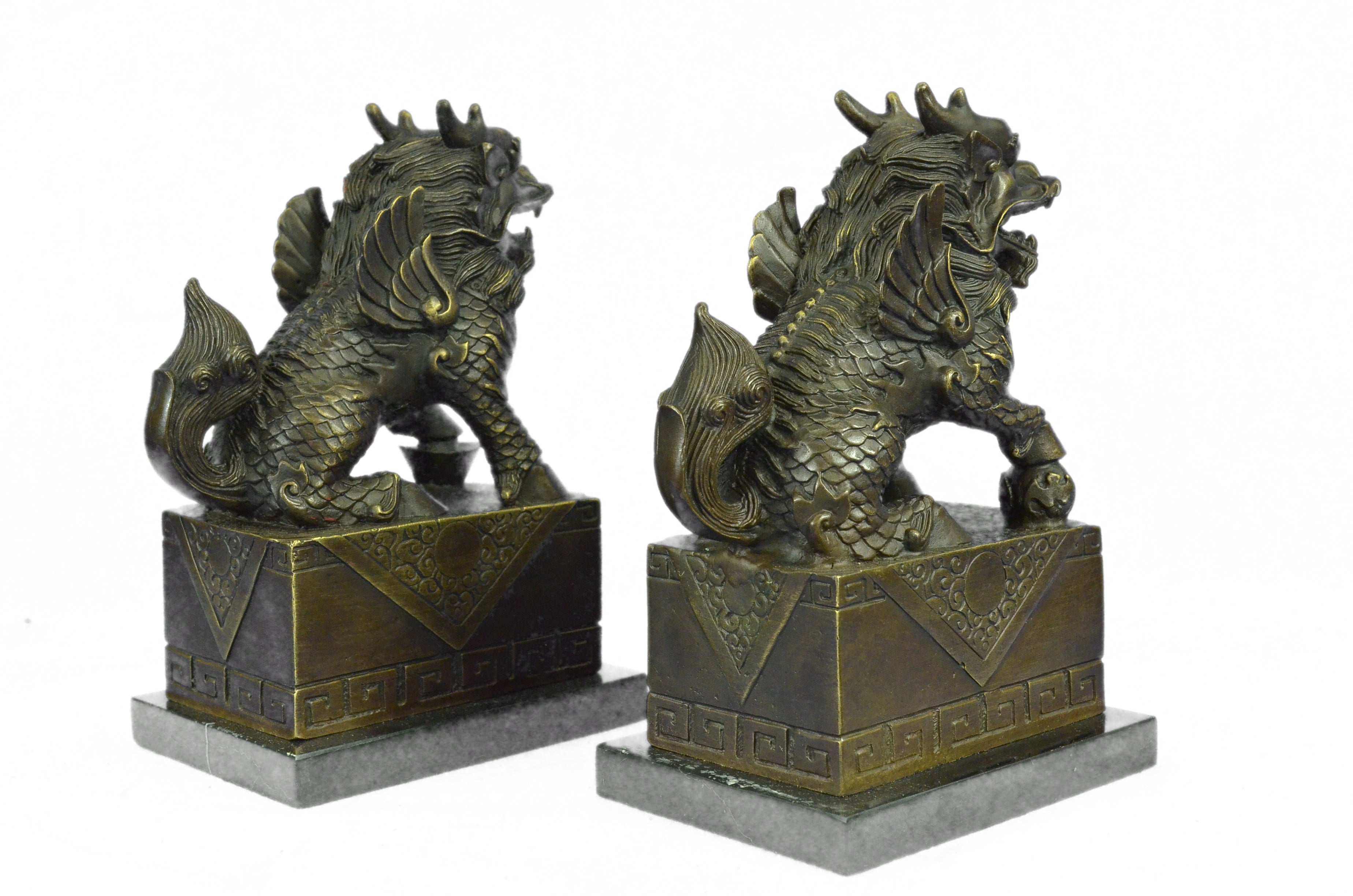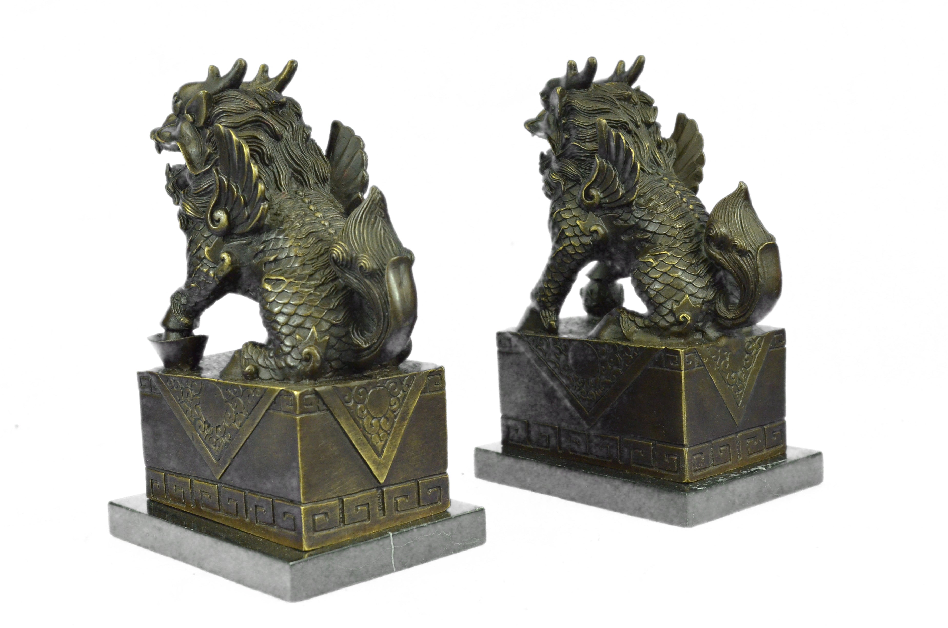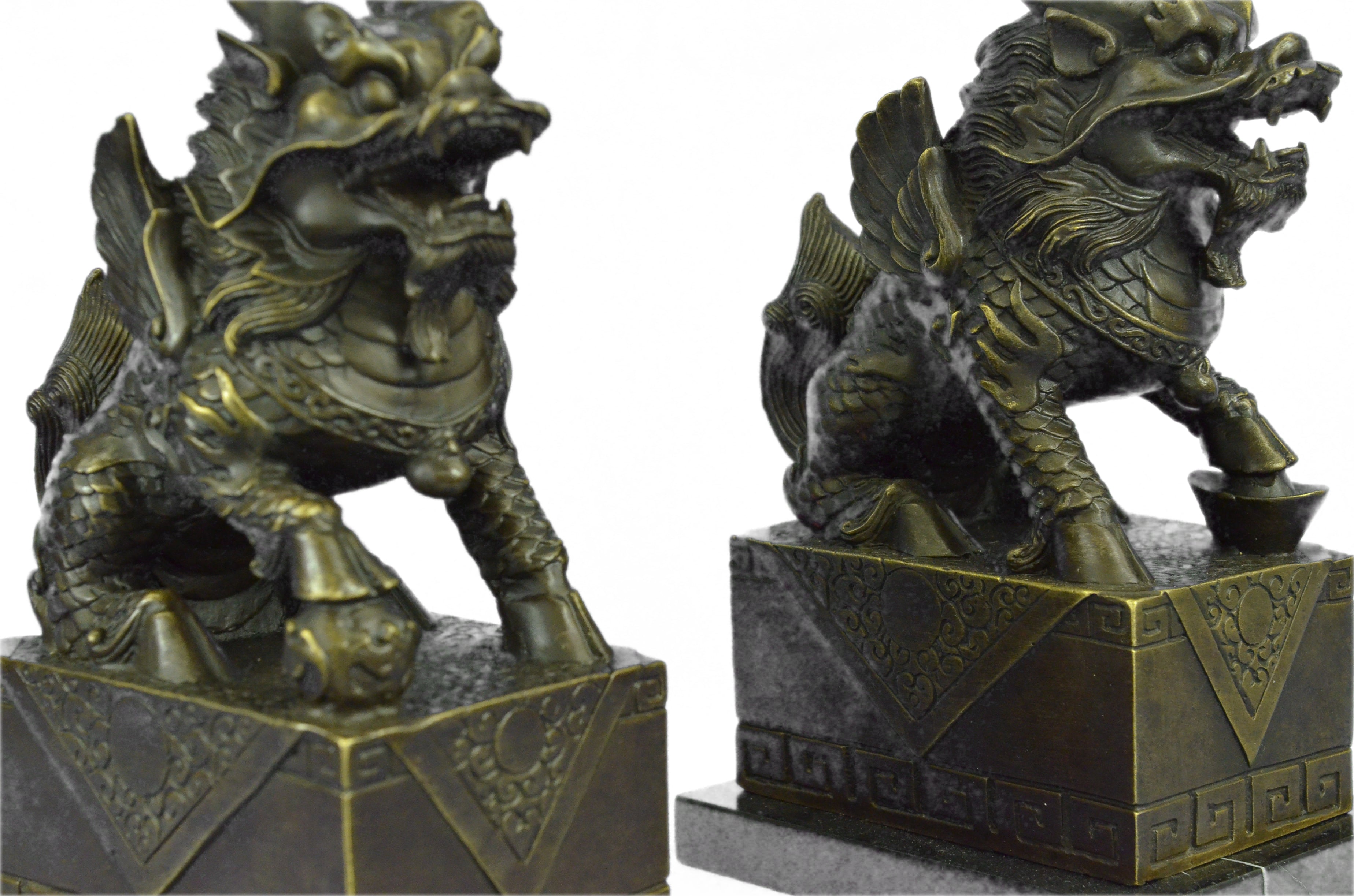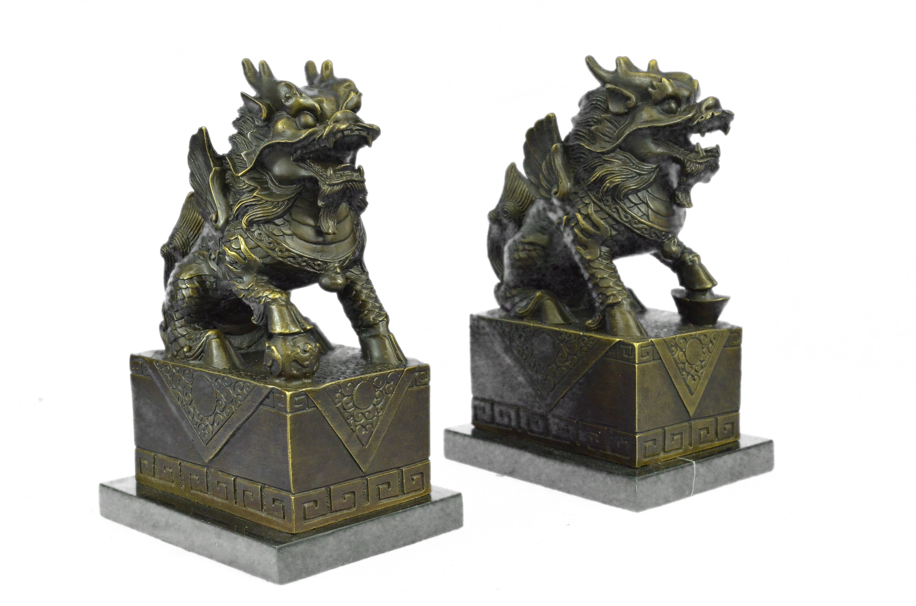 This is a bronze sculpture of a "Foo Dog" which are Chinese guardian lions, known also as Imperial guardian lions. They are believed to have powerful mystic protective powers and traditionally stood in front of Chinese Imperial palaces, Imperial tombs, government offices, temples, and the homes of government officials and the wealthy from the Han Dynasty (206 BC-AD 220). Pairs of guardian lions, a manifestation of yin and yang ( the female representing yin and the male yang), are still common decorative and symbolic elements at the entrances to restaurants, hotels, supermarkets and other structures, with one sitting on each side of the entrance. This handmade bronze sculpture was cast using the ancient method of lost-wax casting and stained with a brown patina finish for preservation. It is mounted upon a black variegated marble baseEach Bronze Dimensions with Marble Base:Height 10" x Width 6.5"