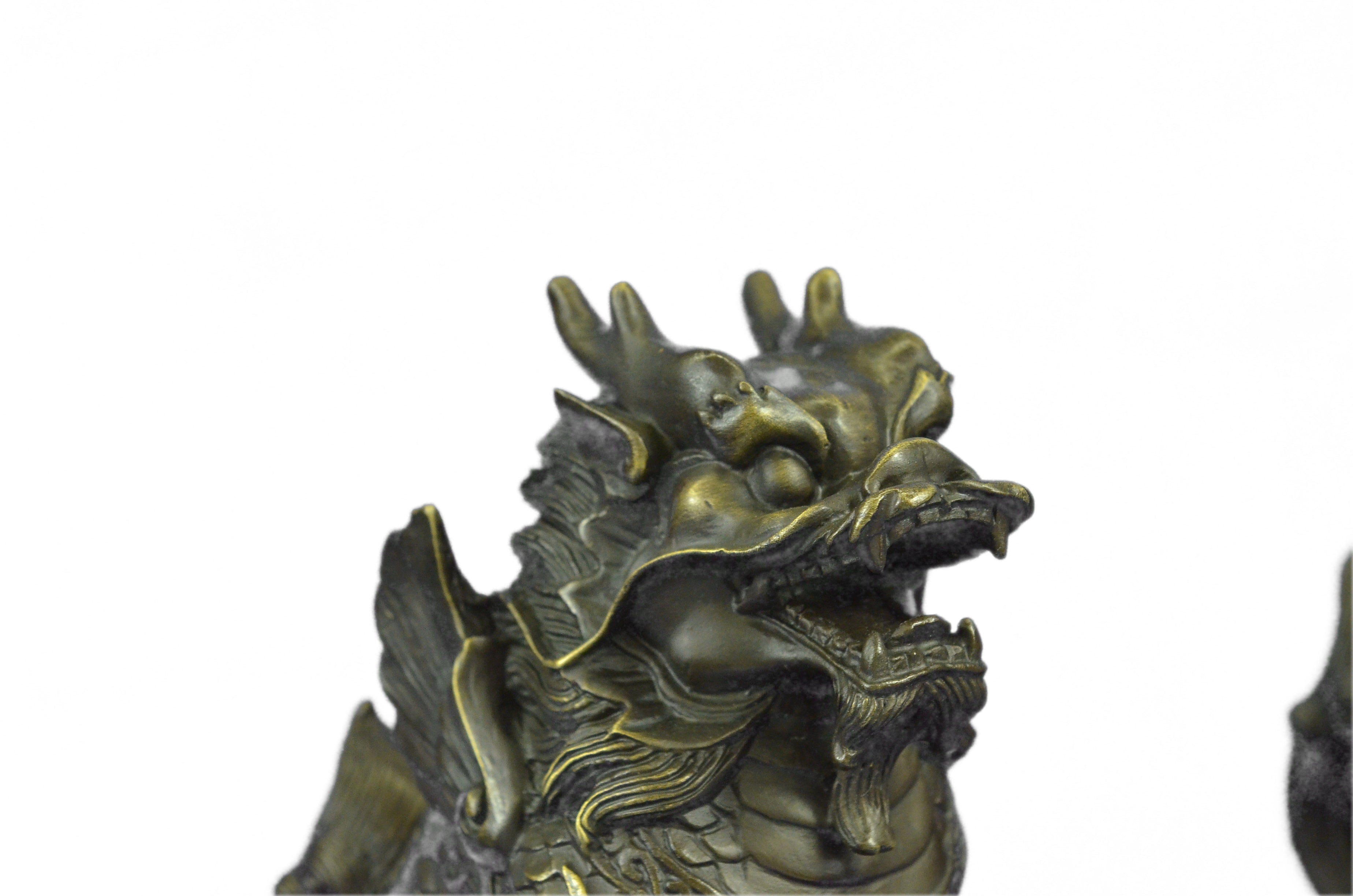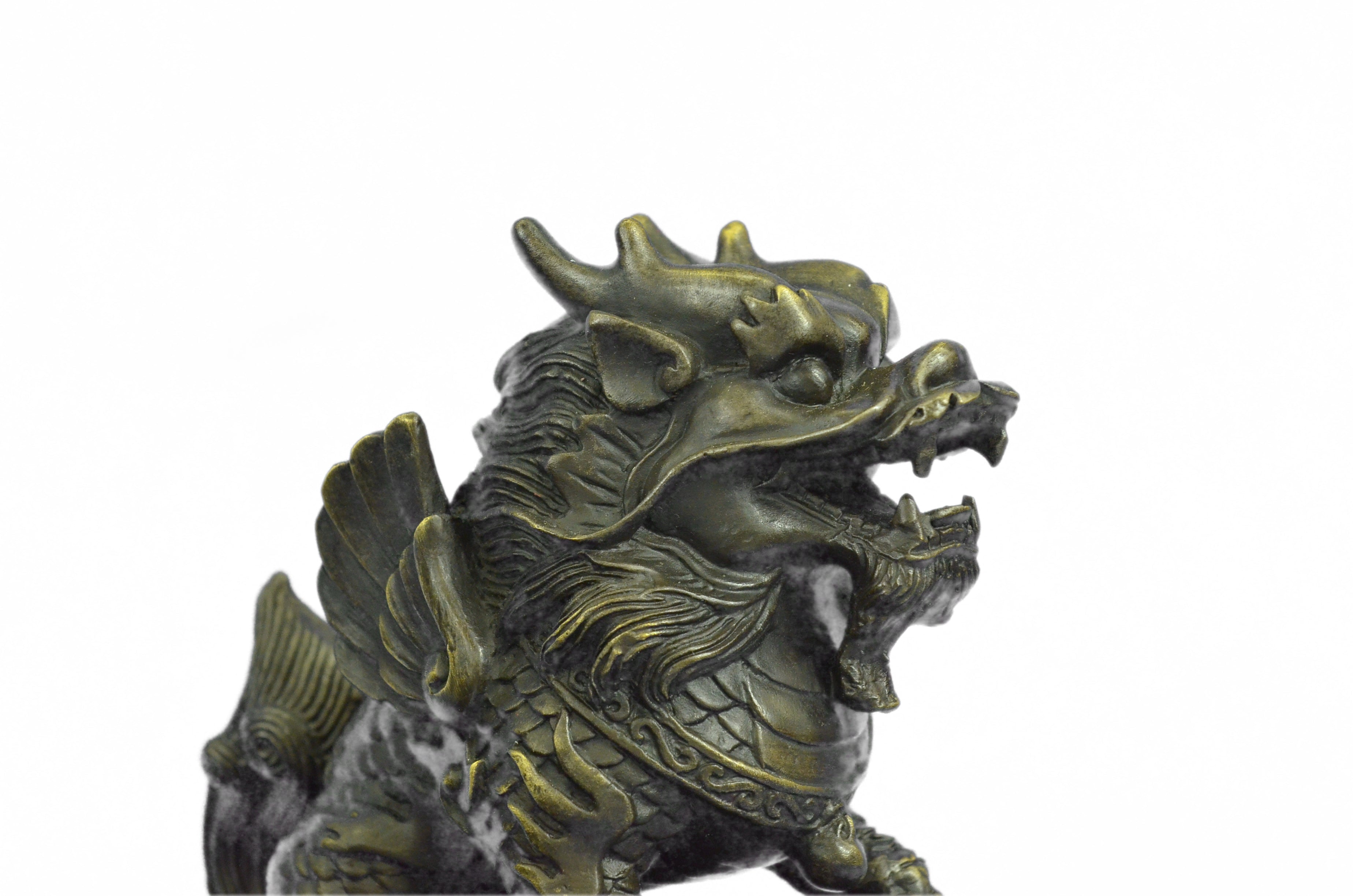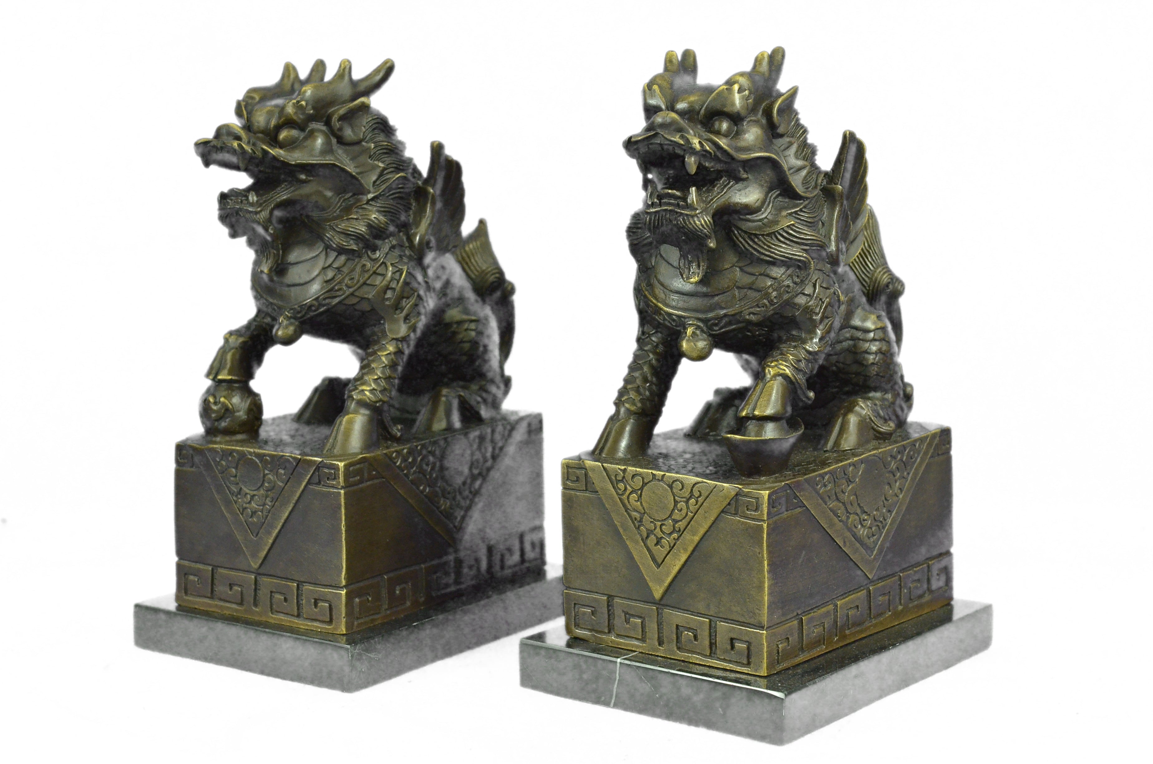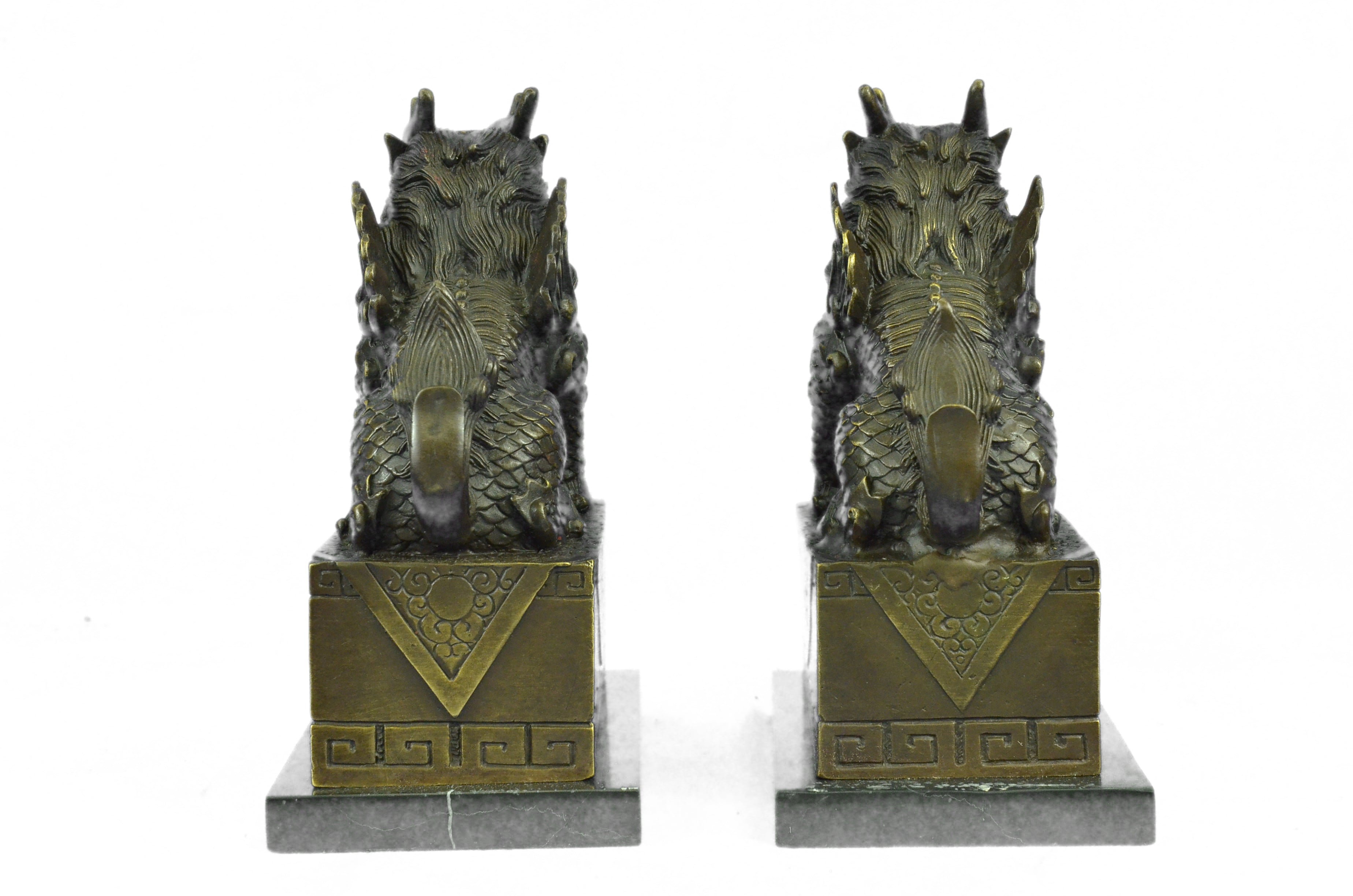 This is a bronze sculpture of a "Foo Dog" which are Chinese guardian lions, known also as Imperial guardian lions. They are believed to have powerful mystic protective powers and traditionally stood in front of Chinese Imperial palaces, Imperial tombs, government offices, temples, and the homes of government officials and the wealthy from the Han Dynasty (206 BC-AD 220). Pairs of guardian lions, a manifestation of yin and yang ( the female representing yin and the male yang), are still common decorative and symbolic elements at the entrances to restaurants, hotels, supermarkets and other structures, with one sitting on each side of the entrance. This handmade bronze sculpture was cast using the ancient method of lost-wax casting and stained with a brown patina finish for preservation. It is mounted upon a black variegated marble baseEach Bronze Dimensions with Marble Base:Height 10" x Width 6.5"
