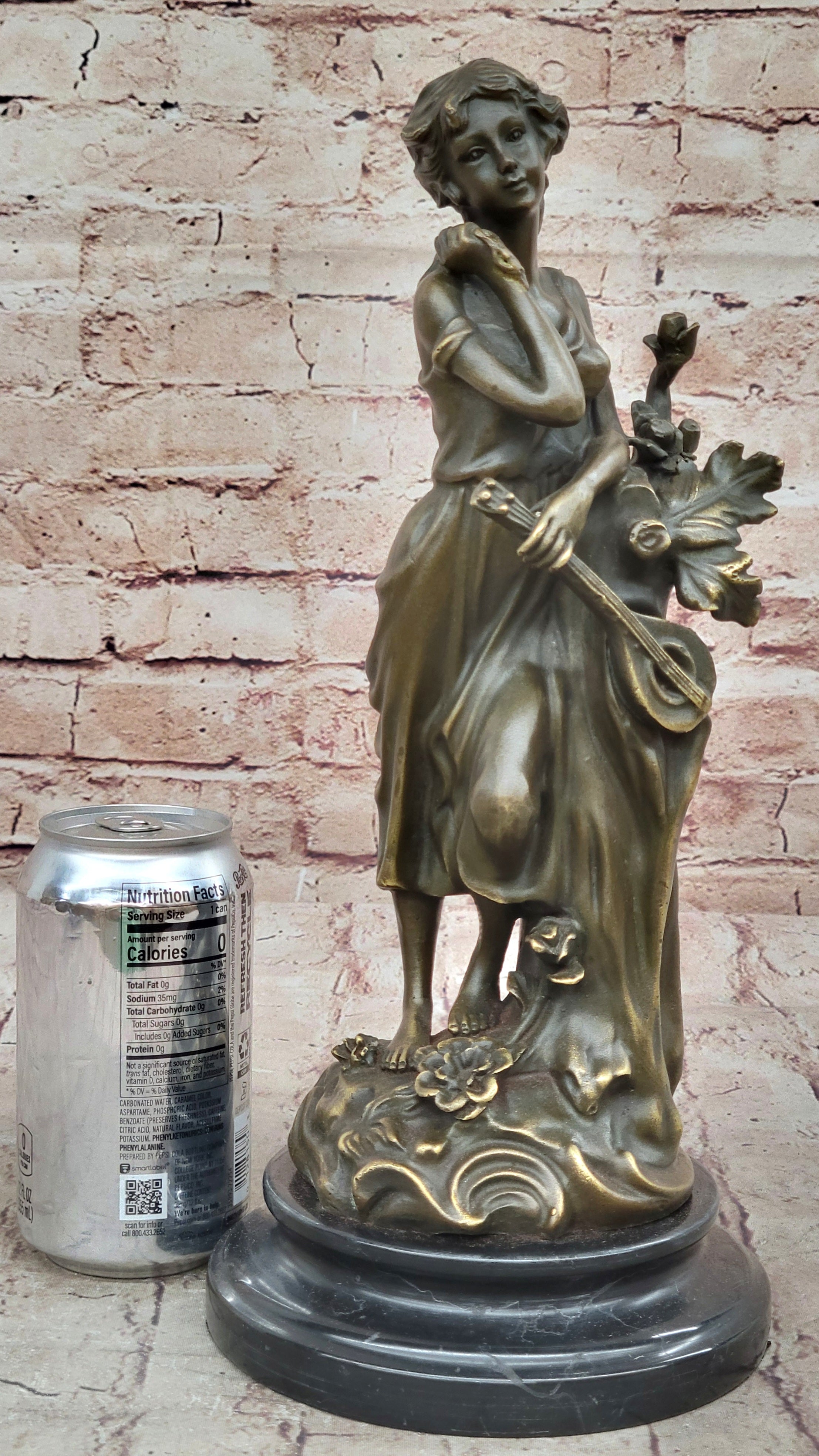 The woman is elegantly posed, fully immersed in her performance, capturing the essence of artistic expression and passion for music. Set upon a round black marble base, this sculpture adds a touch of sophistication to any setting, making it a perfect decorative piece for music lovers and art enthusiasts alike.