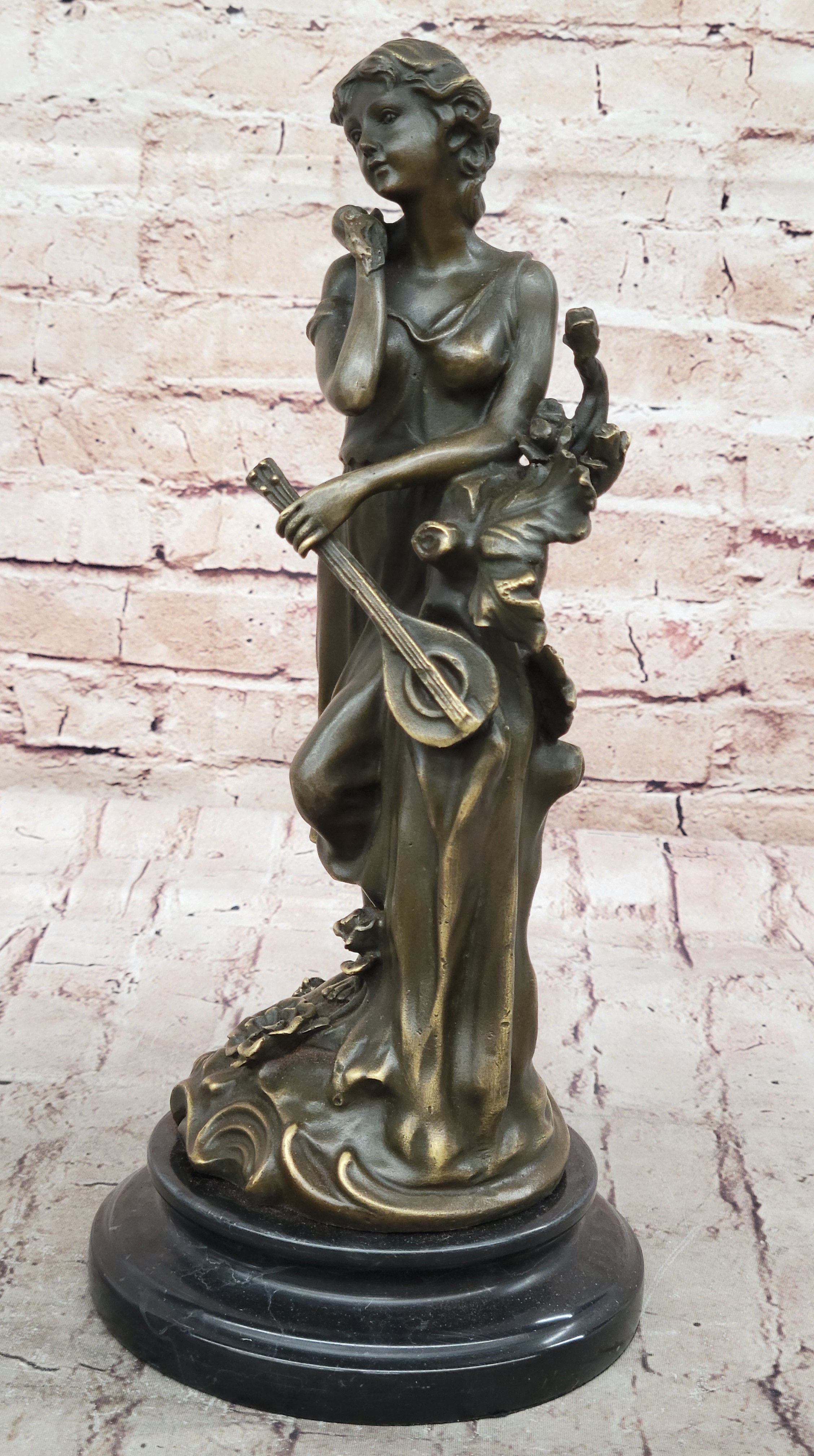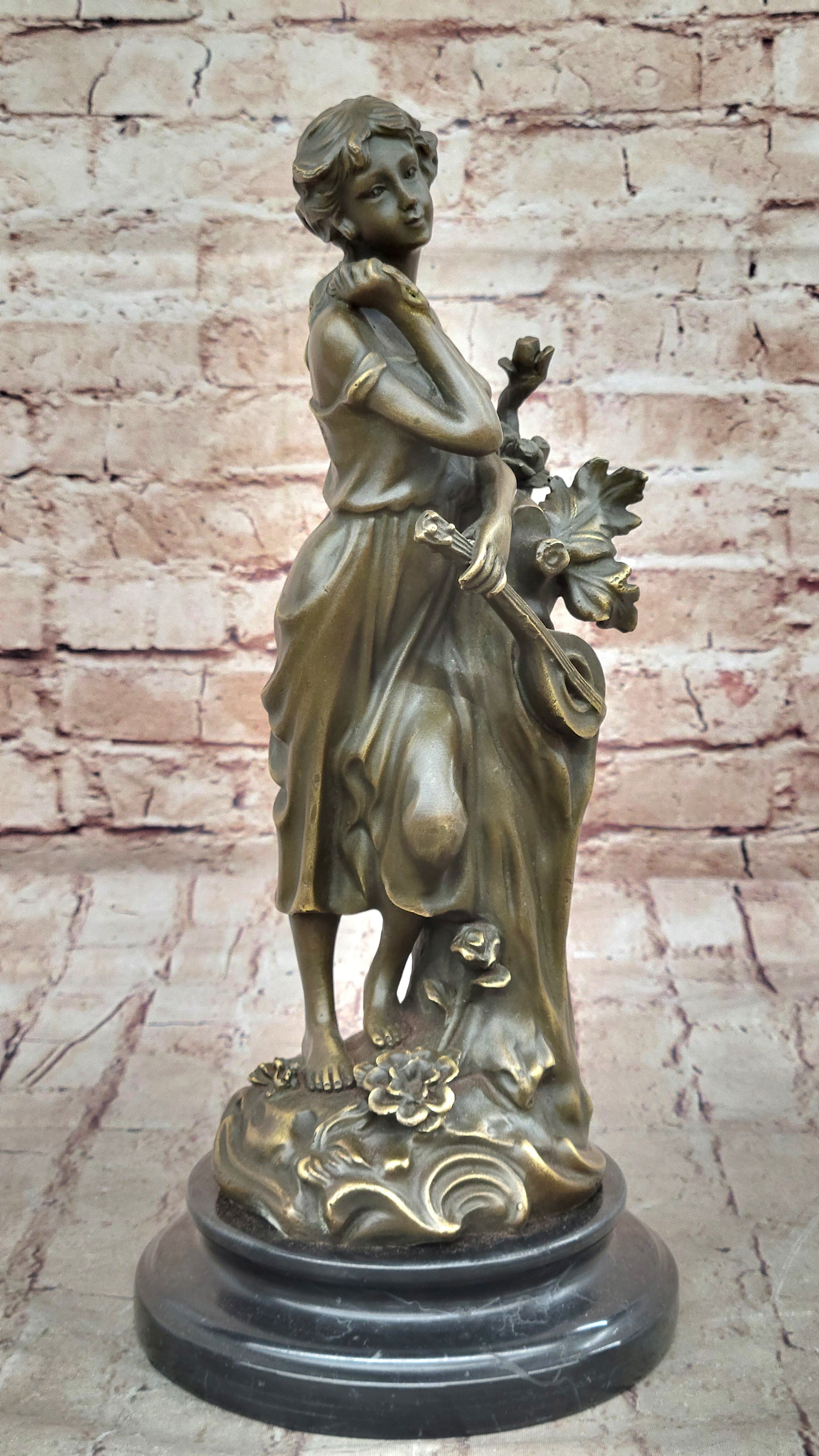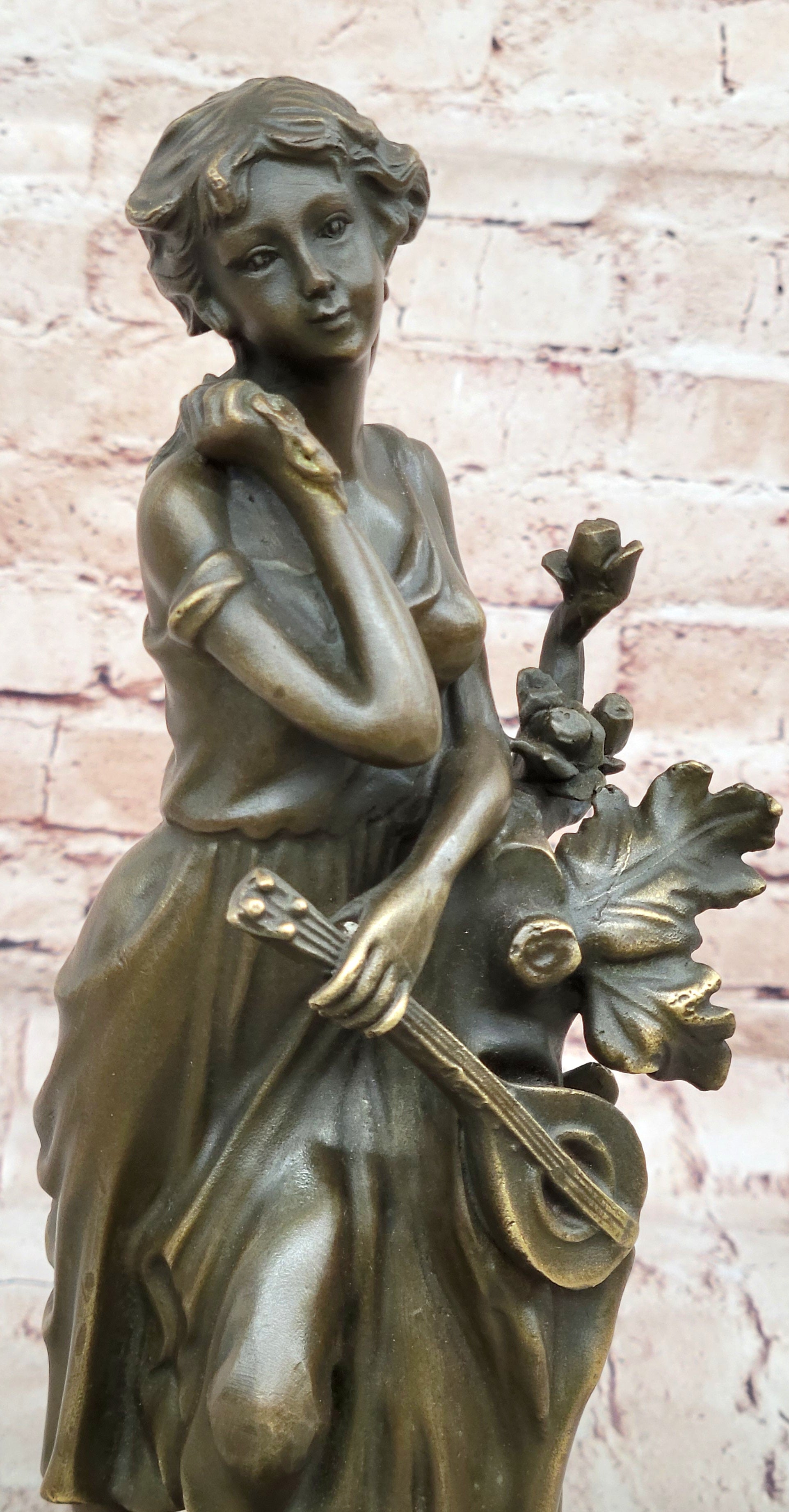 Classical Young Woman Holding Banjo Guitar Musical Instrument - Bronze Sculpture by Milo