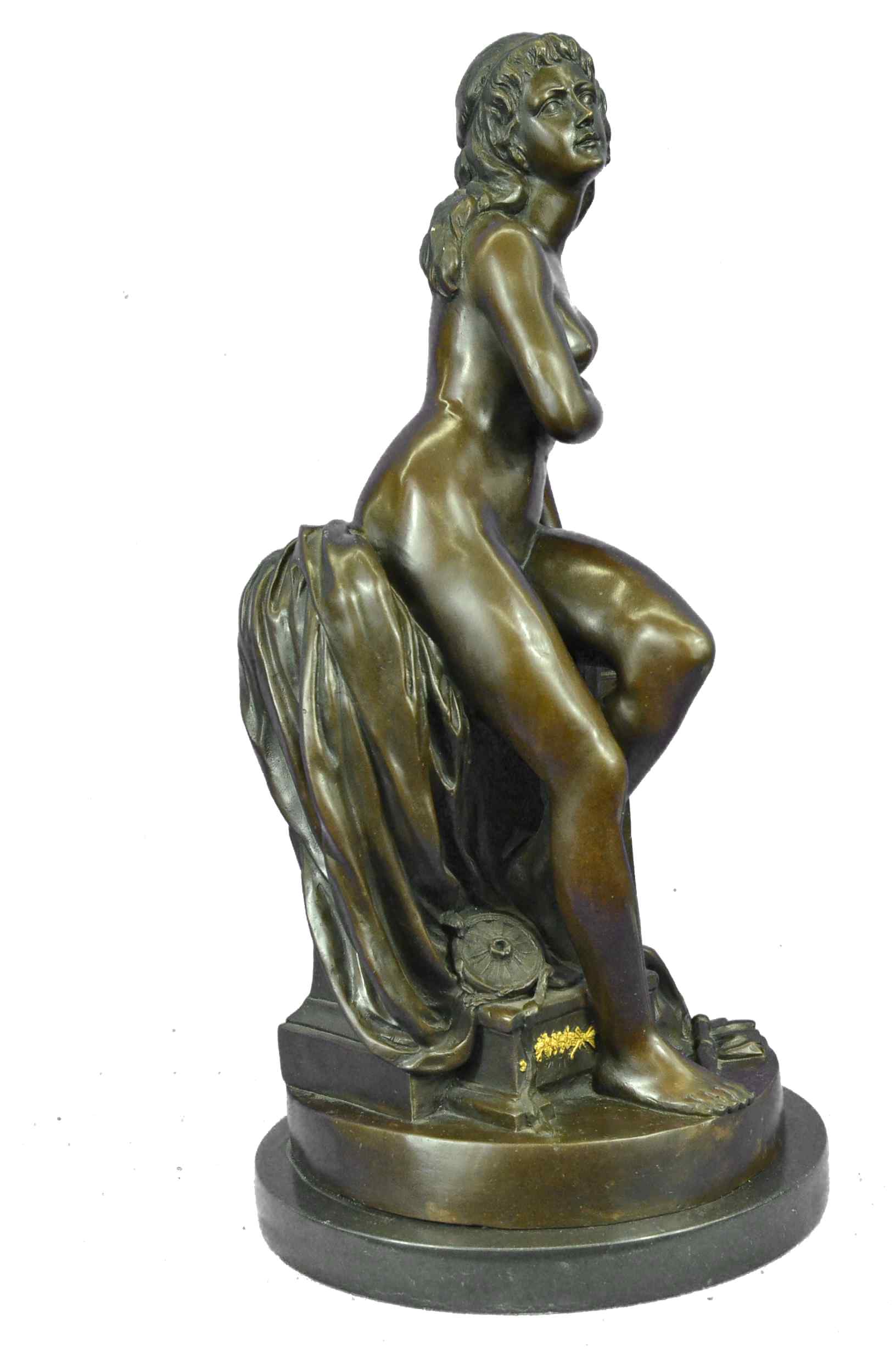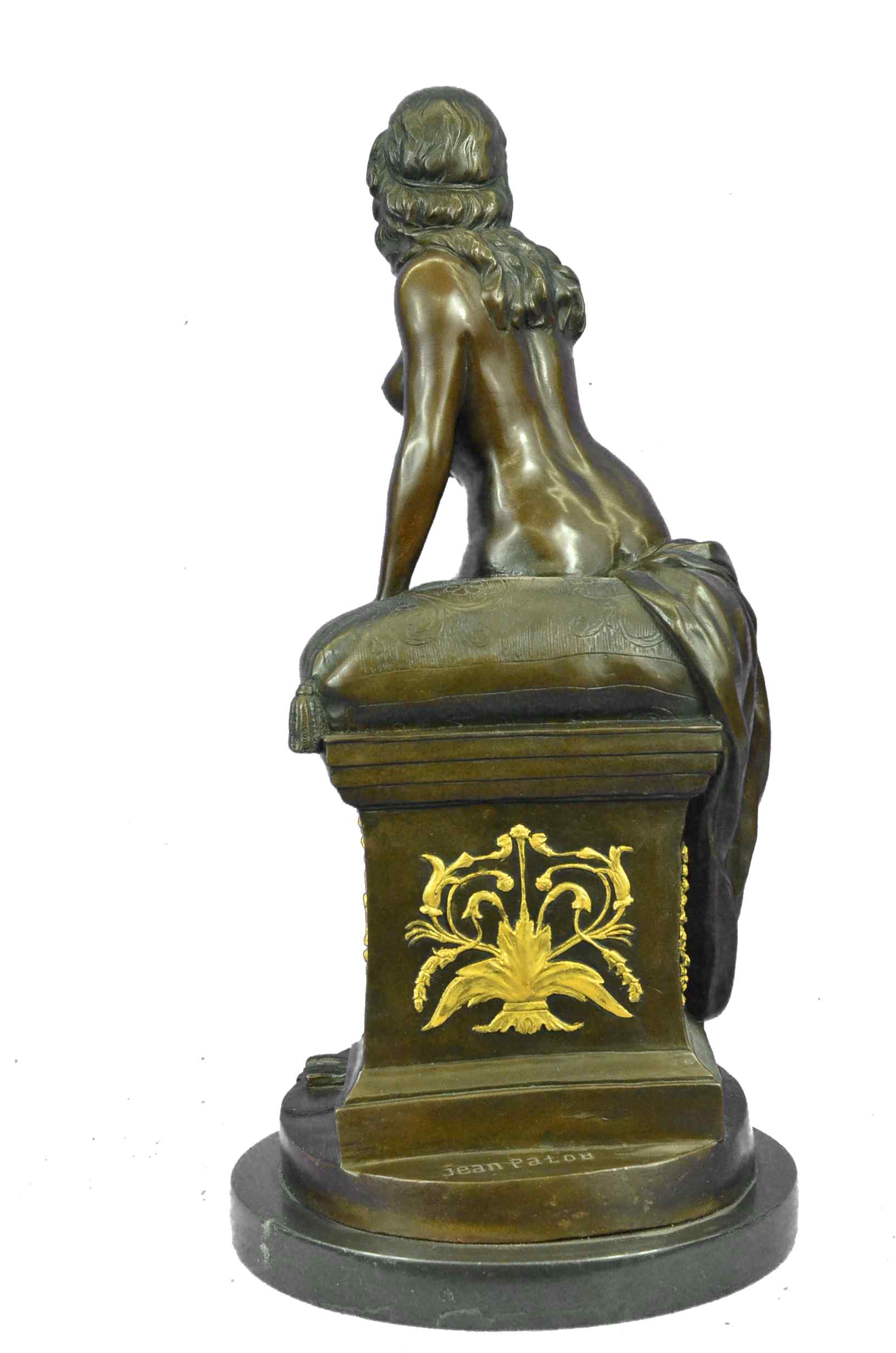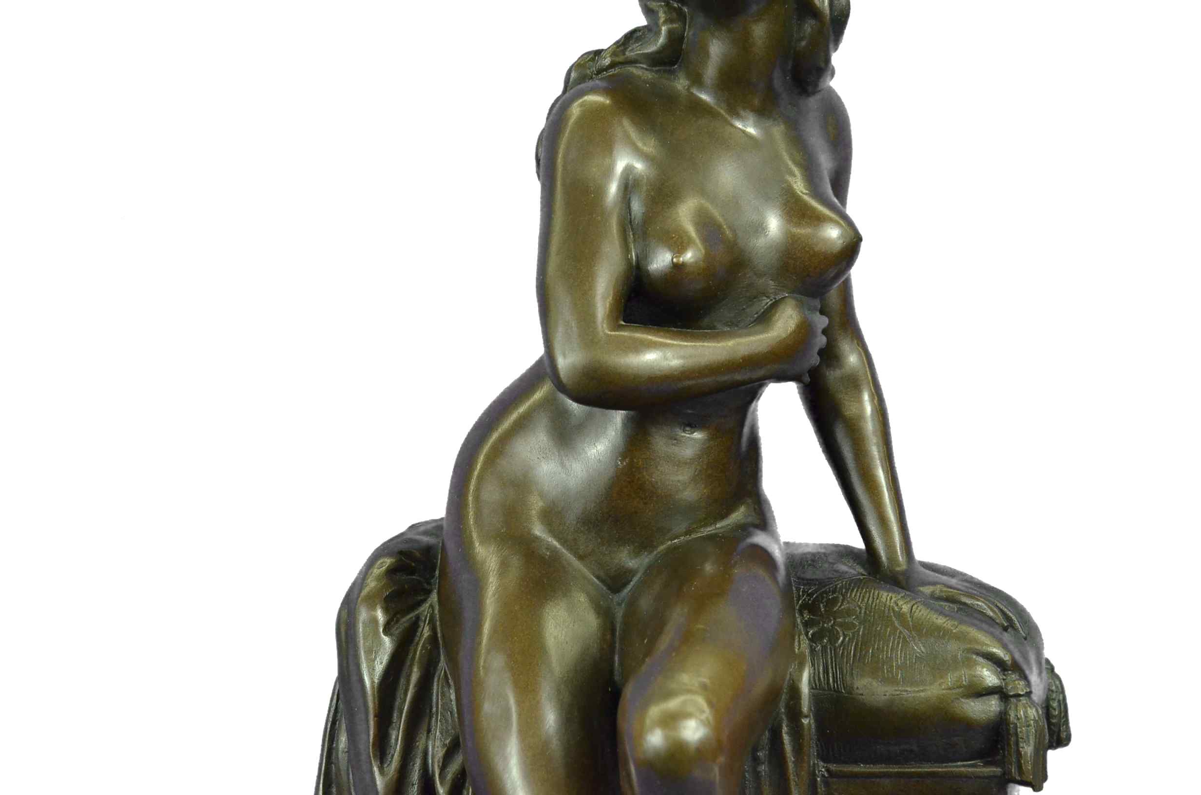 She is an artist's muse. She poses for a painting, sitting on the edge of a shut chest.She sits on a plump pillow and thin sheet that is draped over the side of the chest. She tucks her arm beneath her exposed breasts, grazing her fingertips along her skin. 100% bronze and handmade, this brown patina sculpture was cast using the "Lost Wax Method" and mounted on a marble base. It features the signature Jean Patou.Bronze Dimensions with Marble Base:Height 20" x Width 10"