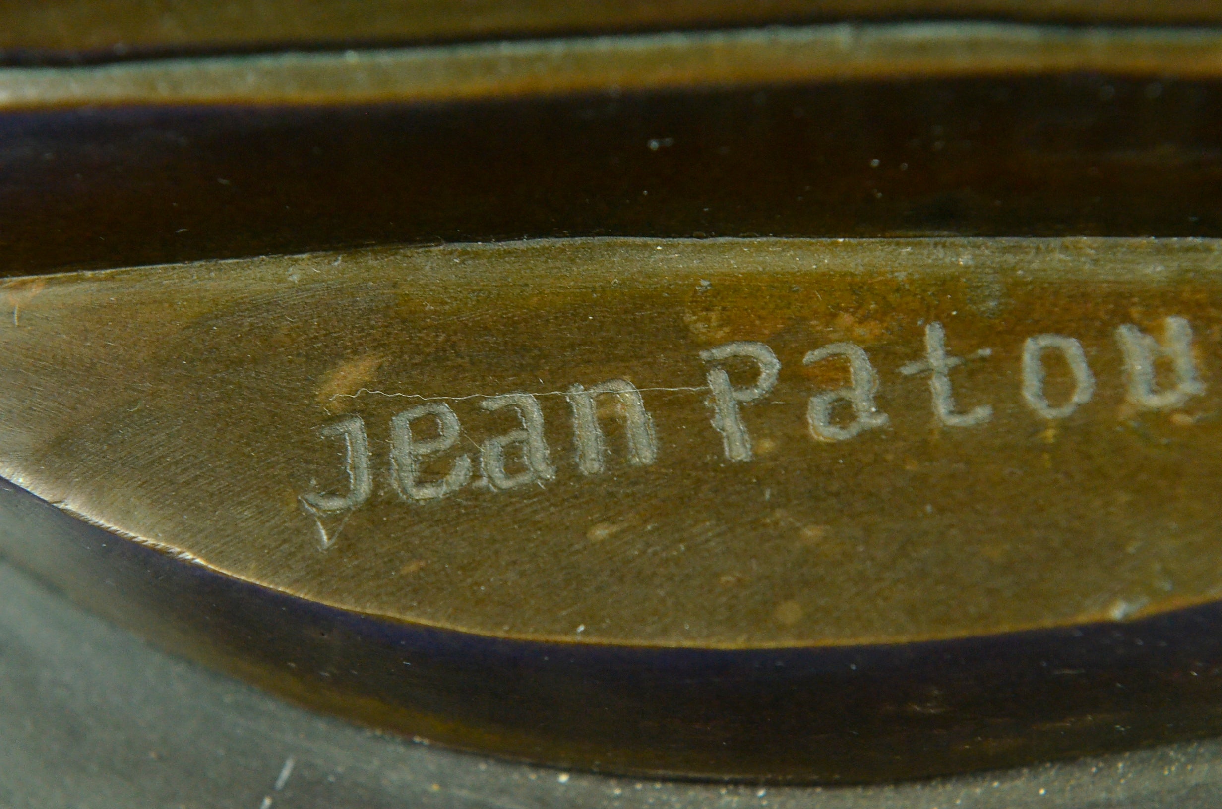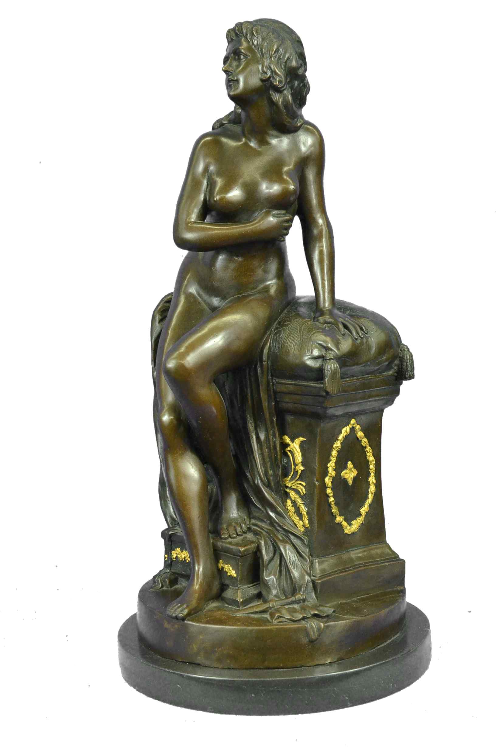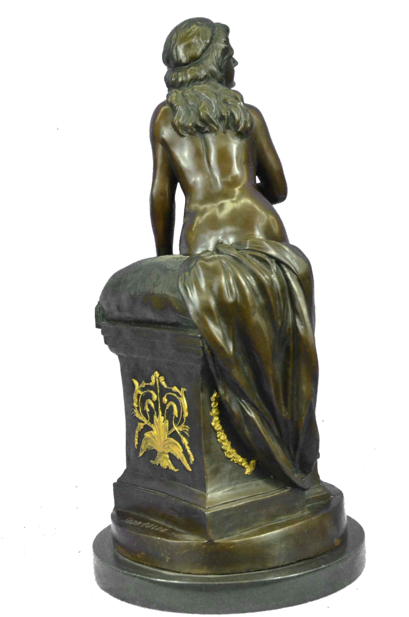 She is an artist's muse. She poses for a painting, sitting on the edge of a shut chest.She sits on a plump pillow and thin sheet that is draped over the side of the chest. She tucks her arm beneath her exposed breasts, grazing her fingertips along her skin. 100% bronze and handmade, this brown patina sculpture was cast using the "Lost Wax Method" and mounted on a marble base. It features the signature Jean Patou.Bronze Dimensions with Marble Base:Height 20" x Width 10"