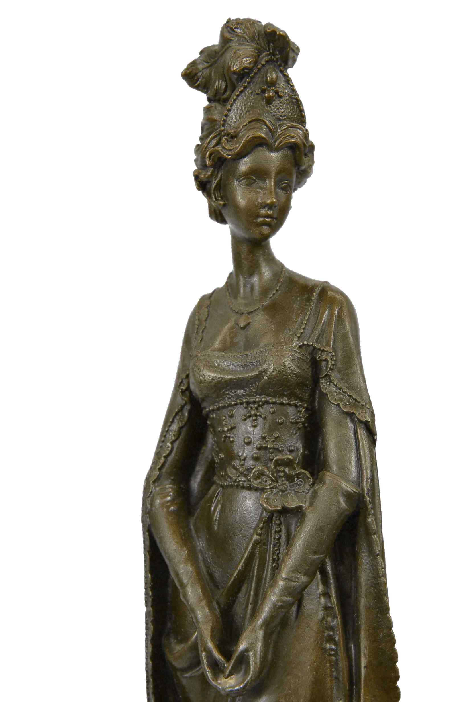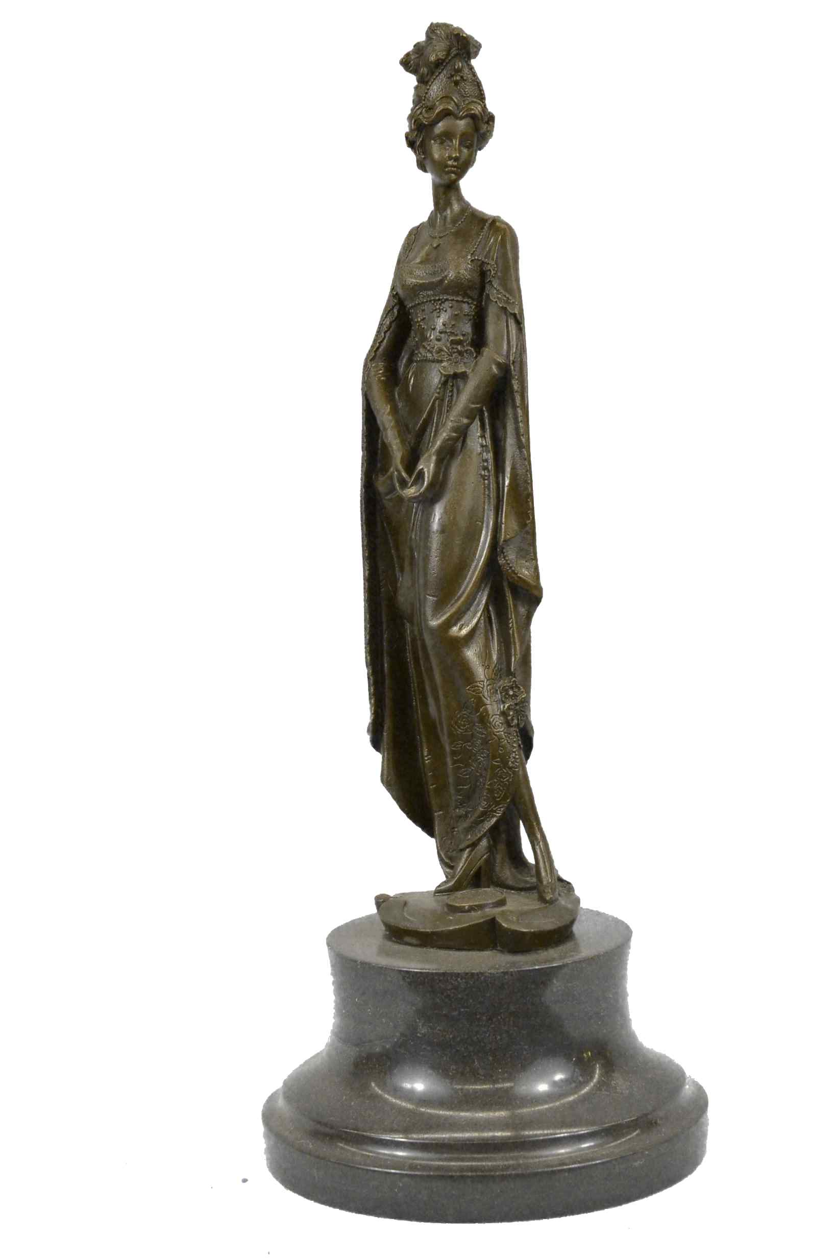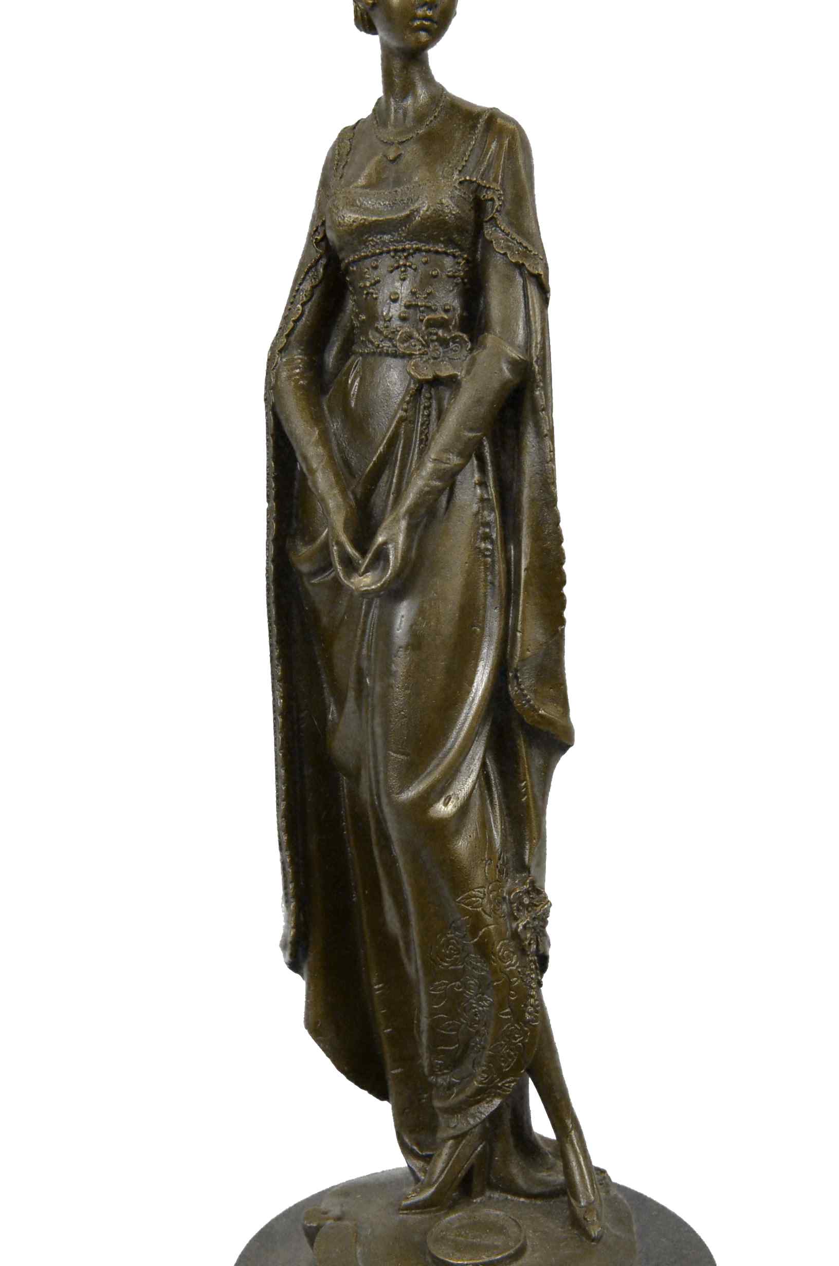 The high society lady is poised and elegant dressed head-to-toe in elaborate garments. The top of her dress in embroidered with a mesh like top and decorated with a large flower. A beautiful cape extends from her back to the ground. She stands looking to the side calmly. This regal and fancy sculpture was crafted using the lost wax method. It rests on a large black marble base. It is signed Dino Decarlo.Original or Reproduction: Reproduction