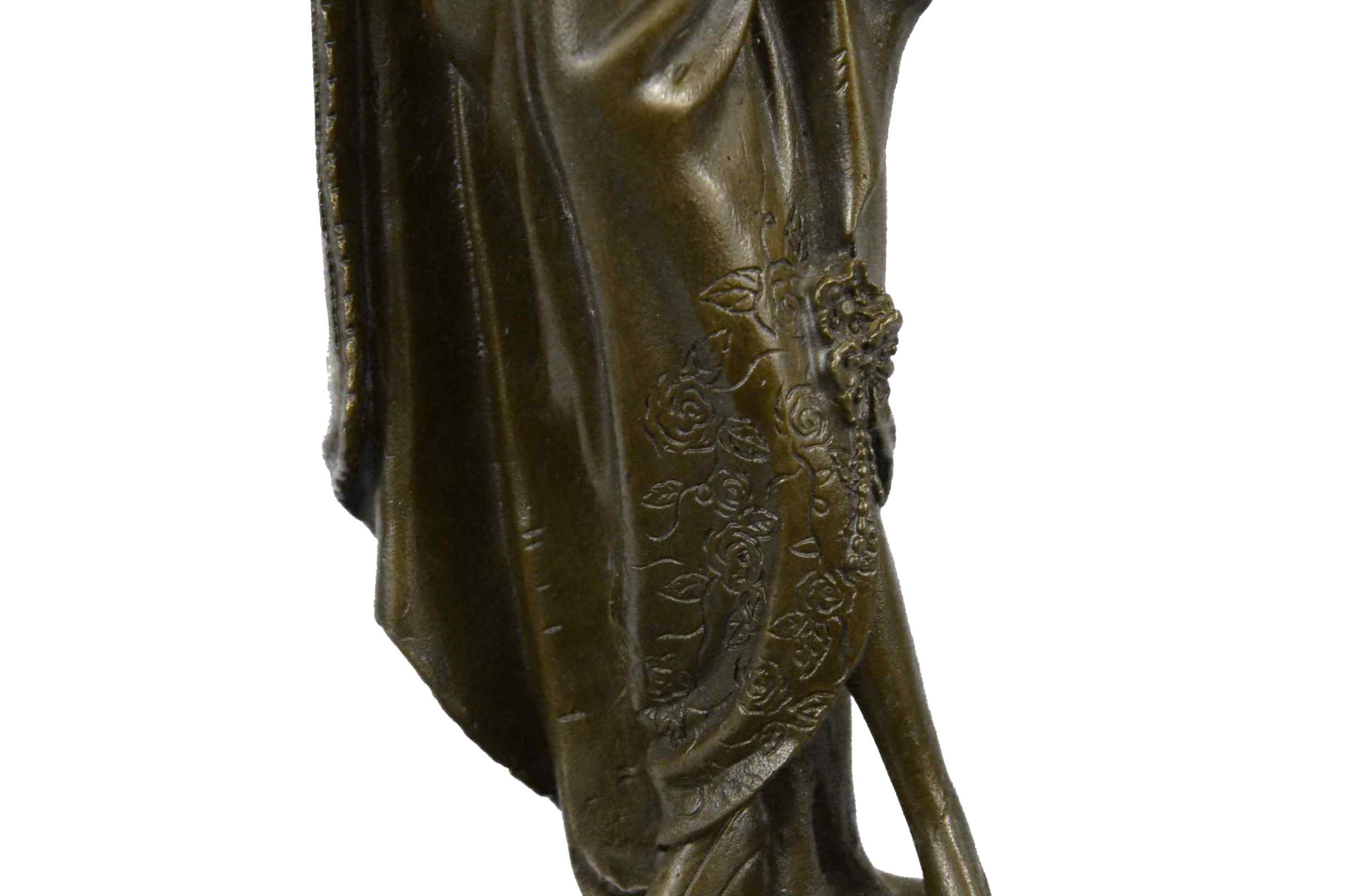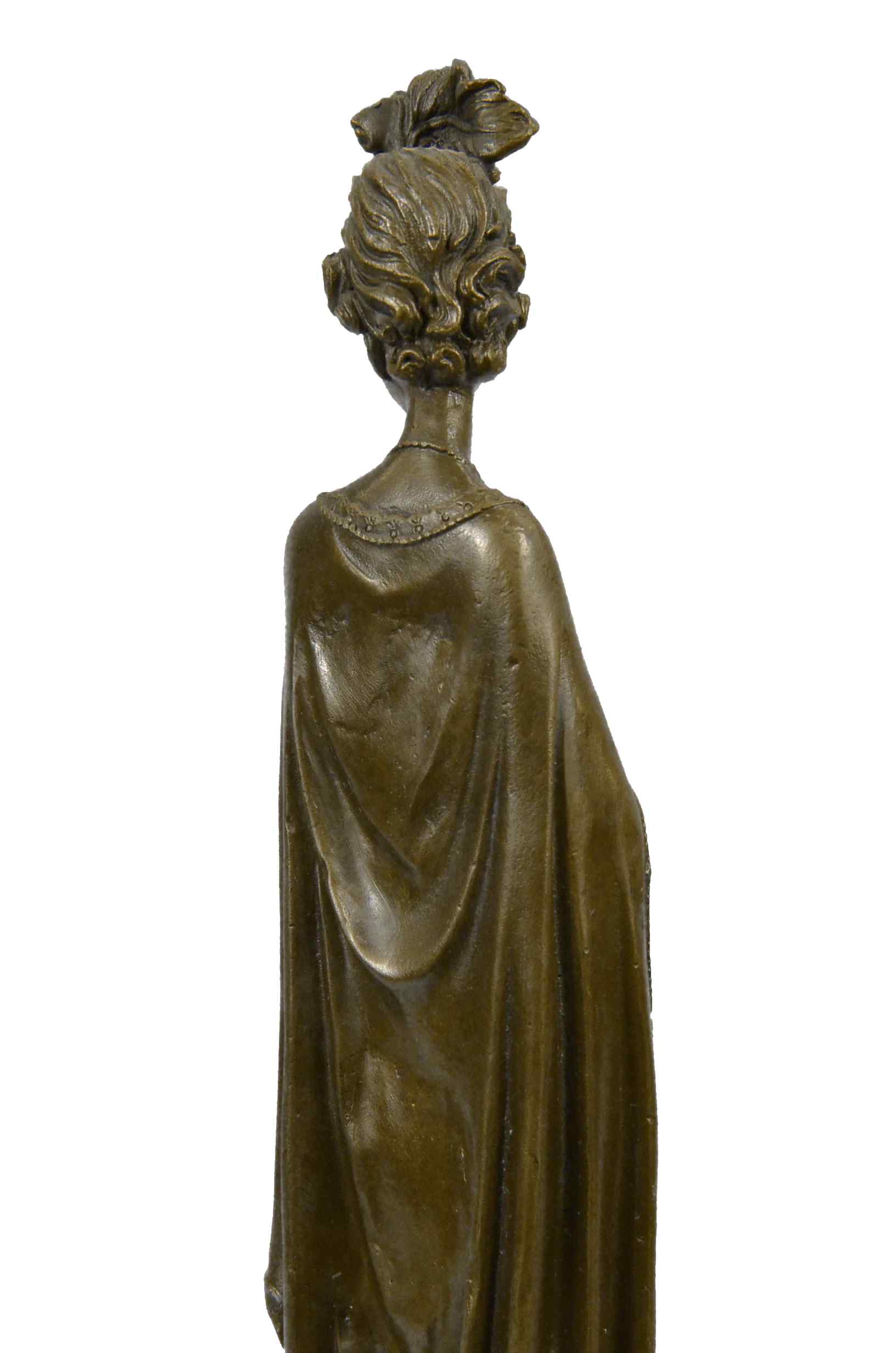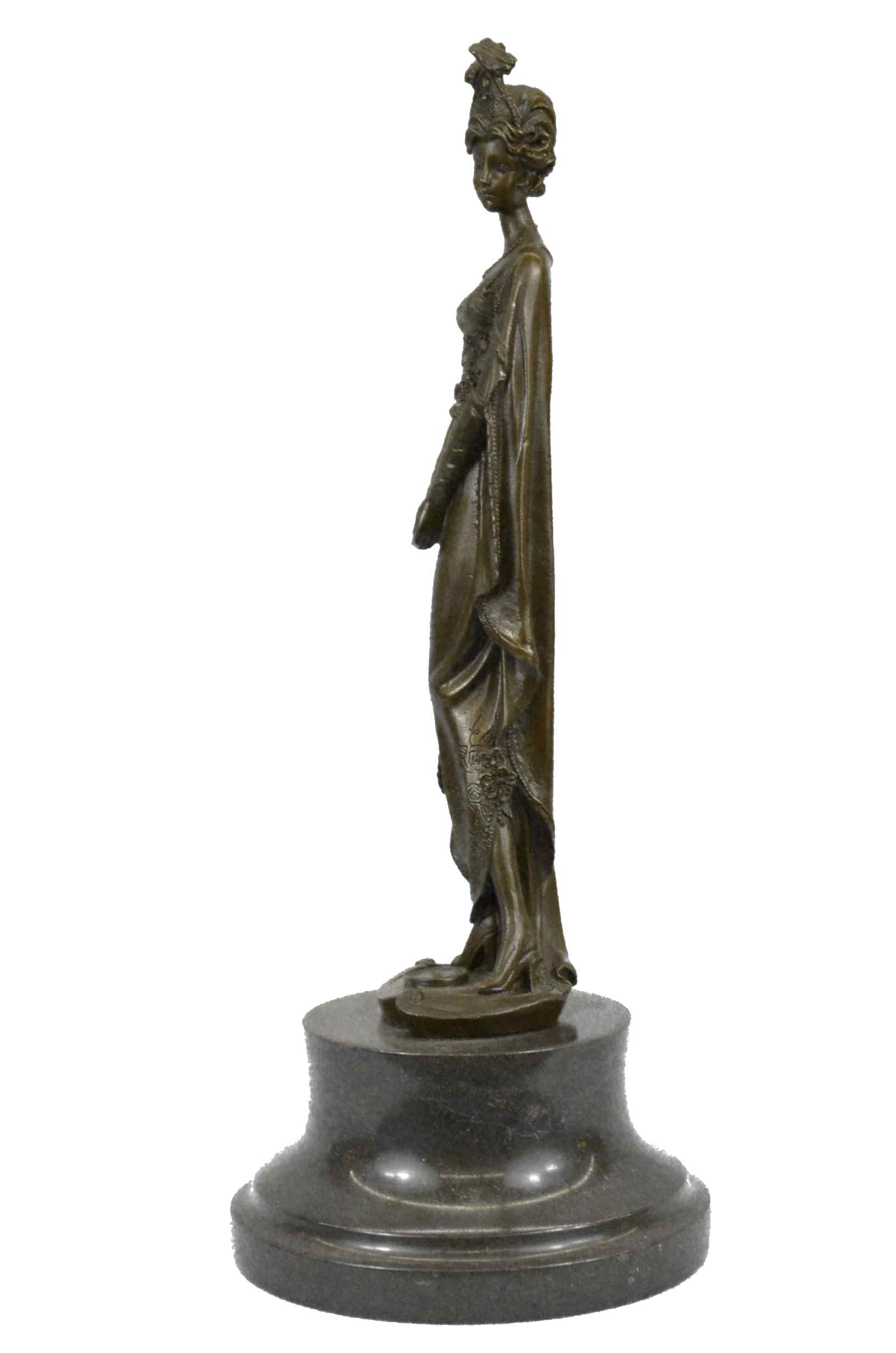 The high society lady is poised and elegant dressed head-to-toe in elaborate garments. The top of her dress in embroidered with a mesh like top and decorated with a large flower. A beautiful cape extends from her back to the ground. She stands looking to the side calmly. This regal and fancy sculpture was crafted using the lost wax method. It rests on a large black marble base. It is signed Dino Decarlo.Original or Reproduction: Reproduction