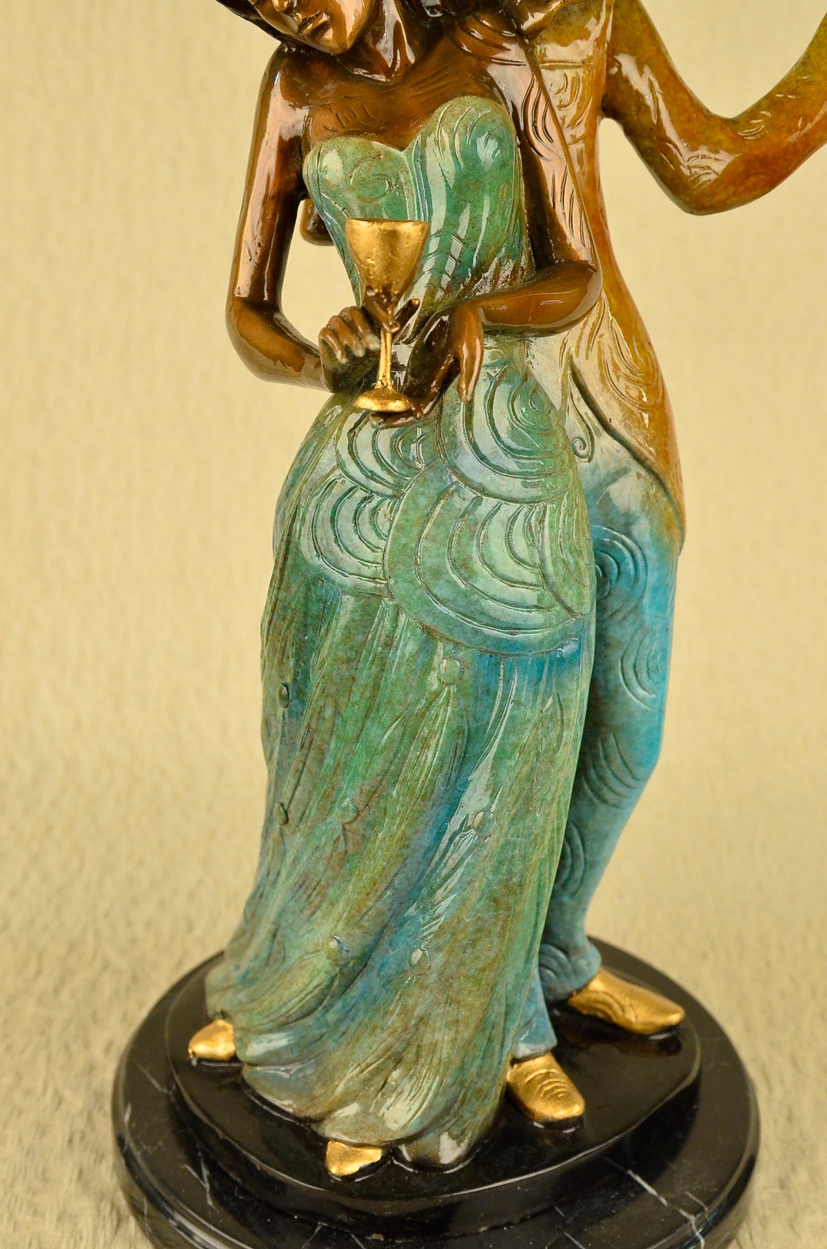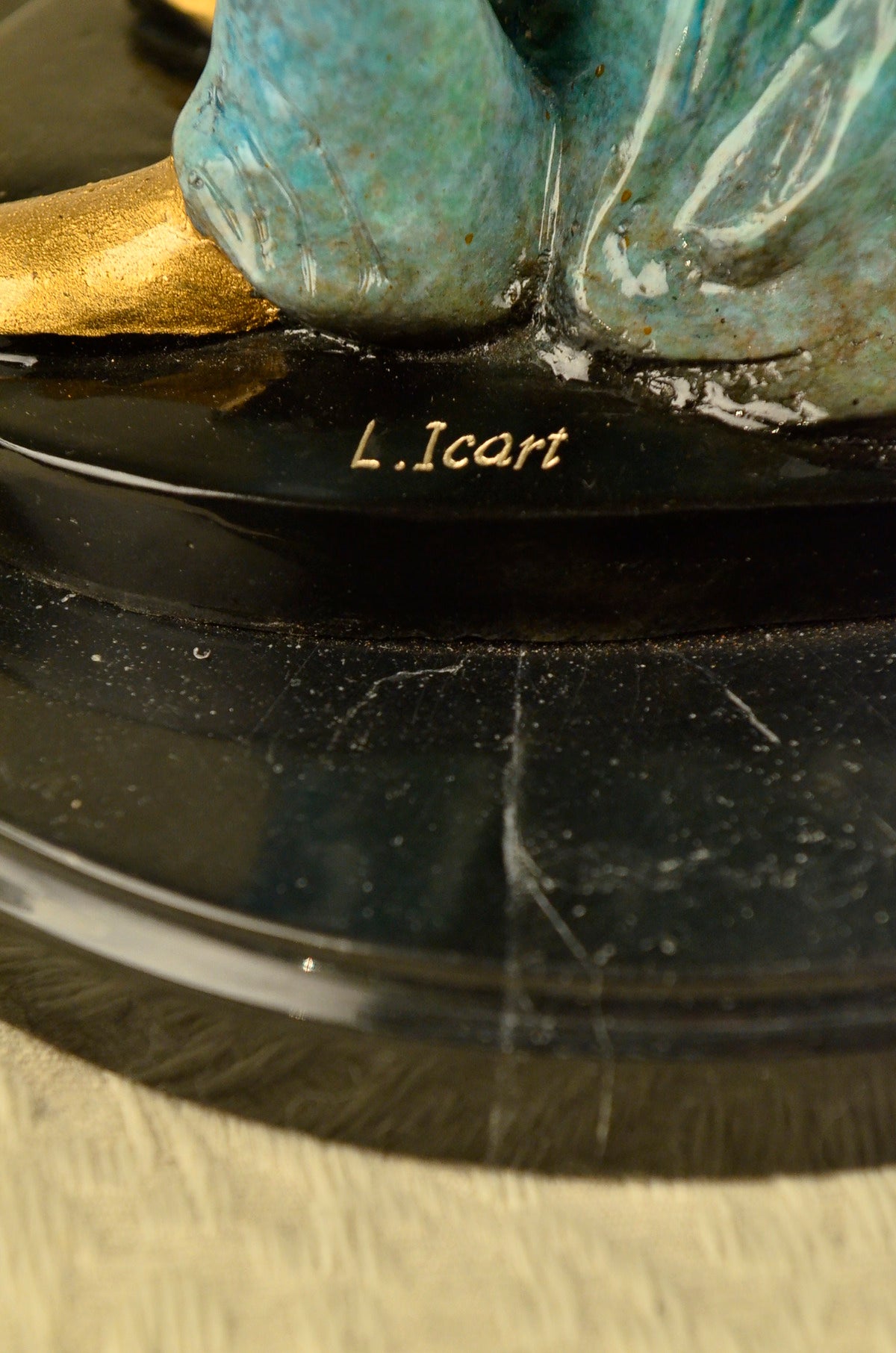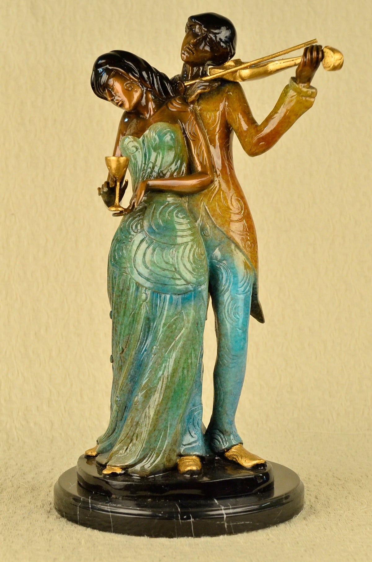Presenting an hot cast multi color patina sculpture depicting a romantic couple. The woman is being serenaded by a man playing the violin. She seems bored as she is holding a cup of vine. I would grade this museum quality casting.The sculpture stands on a black marble base. It signed by the arts L. Icart. The lost wax method was used to create this sculpture.Original or Reproduction: Reproduction