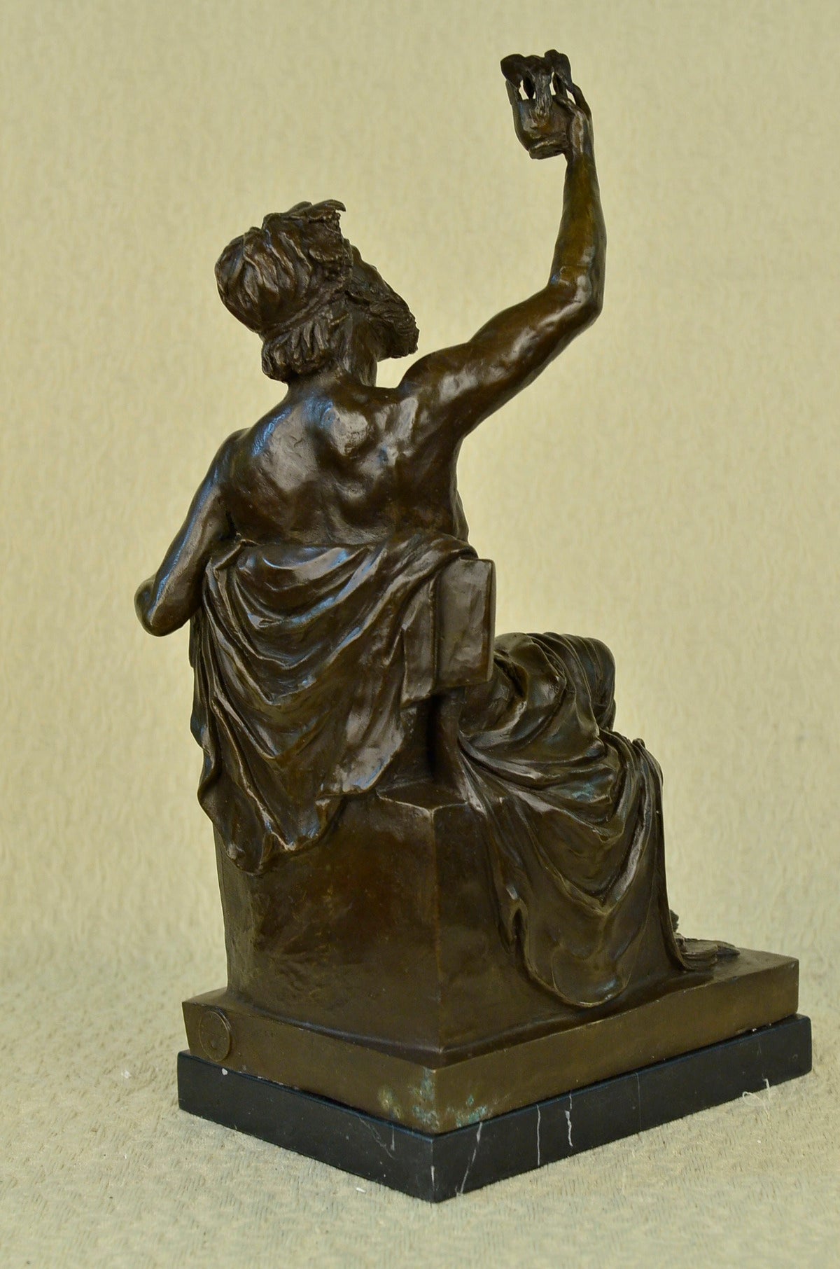 A ancient Greco-Roman musician sits on a grand chair gazing at his muse. The object is in held in hand high in the air, he is gazing with wonder and fascination. His robes are draped across his lap making his bare masculine chest visible. A lyre, his instrument, rests at his side waiting for him to play beautiful music. This sculpture was cast using the lost wax method. It is signed Valli. A black marble base supports the piece.Original or Reproduction: Reproduction