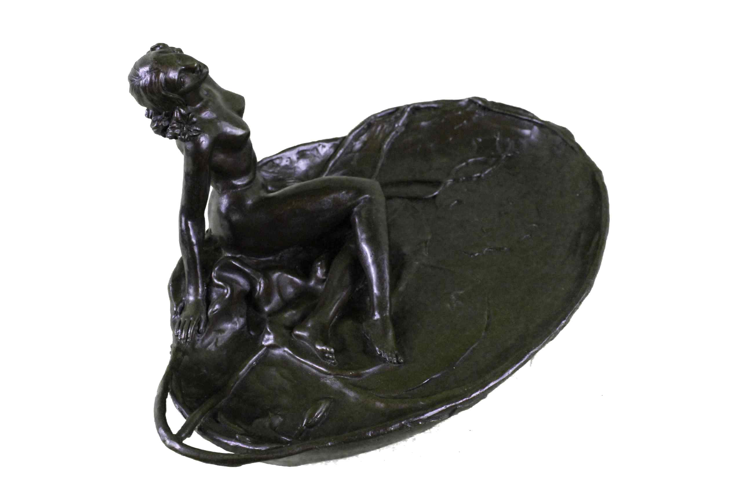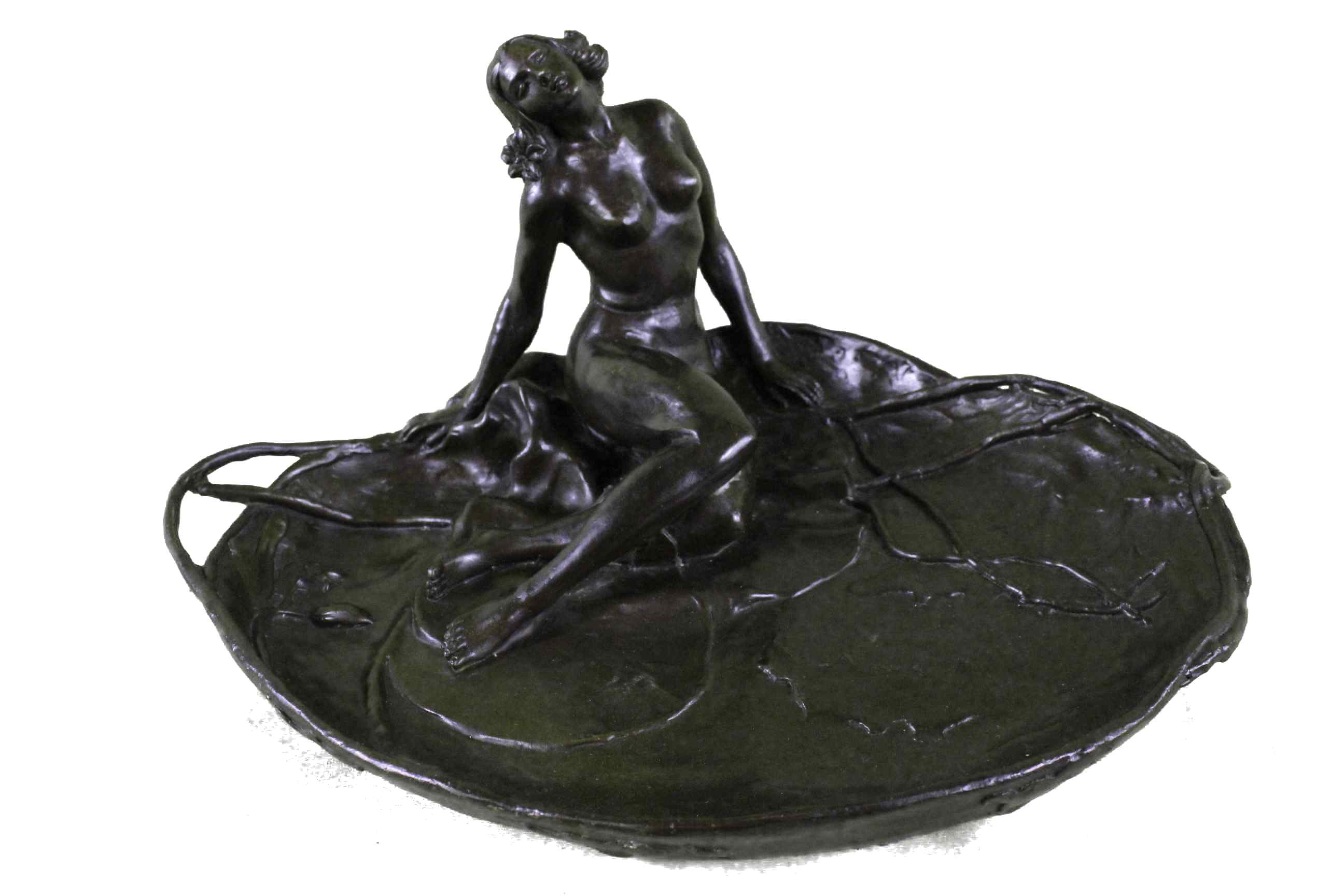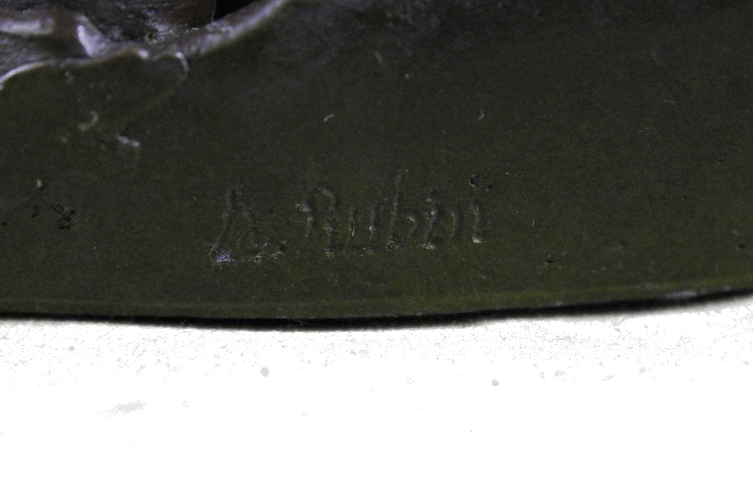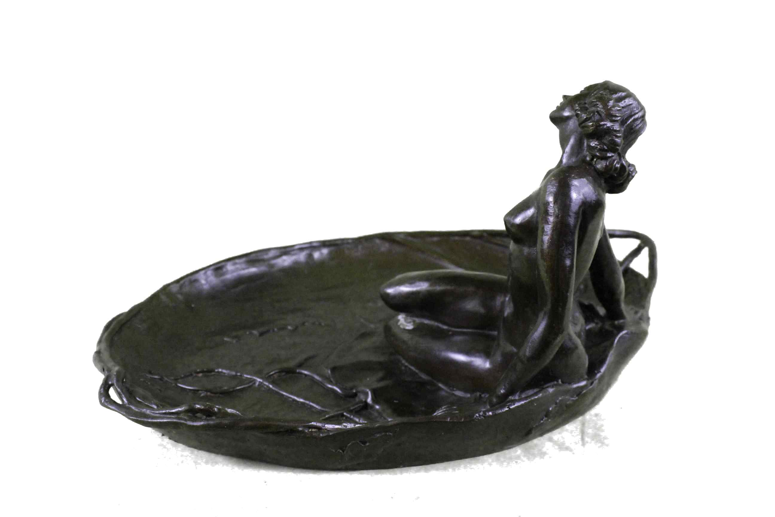 This beautiful sculpture can be used as a dish or Jewelry tray . Cast in high quality bronze, it weighs approximately 8 pounds and is 12" wide x 6" high. Anyone who knows and appreciates bronze sculpture will recognize the very special patina work on this piece; it is beautiful hand crafted real bronze signed Rubin. The two tone patina has been meticulously applied.Bronze Dimensions :Height 6" x Width 12"