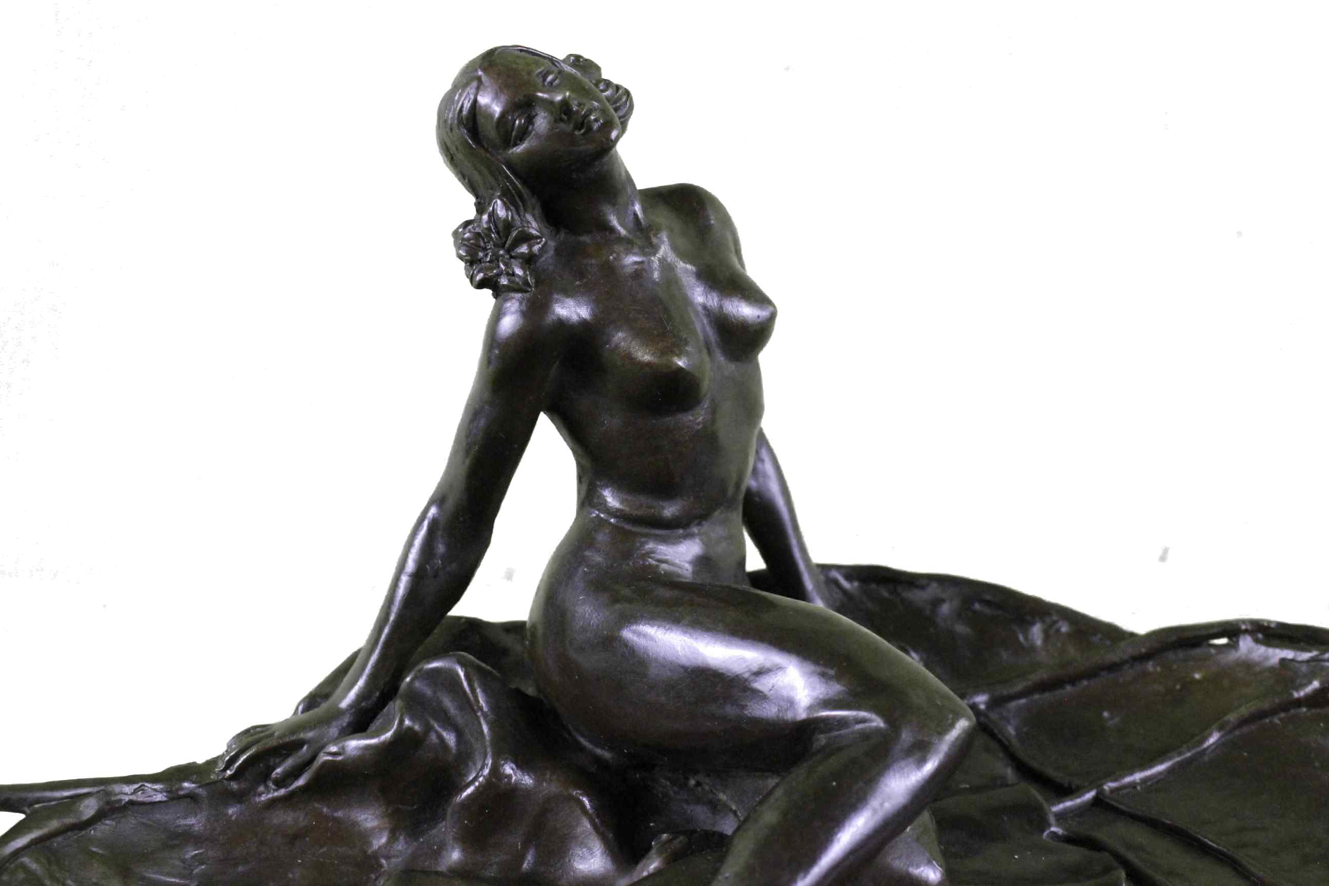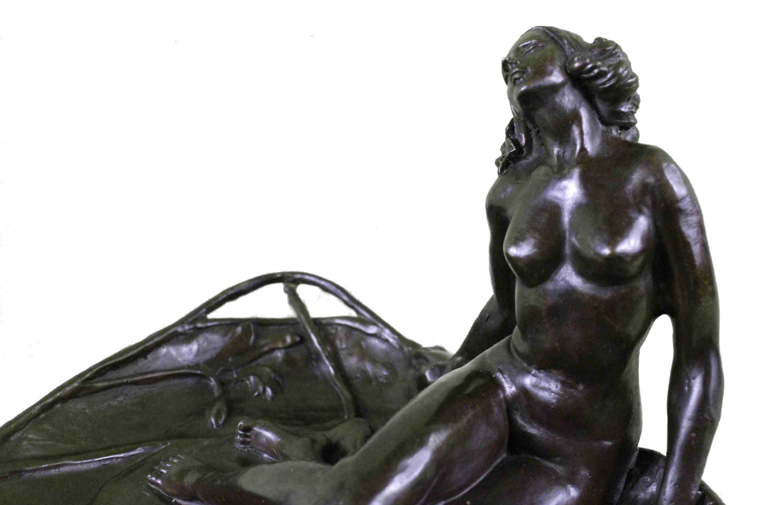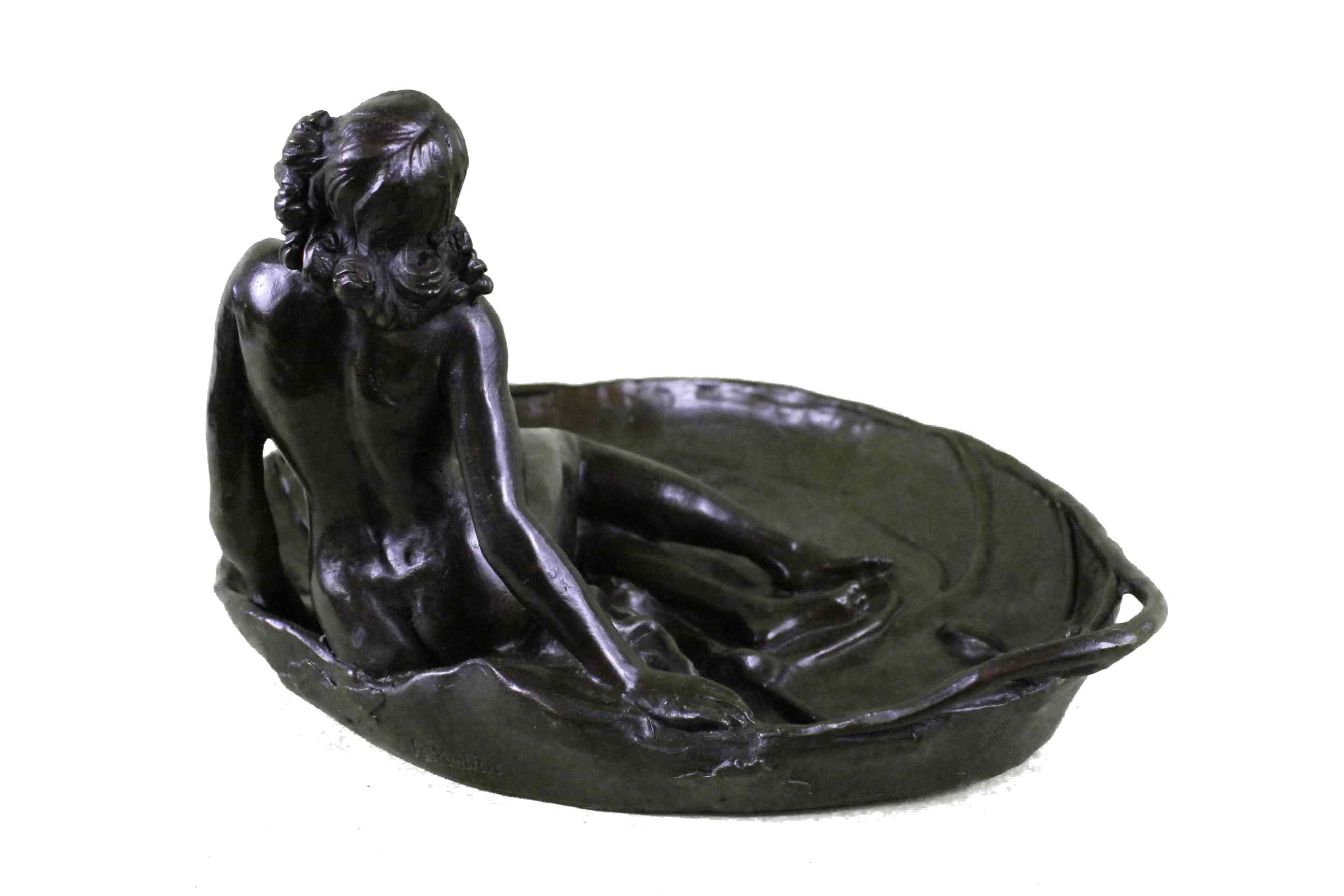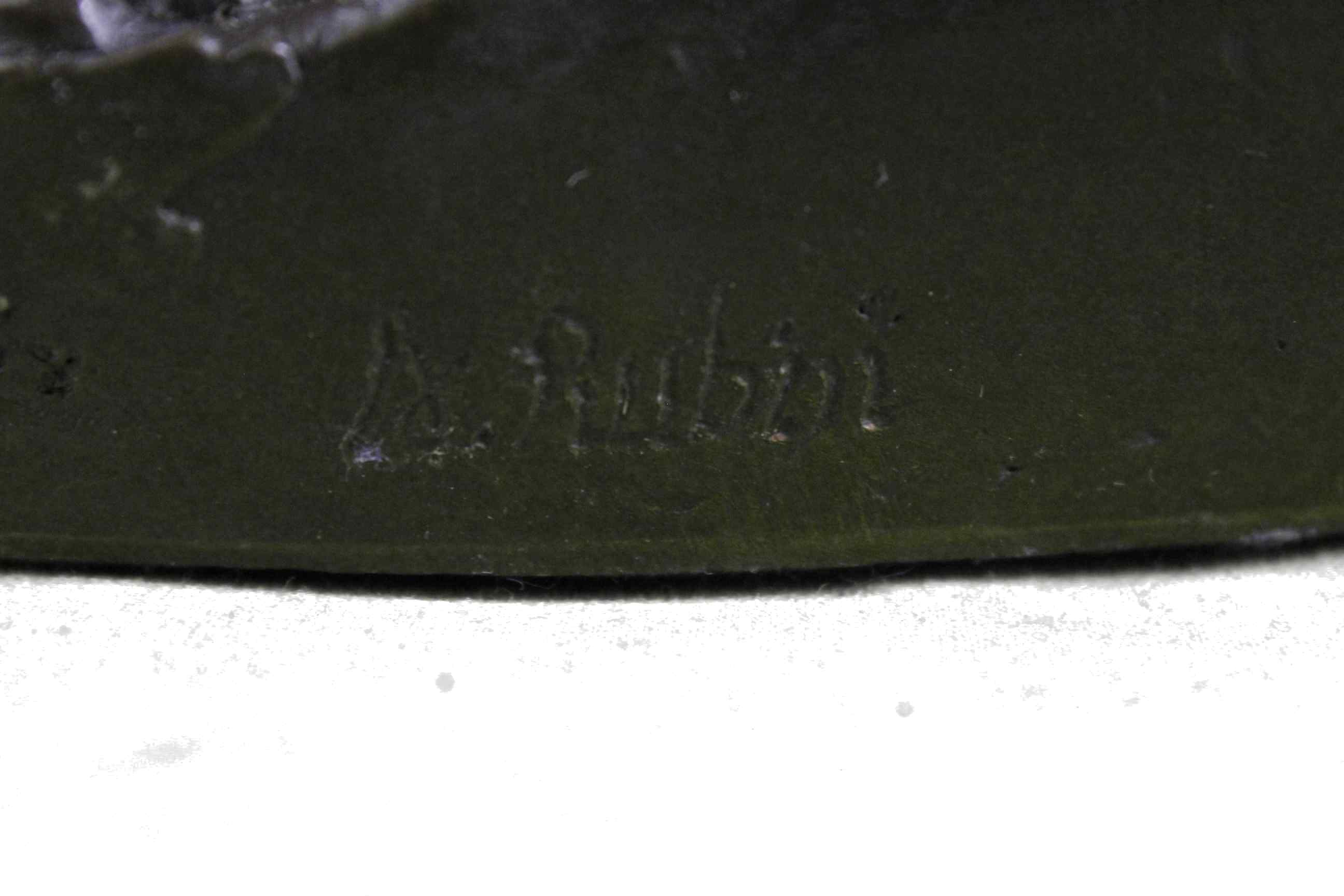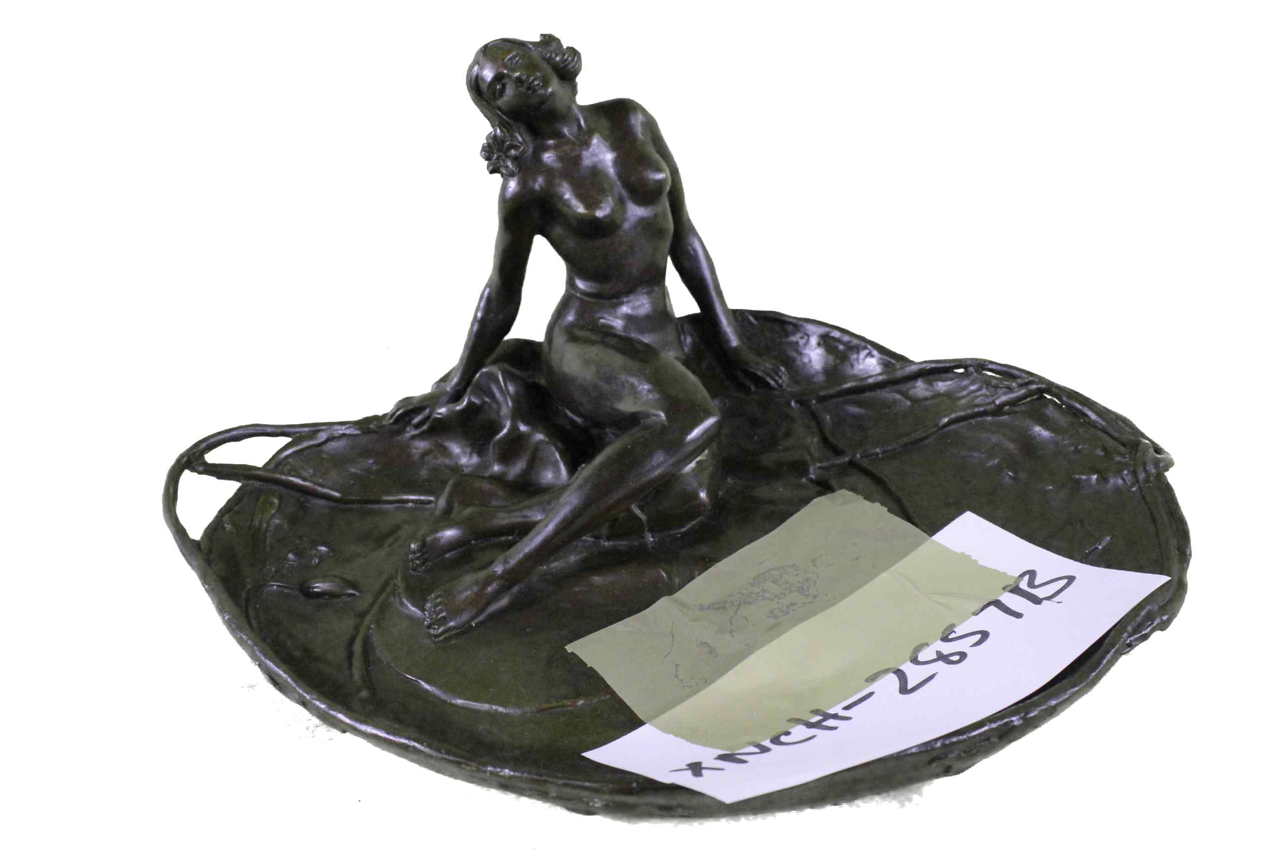 This beautiful sculpture can be used as a dish or Jewelry tray . Cast in high quality bronze, it weighs approximately 8 pounds and is 12" wide x 6" high. Anyone who knows and appreciates bronze sculpture will recognize the very special patina work on this piece; it is beautiful hand crafted real bronze signed Rubin. The two tone patina has been meticulously applied.Bronze Dimensions :Height 6" x Width 12"