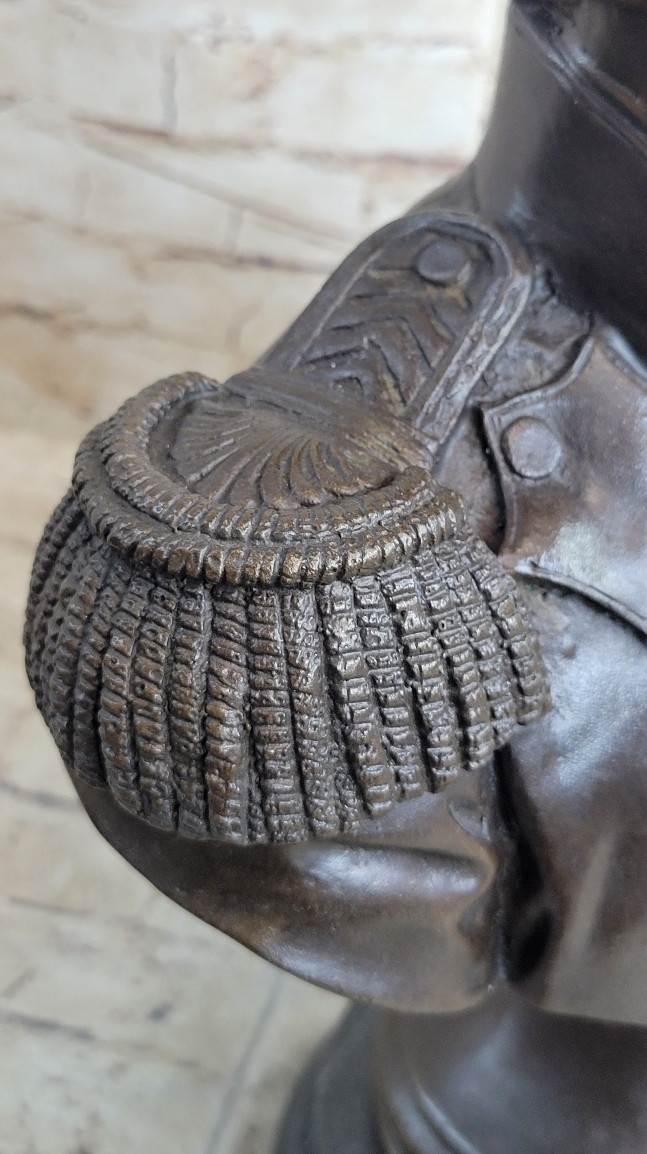 Crafted using the ancient lost-wax casting method, this sculpture ensures the highest level of quality and authenticity. The rich brown patina finish enhances the texture and depth of the piece, highlighting the intricate details and adding a touch of timeless elegance. Mounted on a sturdy base, this collector's edition stands as a testament to Napoleon's enduring legacy. With the artist's signature, this sculpture is a true work of art that captures the essence of one of history's most influential figures.Bronze Dimensions with Marble Base: Height 14.5" X Width 9"