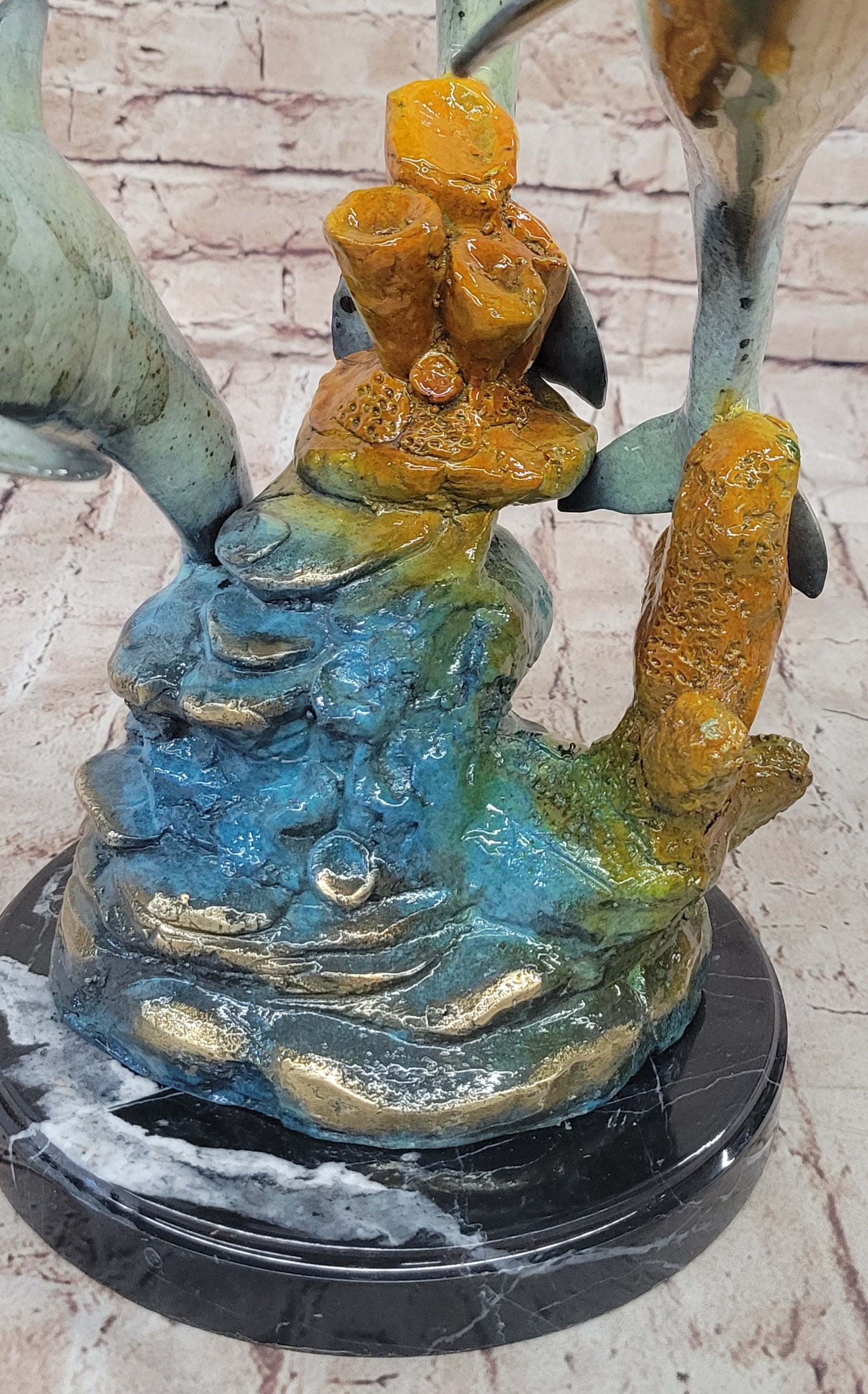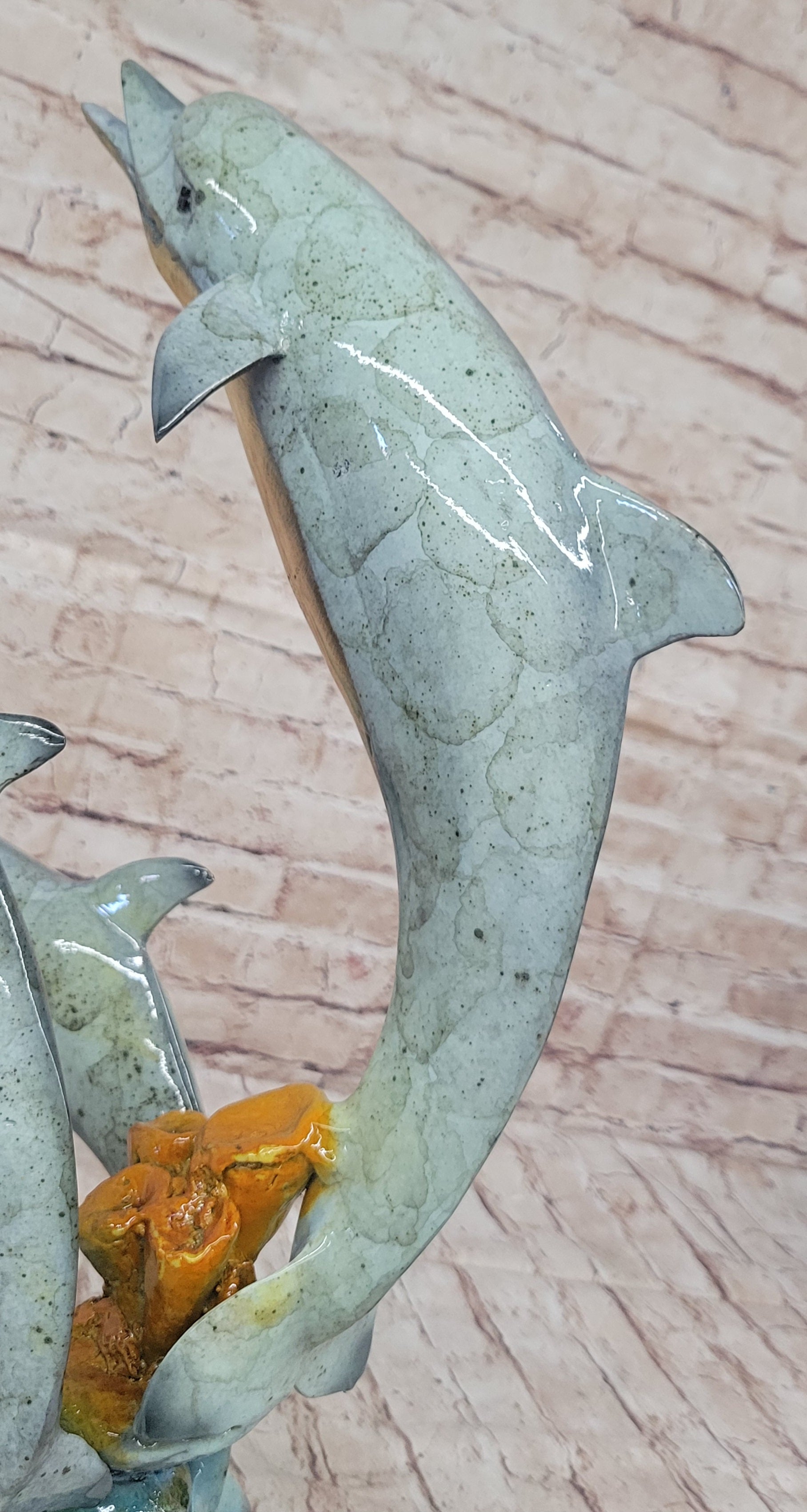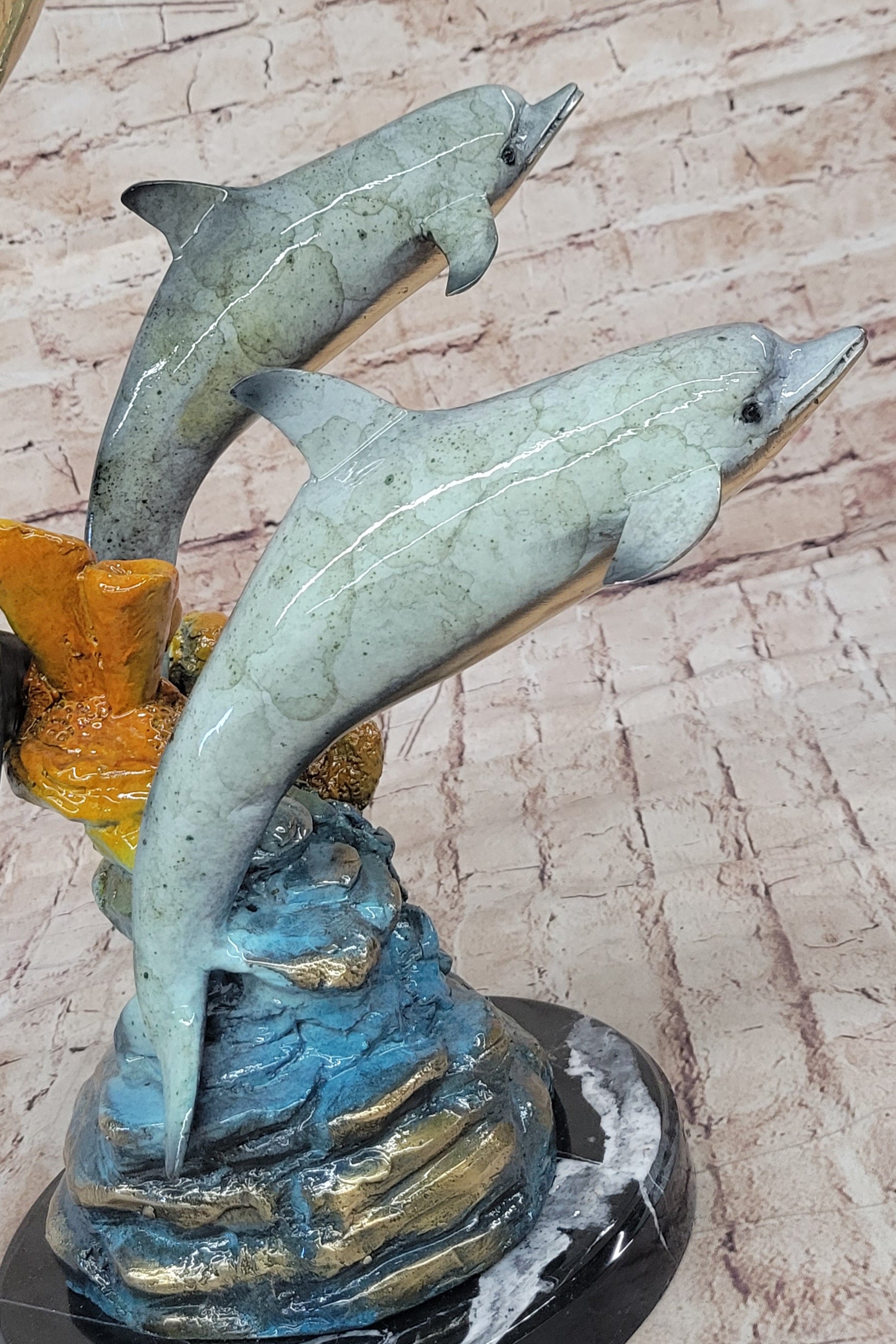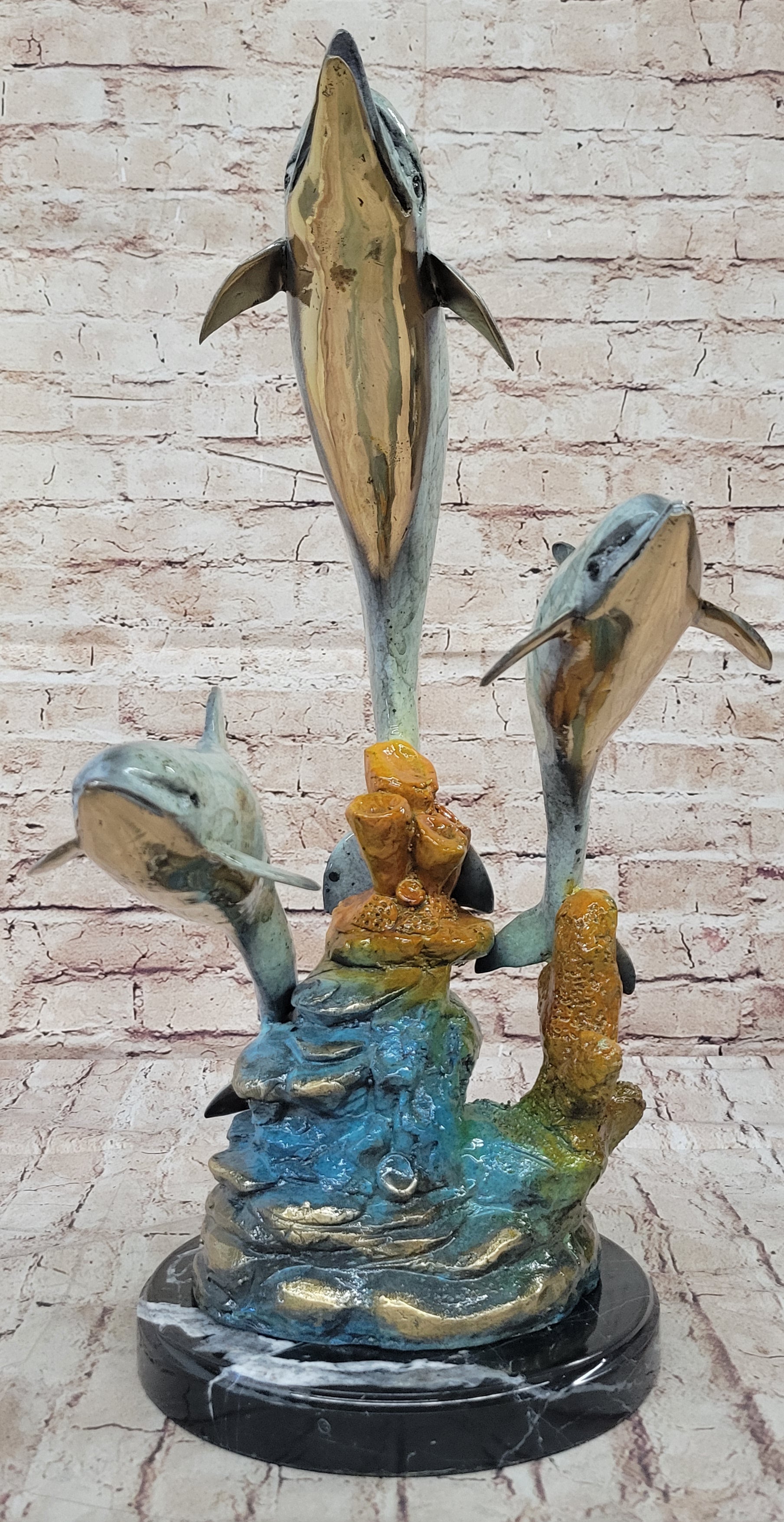 The sculpture features a special multi-color patina that adds vibrancy and depth to the dolphins' sleek forms. This intricate patina work enhances the lifelike appearance of the dolphins, highlighting their smooth, streamlined bodies and conveying a sense of movement and vitality. The varied colors of the patina create a stunning visual effect, making the sculpture a captivating focal point in any setting.