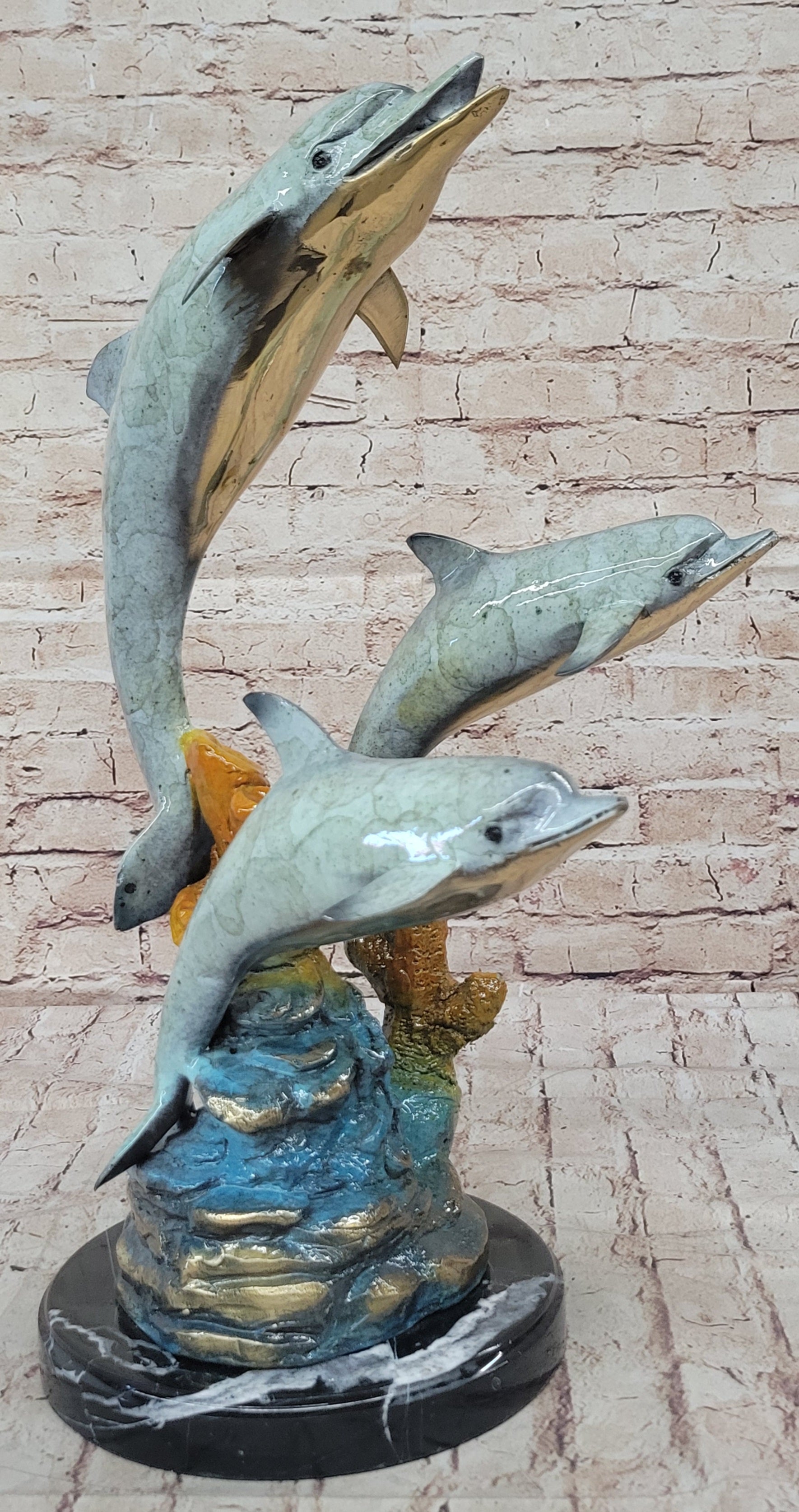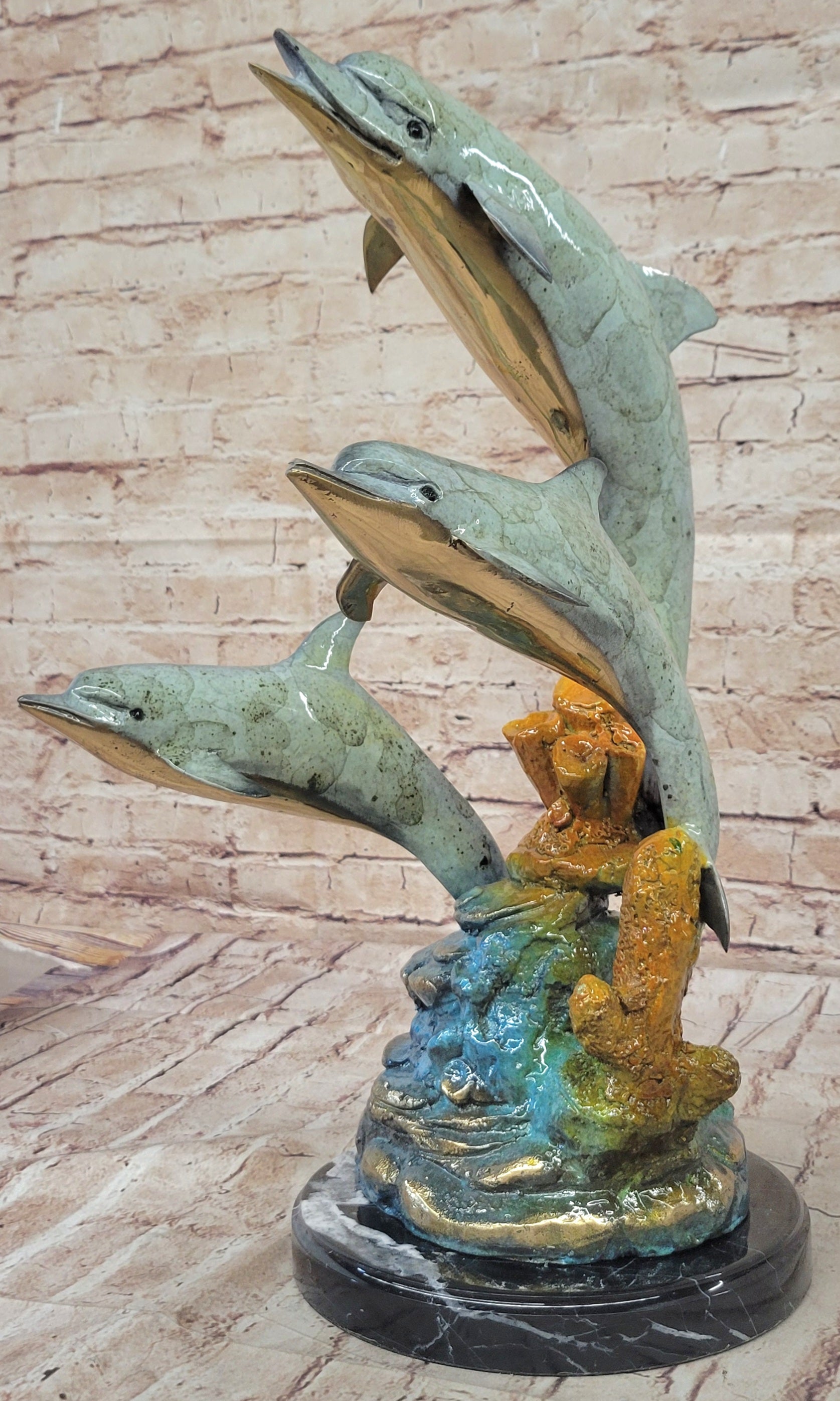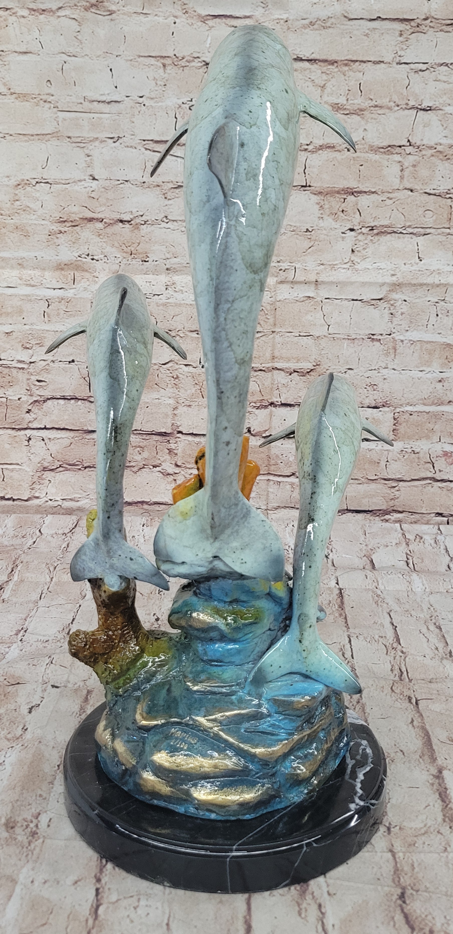 This "Three Dolphins" bronze sculpture is not only a beautiful piece of art but also a celebration of the grace and joy of marine life. Its exquisite craftsmanship and dynamic design make it a perfect gift for nature lovers, collectors, or anyone who appreciates fine art. Whether displayed as a centerpiece or part of a collection, this sculpture is sure to inspire admiration and bring a touch of the ocean's magic into any space.Bronze Dimensions with Marble Base: Height 19" X Width 14"