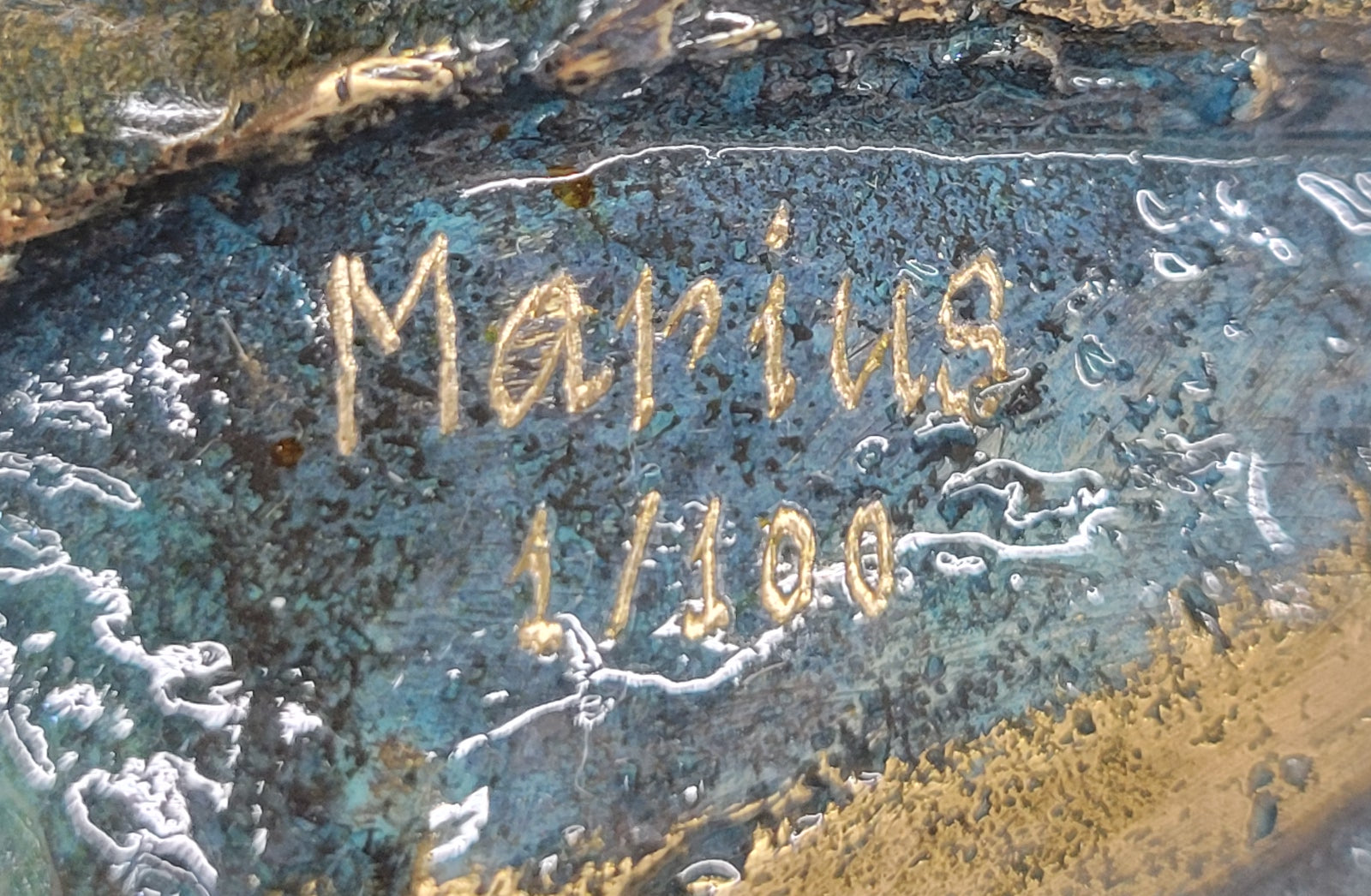 Mounted on a sleek black marble base, the sculpture gains an added touch of elegance and stability. The contrast between the colorful bronze and the polished black marble enhances the overall aesthetic, making it a sophisticated addition to any home or office decor. Each piece is signed and numbered by Marius, confirming its authenticity and limited edition status, which adds significant value for collectors and art enthusiasts alike.