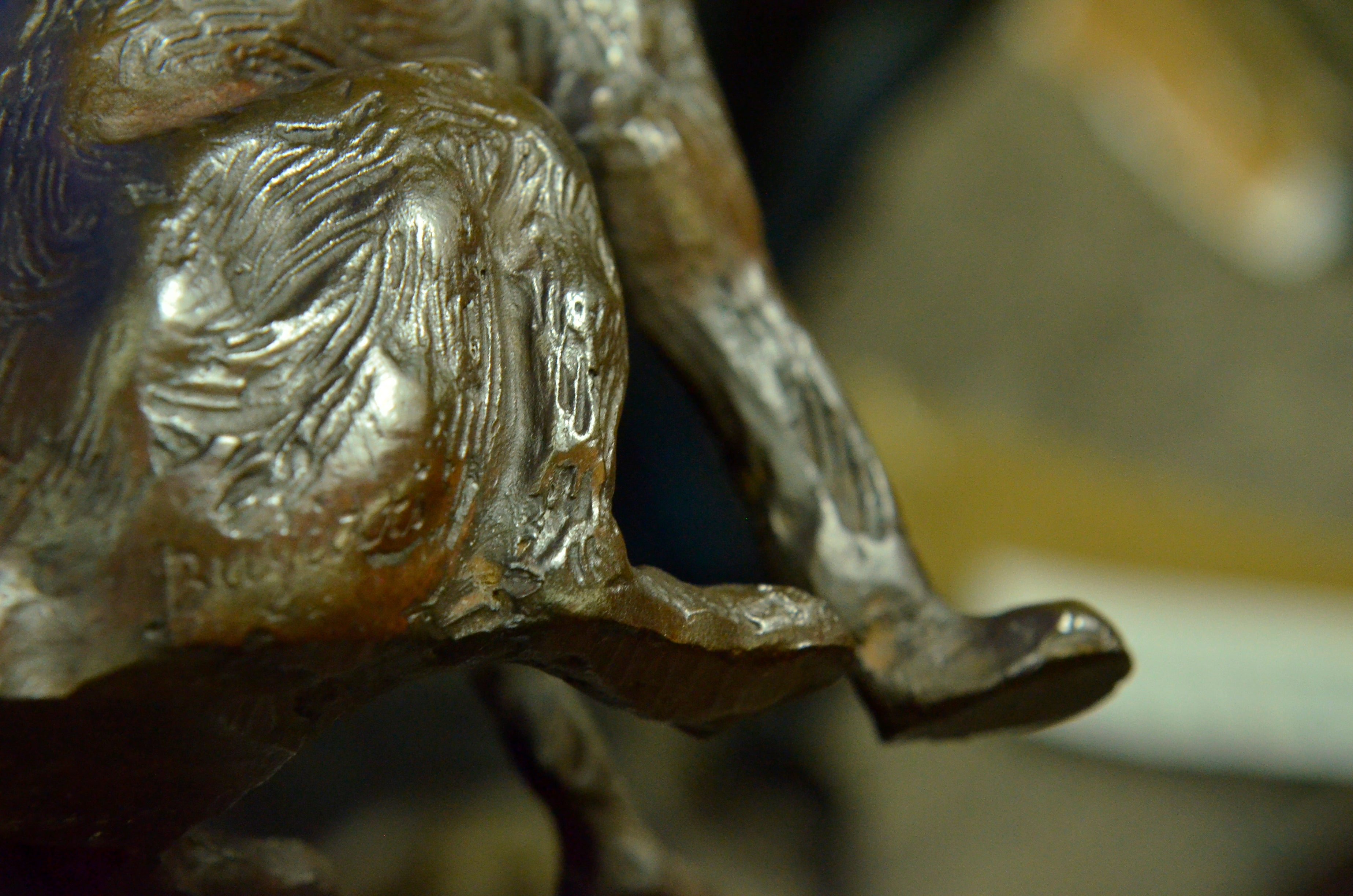 Her muscles flex as she walks across the open fields. This sculpture draws you in to the action and lets your imagination run wild as you join her on her walk across the wide open plains of the outdoors. This amazingly detailed sculpture portrays the Cougar stride beautifully as she transitions her paw and her weight while walking. Her facial expression shows calm, cool, and playful as she paws at the ground. A suiting soft brown patina highlights the muscles on the tiger’s legs, paws, & head. The head of the tiger is beautifully detailed right down the shape of the skull, jaw line, ears and facial structure. This bronze sculpture was casted using the “Lost was Method”. This Sleek and Graceful piece is perfect for the wildlife lover in you and is signed Bugatti.Bronze Dimensions :Height 7" x Width 8"