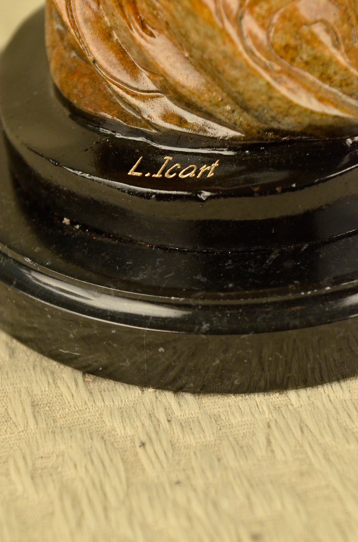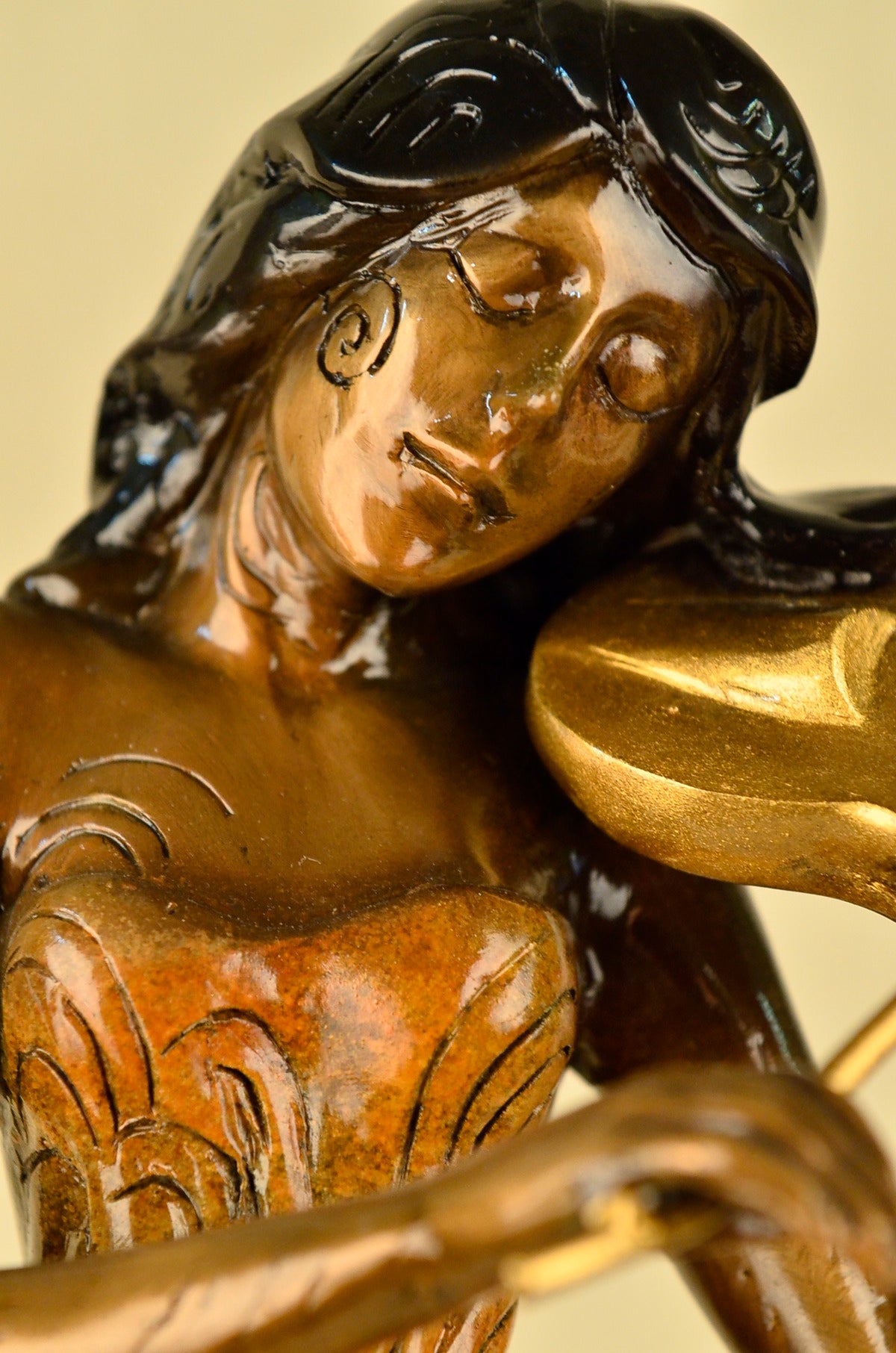 A young woman plays a soothing song on her violin. She cradles the violin under her chin, as she gazes down at the strings as she drags her bow across them. Her musical notes lift into the air that swirls around her, blowing her hair off her face. Her halter goddess dress clings to her curves, exposing her slim frame. She entertains all who steal a moment to listen to her sweet lullaby. 100% bronze and handmade, this brown patina sculpture was cast using the "Lost Wax Method" and is mounted on a round marble base and is signed L. Icart.Original or Reproduction: Reproduction