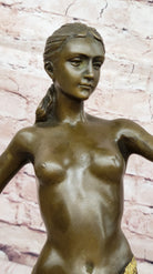 This captivating bronze sculpture portrays Diana the Huntress, the Roman goddess of the hunt, wilderness, and the moon. The nude huntress stands poised and confident, embodying grace, strength, and divine femininity. Her elegant form and powerful stance reflect her connection to nature and her role as protector of all living creatures.