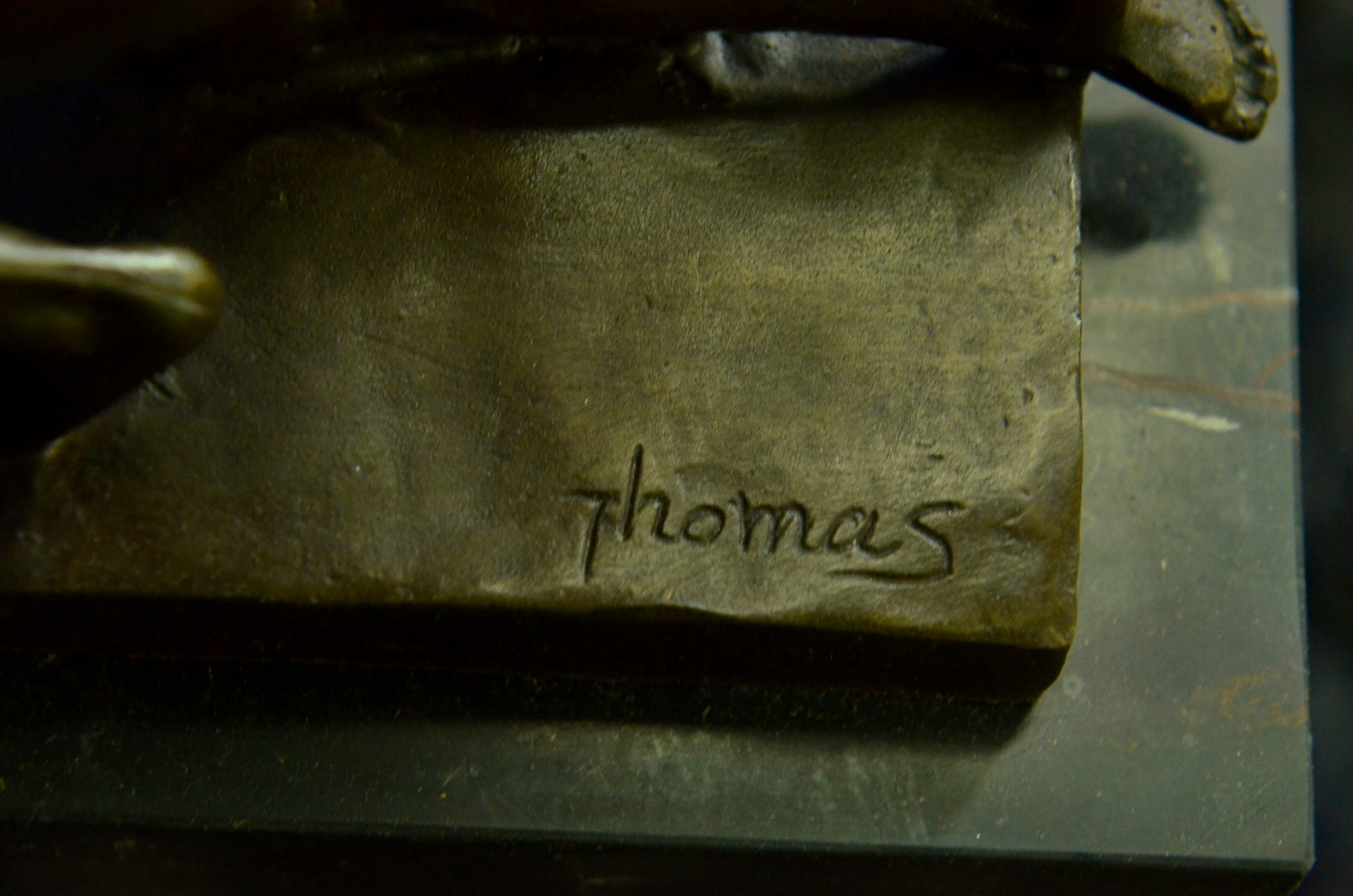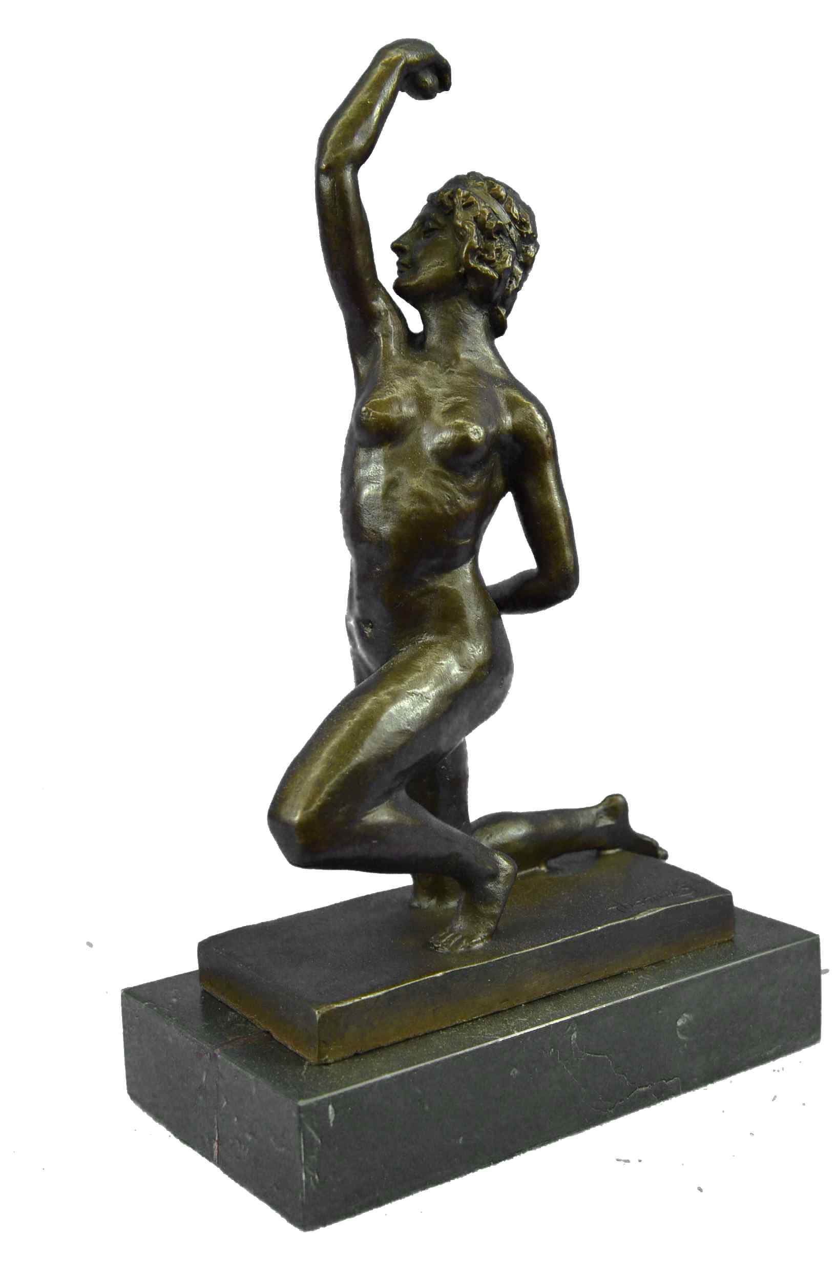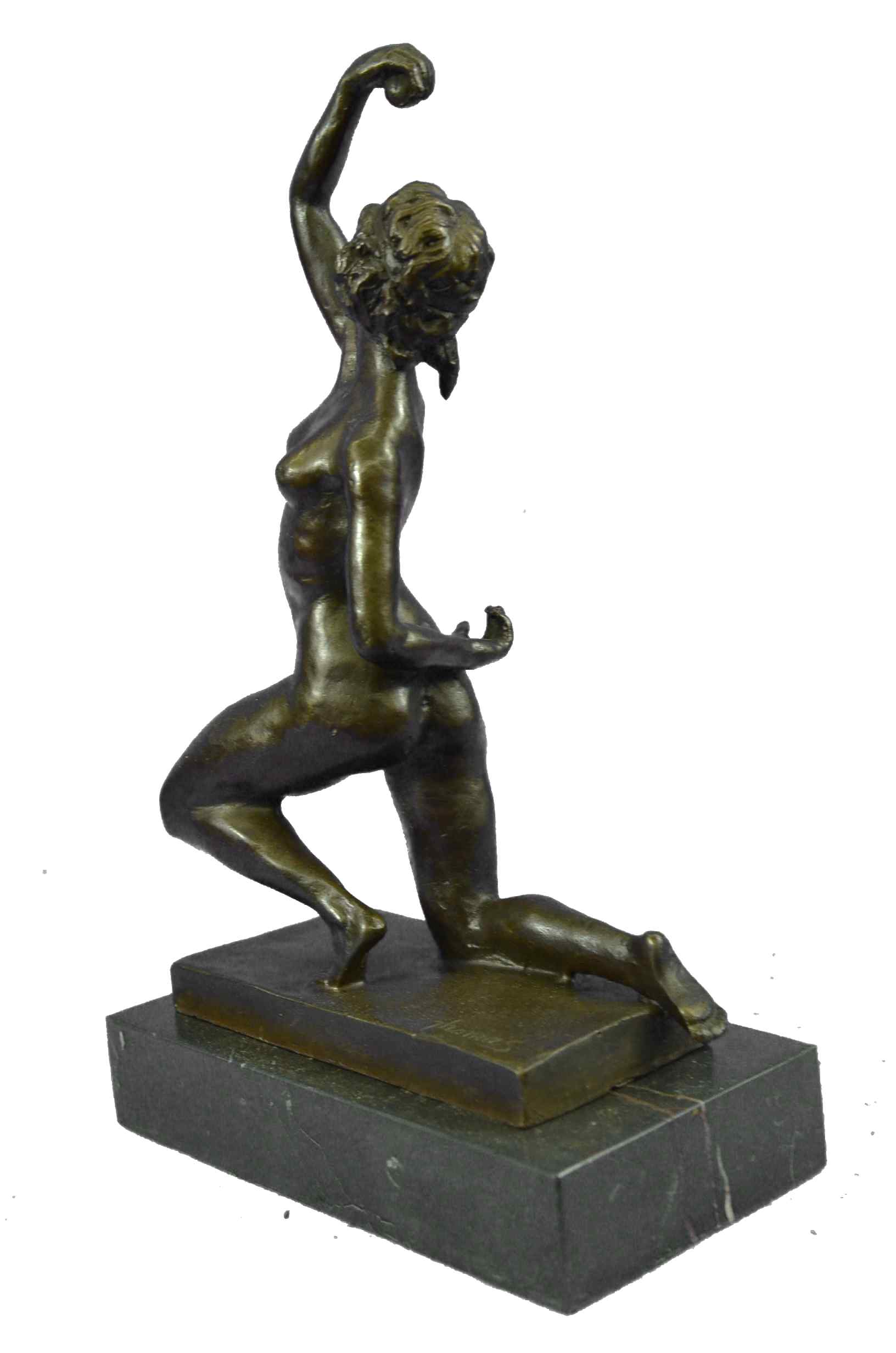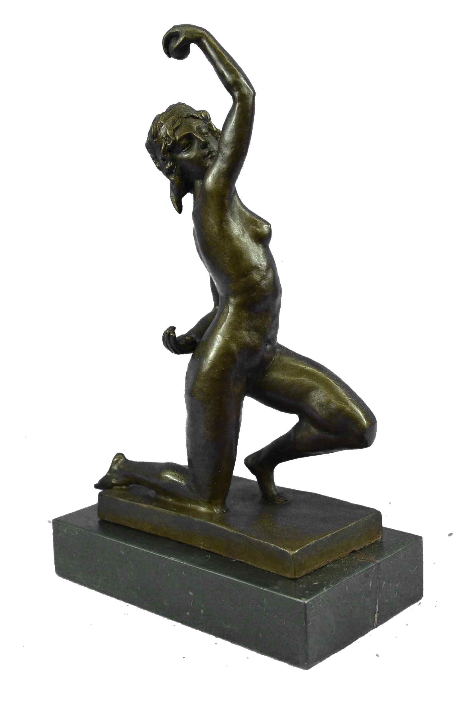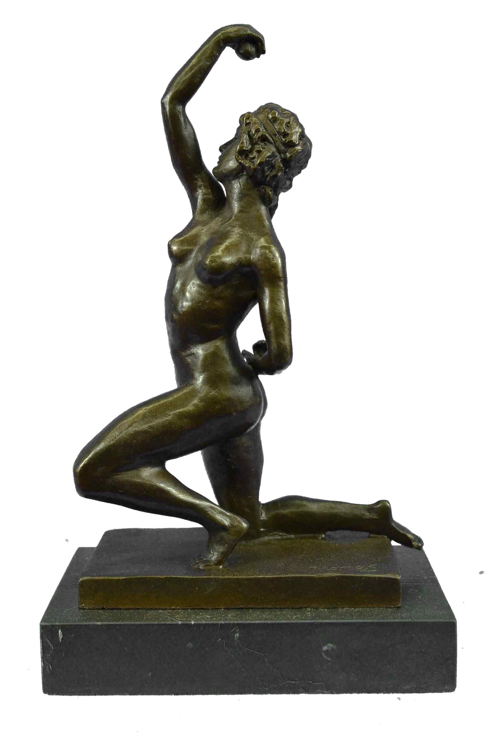 She is an artist`s muse. She poses for a painting in the buff before his easel. She is comfortable in her natural state and being the inspiration for the strokes of his paintbrush. She kneels before him and curves her arm over her head, holding Eden`s seductive apple in her fist. She seems to also be showing off her biceps. She has a tiny frame but curvy hips and thighs. Careful attention was paid to detail. You can see the lines of her abs as her body extends and even the curve of her foot behind her. She smiles back at him playfully. Fun. Sexy. Flirtatious. Confident. 100% bronze and handmade, this brown patina sculpture was cast using the "Lost Wax Method" and mounted on a black marble base and is signed Thomas.Bronze Dimensions with Marble Base:Height 10" x Width 6"