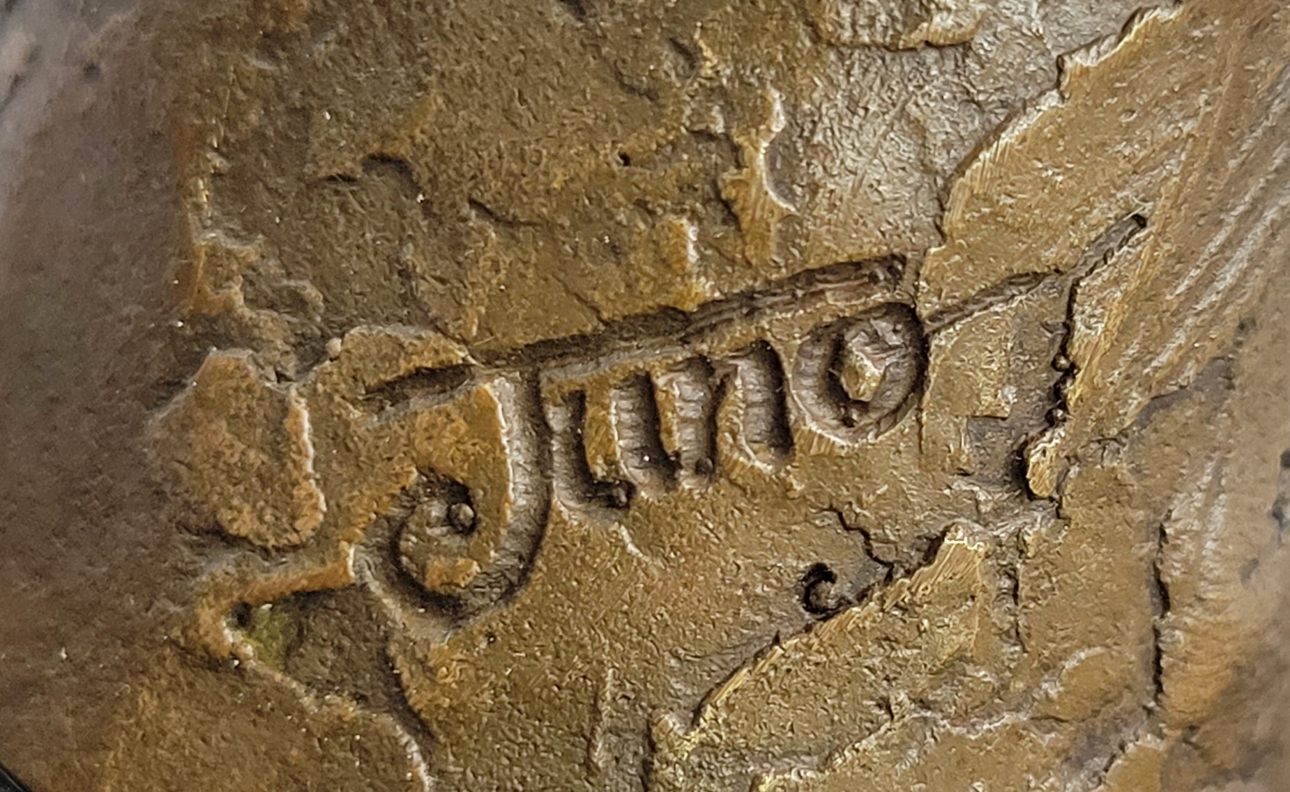 The signature of the esteemed artist Juno adorns this bronze goblin, ensuring its authenticity and quality. Whether displayed in a living room, study, or as a conversation piece in your home, this sculpture brings a touch of magic and playfulness to its surroundings. Embrace the presence of a loving house guardian and let this bronze goblin inspire smiles and laughter in your space.