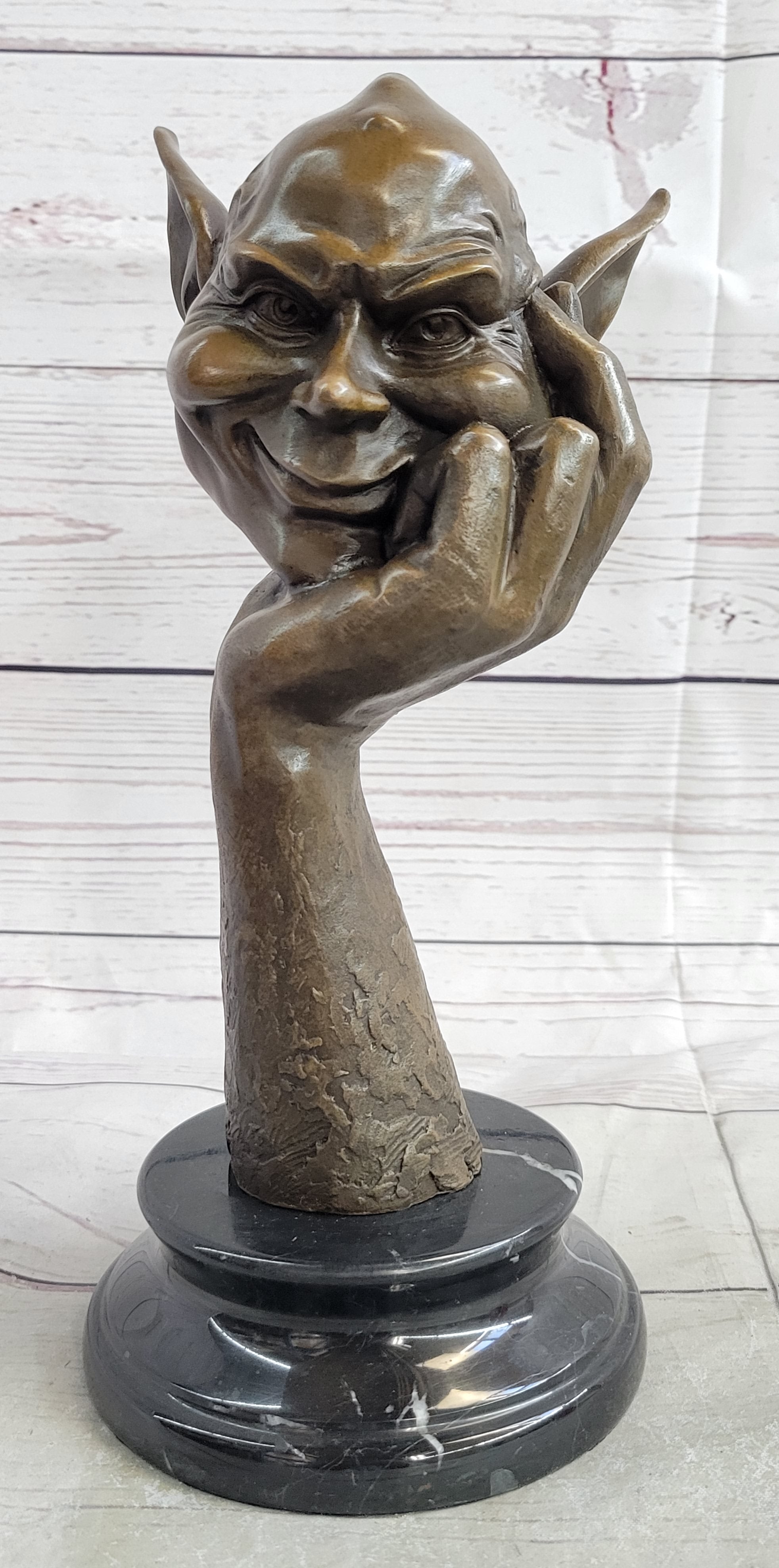 This goblin sculpture is intricately detailed, showcasing its long pointed ears, exaggerated mouth, raised eyebrows, and distinctive pointed cap. Every aspect of the goblin's character is captured with precision and artistry, adding to its whimsical appeal. Resting on a black marble base, this enchanting bust is a testament to the artist's skill and creativity.