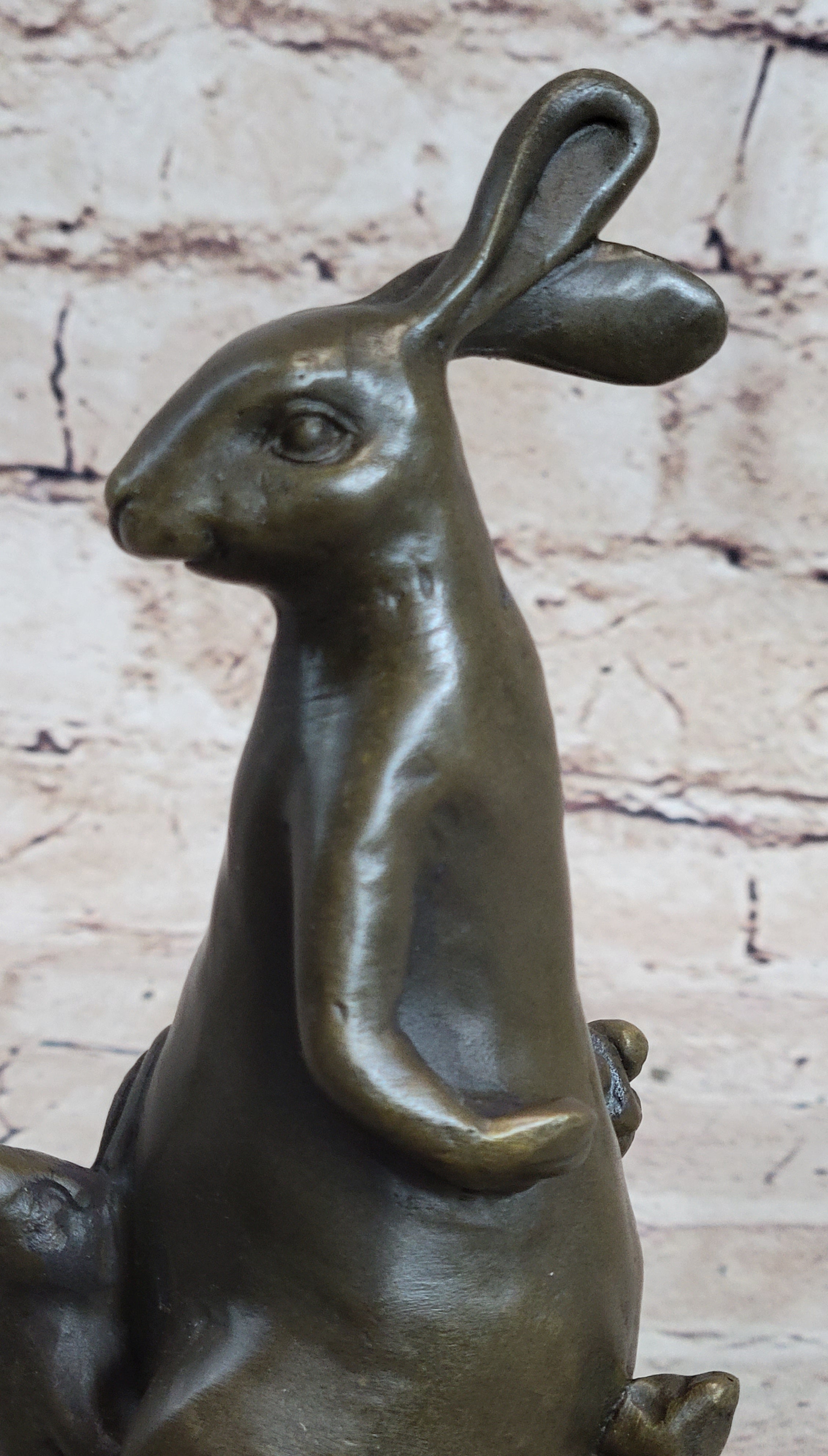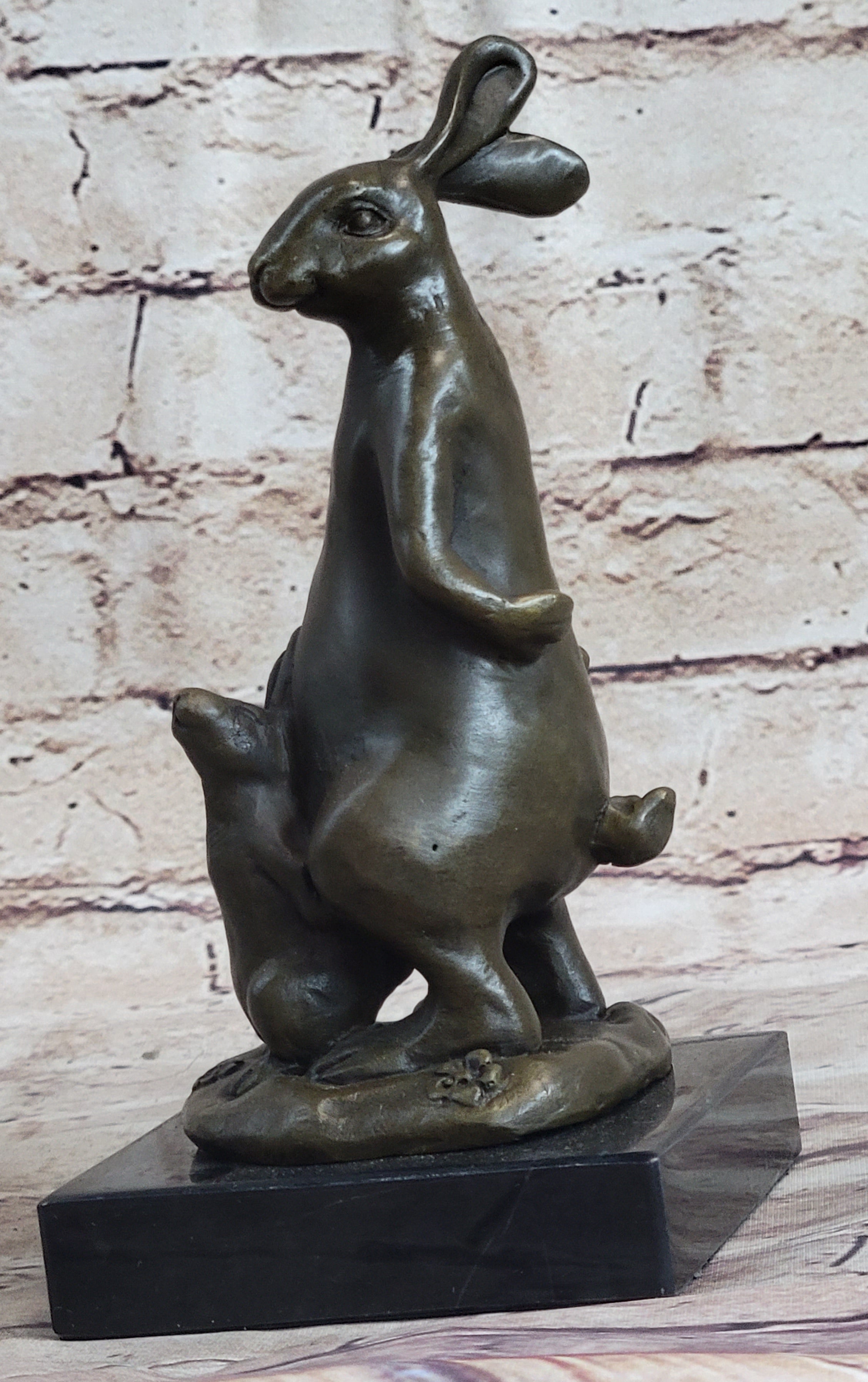 Witness the heartwarming bond between a parent and child captured in this endearing bronze sculpture. Even among animals, the innate instinct to love and nurture their offspring shines through. In this delightful artwork, a mother rabbit tenderly holds her baby bunny, gently rocking him back and forth, soothing him to sleep. The stark size difference between them emphasizes the protective nature of the mother.