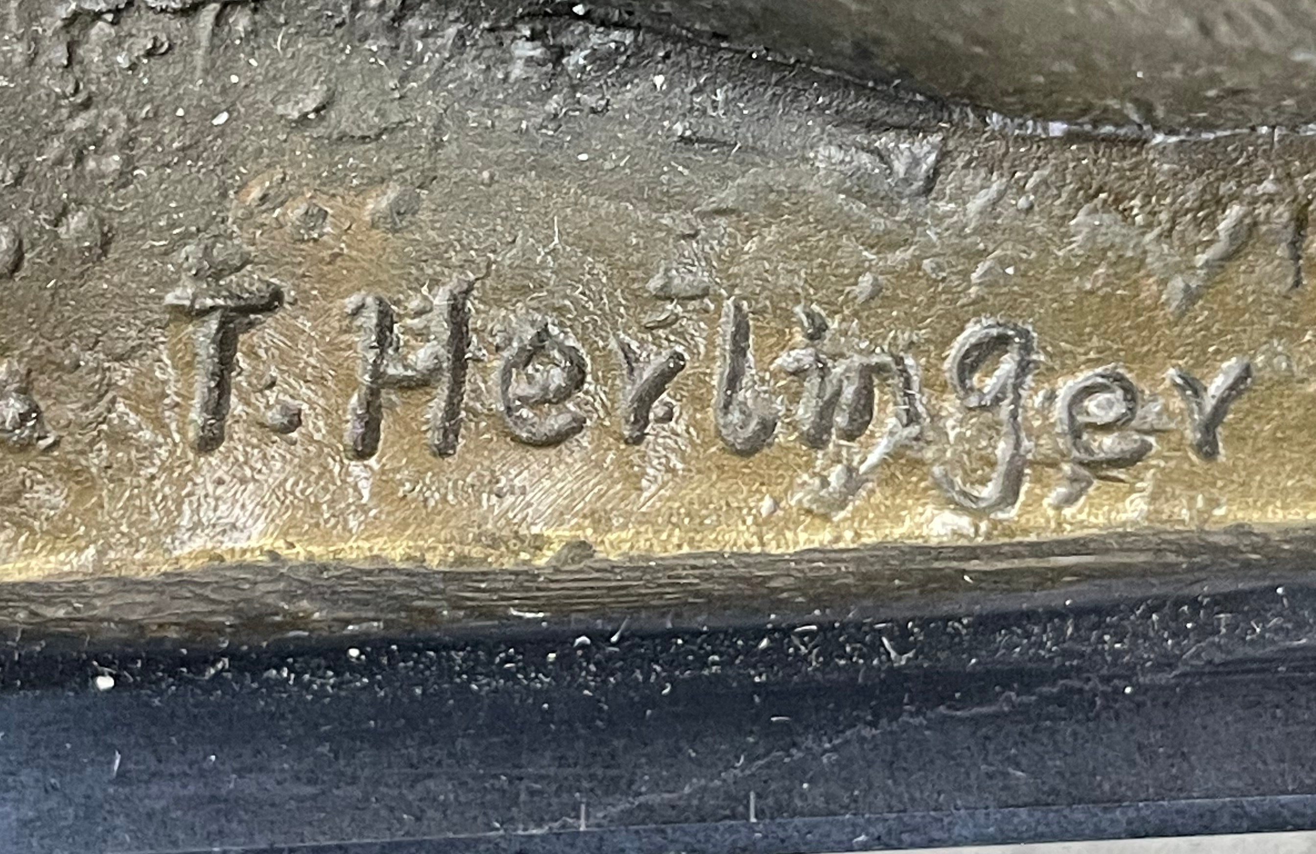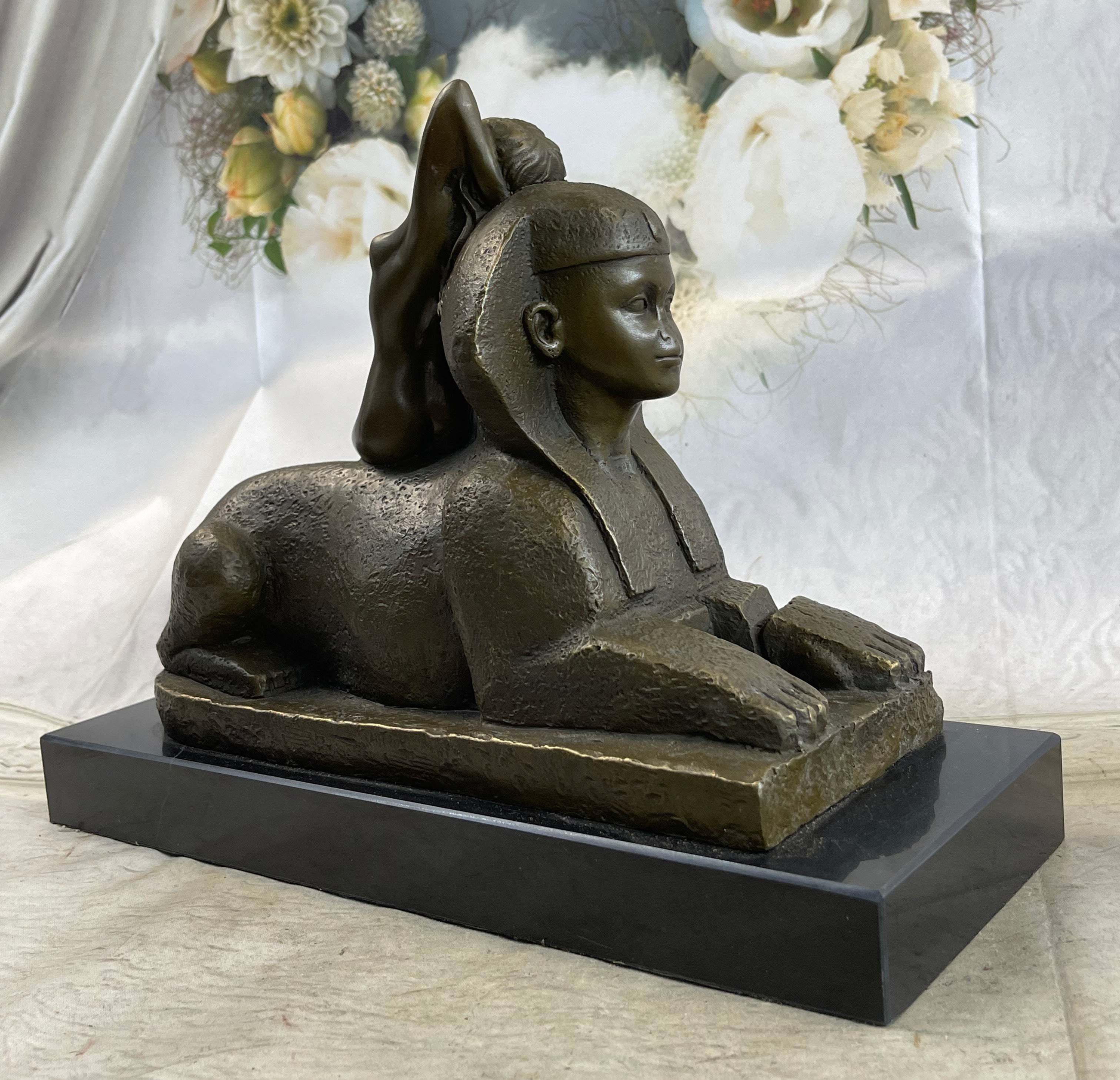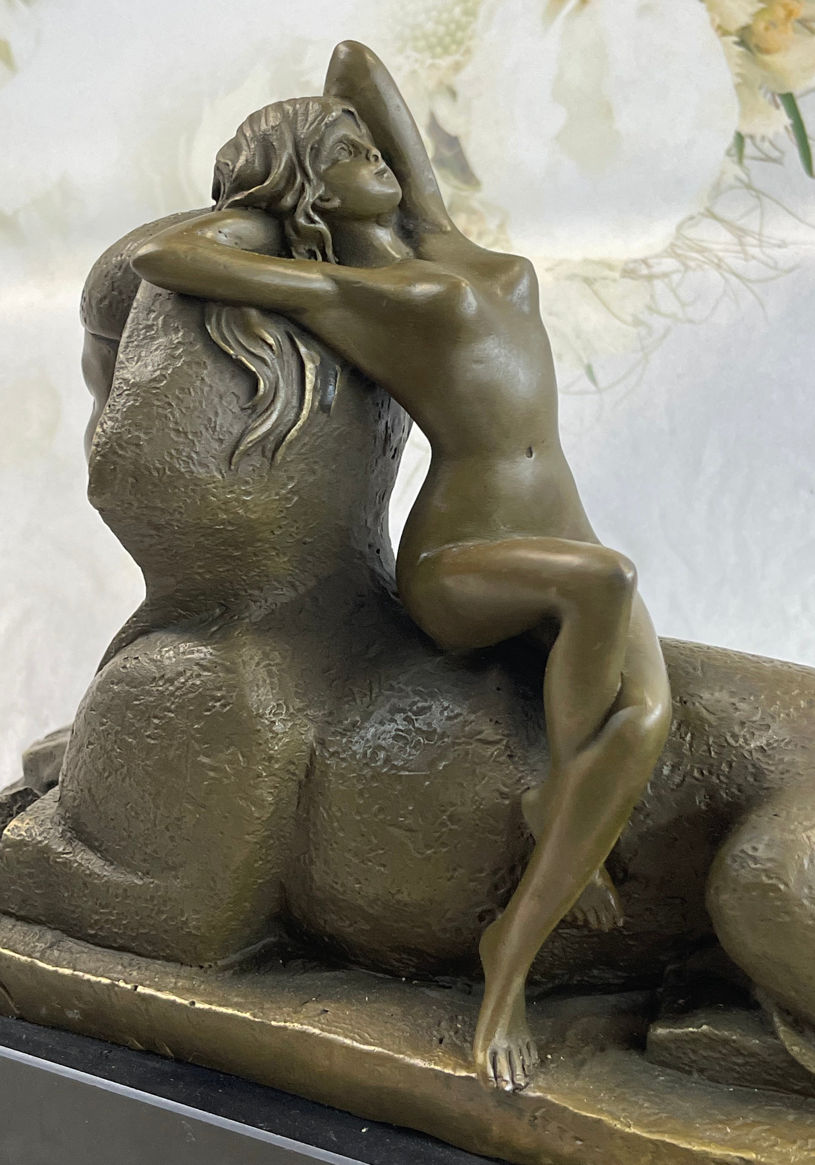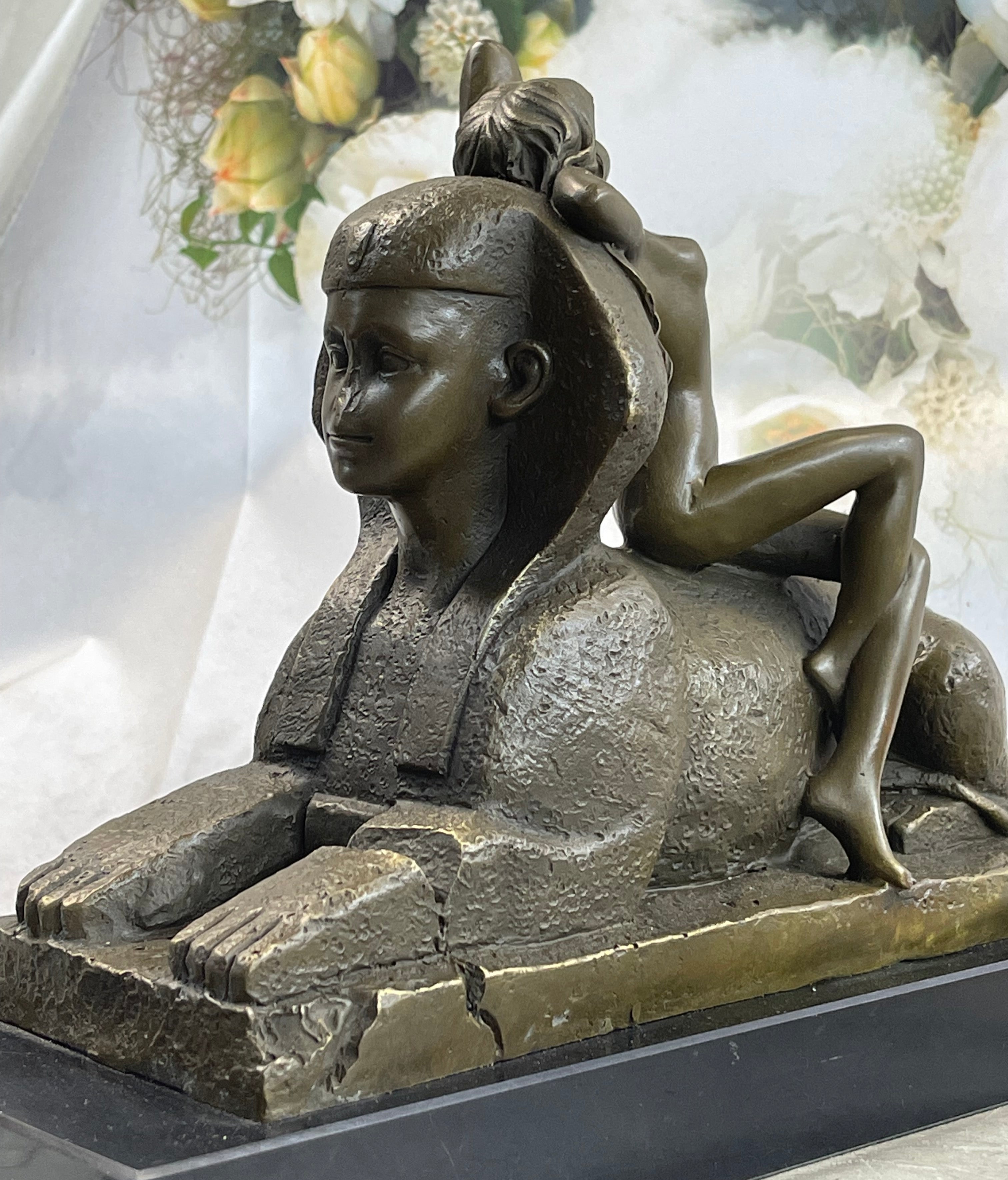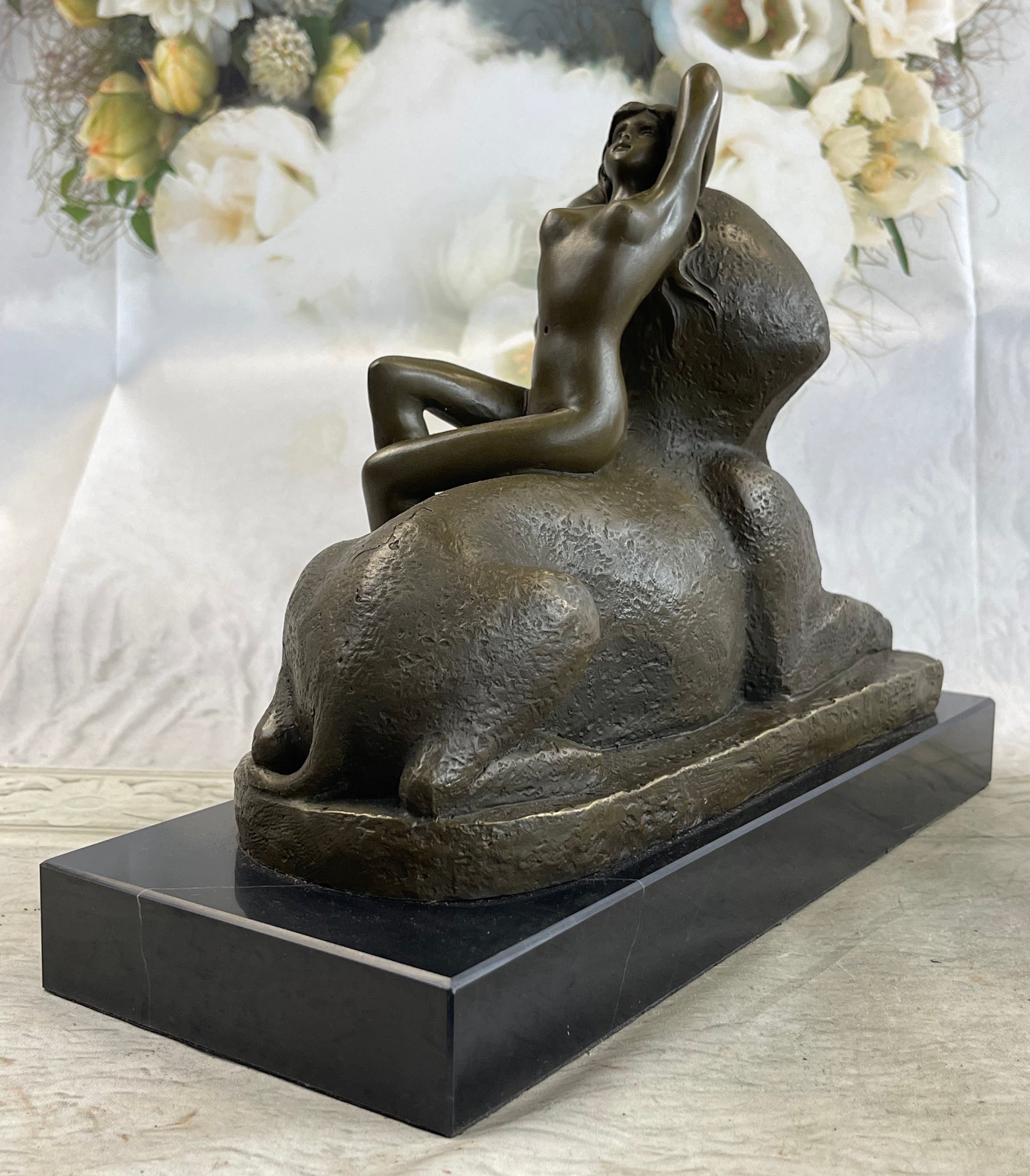 This exceptional French Art Nouveau bronze sculpture by T. Herlinger draws deeply from classical influences, merging neoclassical elegance with the mystique of ancient Egypt. The composition features a graceful female figure reclining languidly against a noseless sphinx, evoking the artistic fascination with antiquity that swept through France during the Napoleonic era. The contrast between her soft, flowing form and the enigmatic stone guardian creates a visually compelling and historically rich tableau. With remarkable attention to detail, the sculpture captures the fluid beauty of the female form and the symbolic power of the sphinx. The folds of the drapery, the delicate posture, and the serene expression on the woman’s face showcase the artist’s skill and his embrace of Art Nouveau ideals. This work exemplifies the era’s love for myth, symbolism, and the integration of historical themes into decorative art. Handcrafted using the time-honored lost wax casting method, this piece stands as a testament to traditional bronze artistry. The sculpture is mounted on a solid black marble base that adds contrast and elegance, elevating its presence in any room or collection. Signed by the artist, this exquisite piece is a rare and desirable find for serious collectors of fine Art Nouveau bronzes.