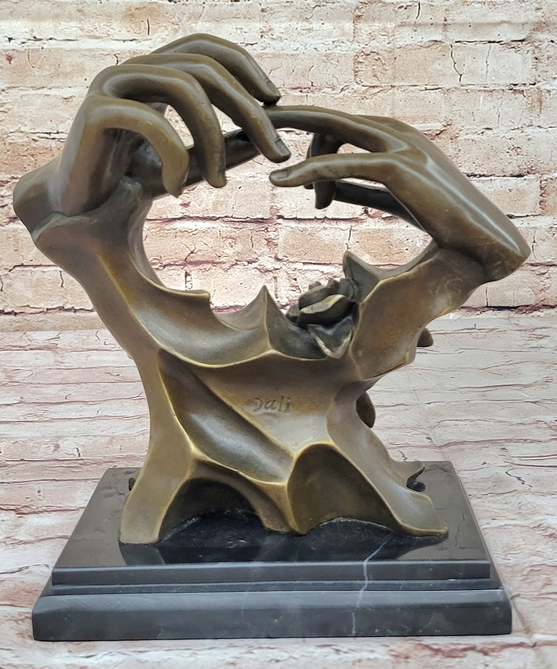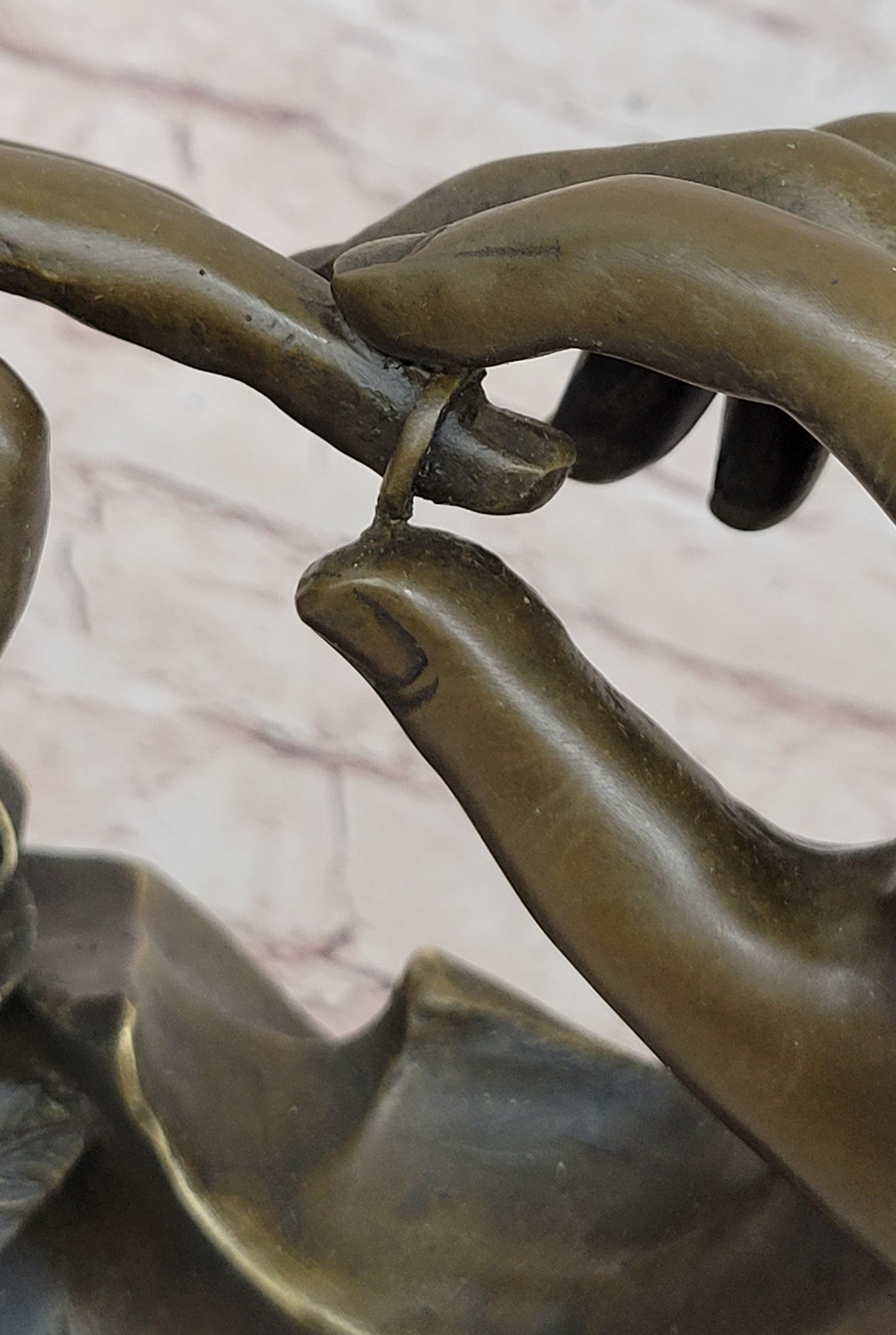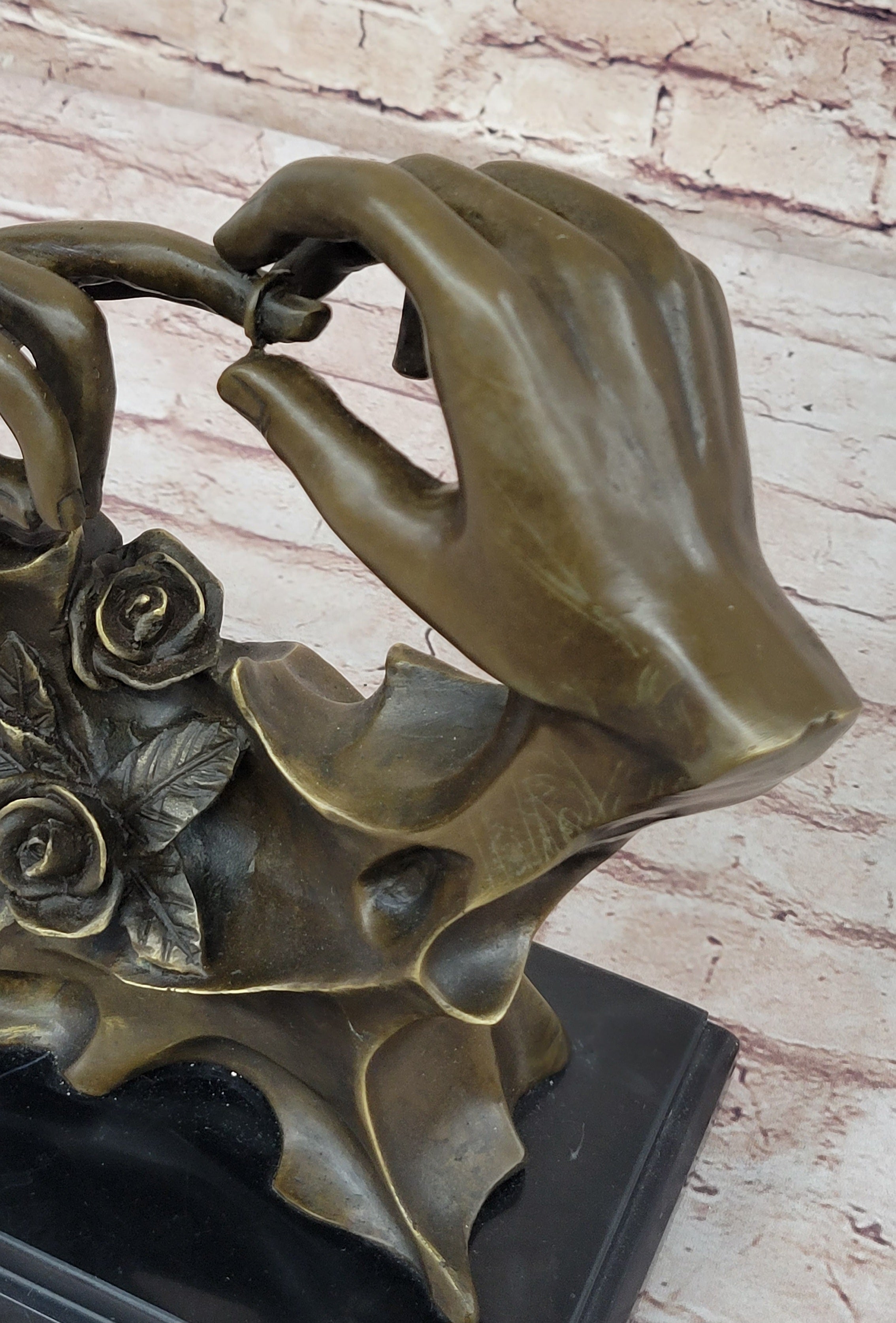 This sculpture serves as an ideal wedding or engagement gift, as it embodies the timeless values of love and partnership. Its significance is further emphasized by the hands' lifelike appearance, which brings a sense of authenticity and emotional resonance to the piece. Resting upon a sleek black marble base, this statue exudes elegance and sophistication. The contrast between the bronze sculpture and the marble base creates a visually striking composition, further enhancing its aesthetic appeal. To authenticate this remarkable artwork, the sculpture is signed by the esteemed artist Milo. This signature serves as a testament to the artist's skill and craftsmanship, adding value and credibility to the piece.