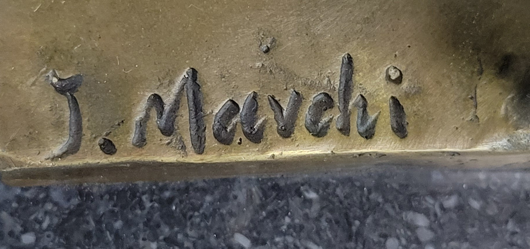 Crafted with meticulous attention to detail, this enchanting sculpture was brought to life using the revered "Lost Wax Method," a casting technique known for its ability to capture intricate details with precision. Enhanced with a sophisticated brown patina finish, the sculpture exudes a timeless elegance that complements any art collection or interior space. Mounted on a sleek marble base, this sculpture bears the signature of the esteemed artist, J. Mavchi, reflecting the skill and artistic vision behind its creation. With its captivating charm and dynamic appeal, "The Playful Sculpture" serves as a delightful centerpiece, adding a touch of liveliness and artistic finesse to any environment.Bronze Dimensions with Marble Base: Height 13" X Width 6"