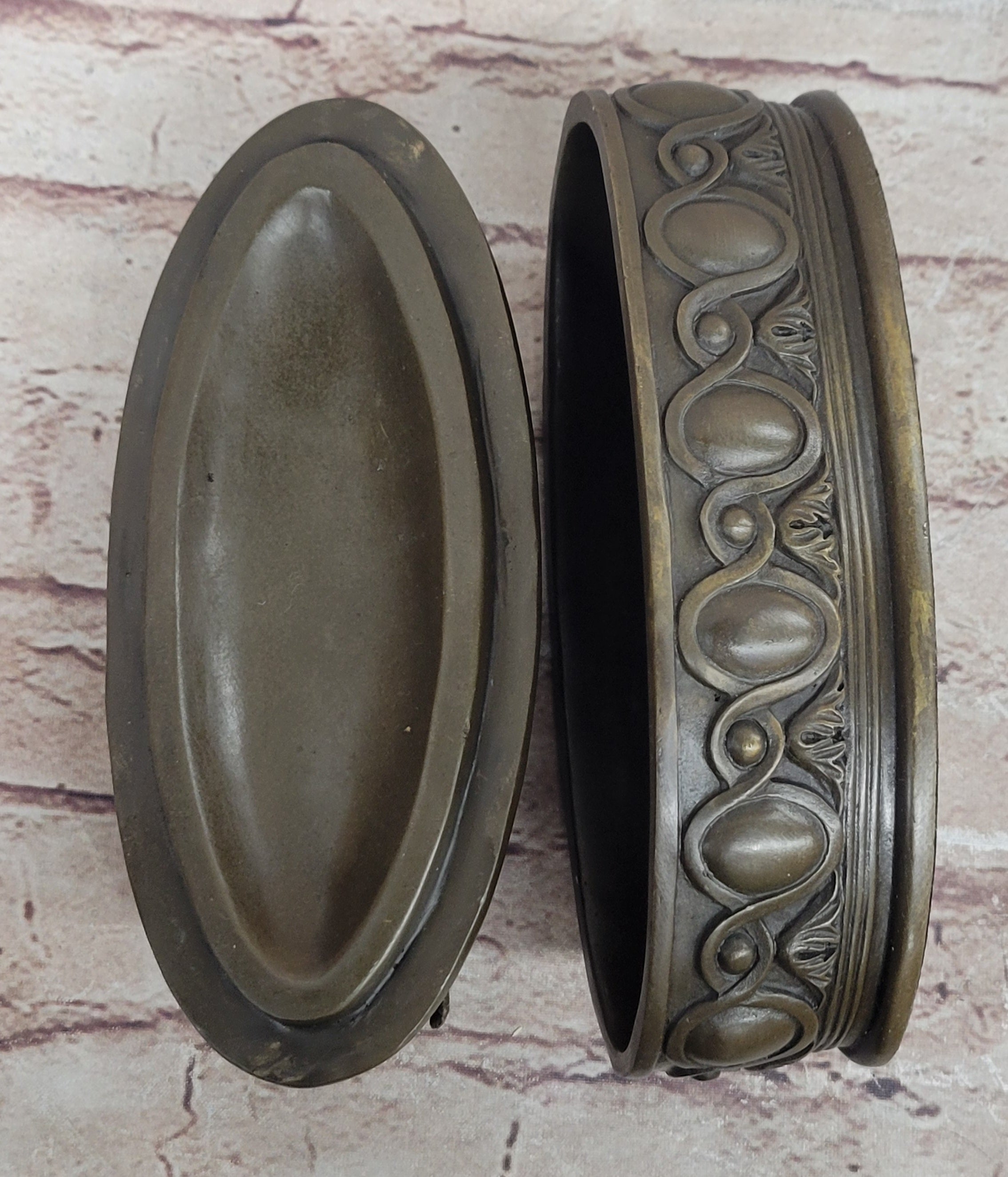 The substantial weight of the bronze jewel box emphasizes its quality and durability, underlining its status as a substantial and valuable addition to any art collection. The elegant brown patina finish enhances the aesthetic appeal, adding a touch of sophistication to the piece. The sculpture is in excellent condition, with no dings or dents, ensuring its enduring beauty.