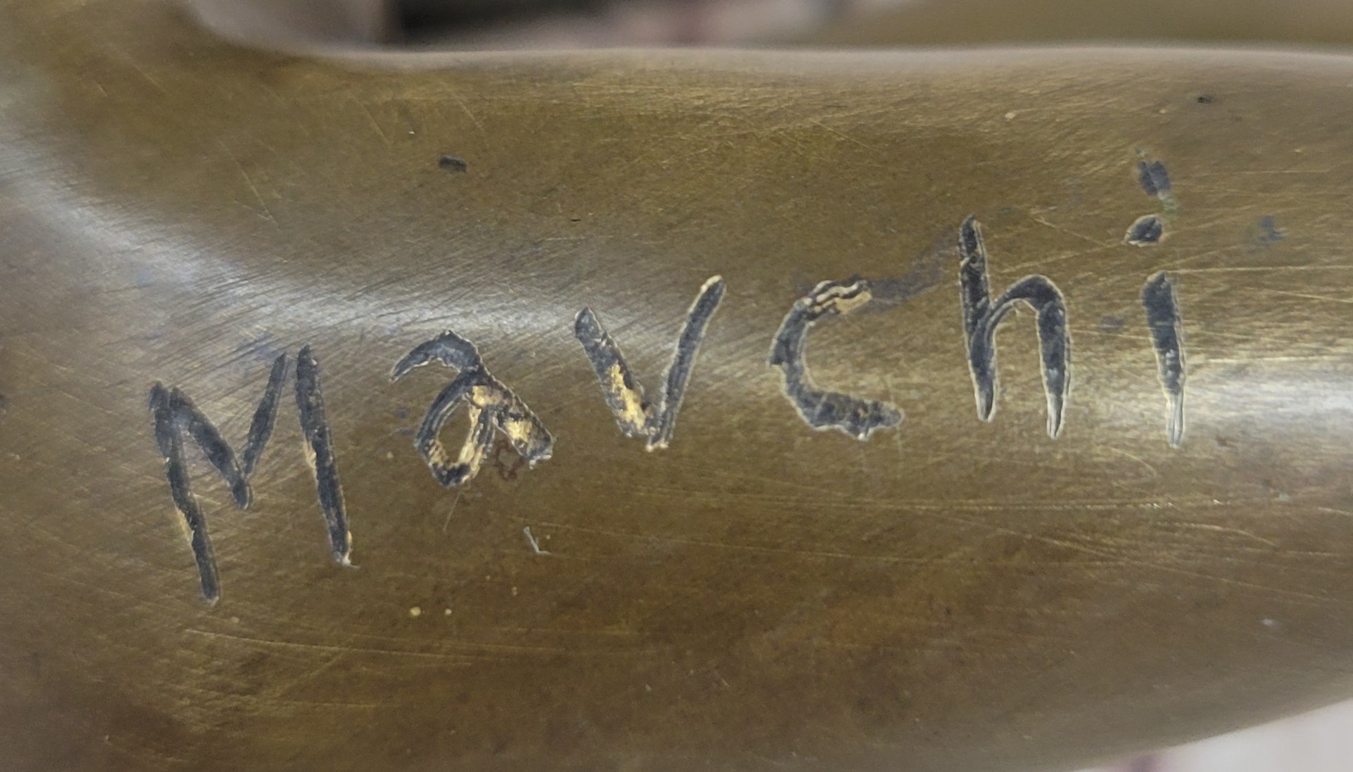 Mounted on a polished black marble base, the sculpture stands as a stunning and sophisticated piece of art. The base provides a solid and elegant foundation, contrasting beautifully with the bronze figure. The artist Mavchi's signature adorns the piece, affirming its authenticity and artistic value. This sculpture is a captivating addition to any collection, offering a provocative and sophisticated exploration of human sensuality.Bronze Dimensions with Marble Base: Height 9.5" X Width 6.5"