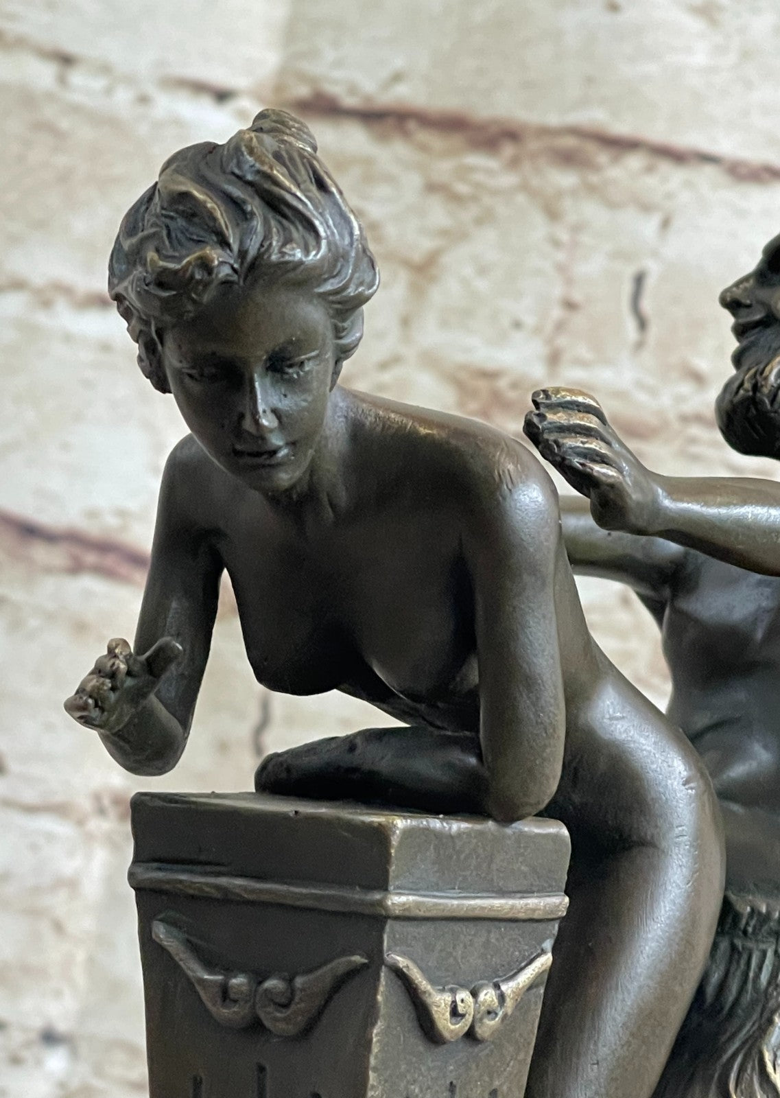 Embrace the allure of "Temptation Unveiled" and invite an air of sophistication and mystique into your collection. This Vienna Bronze sculpture promises to be an absolute eye-catcher, embodying the perfect balance between artistic expression and the captivating world of human desires.Bronze Dimensions with Marble Base: Height 10" X Width 7"