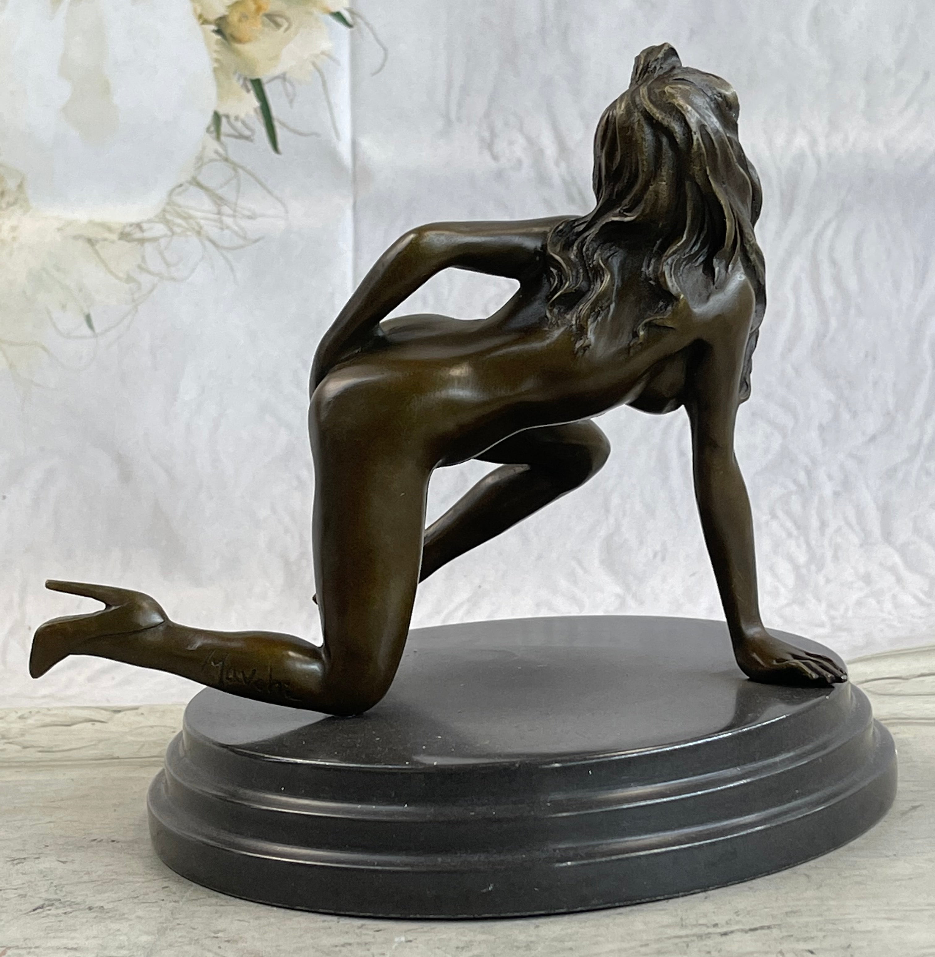 The sculpture's depiction of the nude seductress serves as a celebration of feminine beauty and allure, inviting viewers to contemplate the intricacies of human desire and passion. With its evocative portrayal and meticulous attention to detail, this bronze sculpture transcends its material form to evoke a sense of intimacy and connection with the viewer, offering a timeless exploration of the complexities of human sensuality and desire.Bronze Dimensions with Marble Base: Height 8" X Width 8"