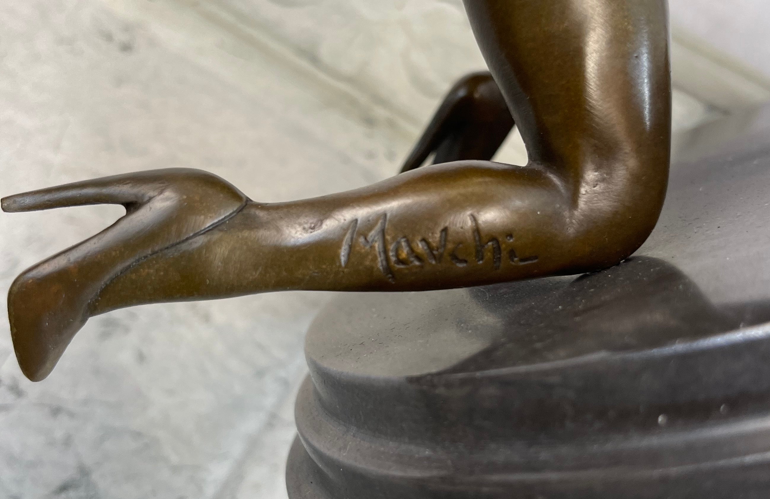 Featuring a rich brown patina finish, the sculpture radiates a timeless elegance and sophistication, accentuating the intricate details of the seductress's pose and expression. The sculpture's placement upon a black marble base enhances its visual impact, creating a striking contrast that highlights the intensity and intimacy of the depicted moment. Signed by the esteemed artist Mavchi and marked as a limited edition piece, the sculpture stands as a testament to the artist's mastery and skill in capturing the complexities of human emotion and desire through the medium of bronze.