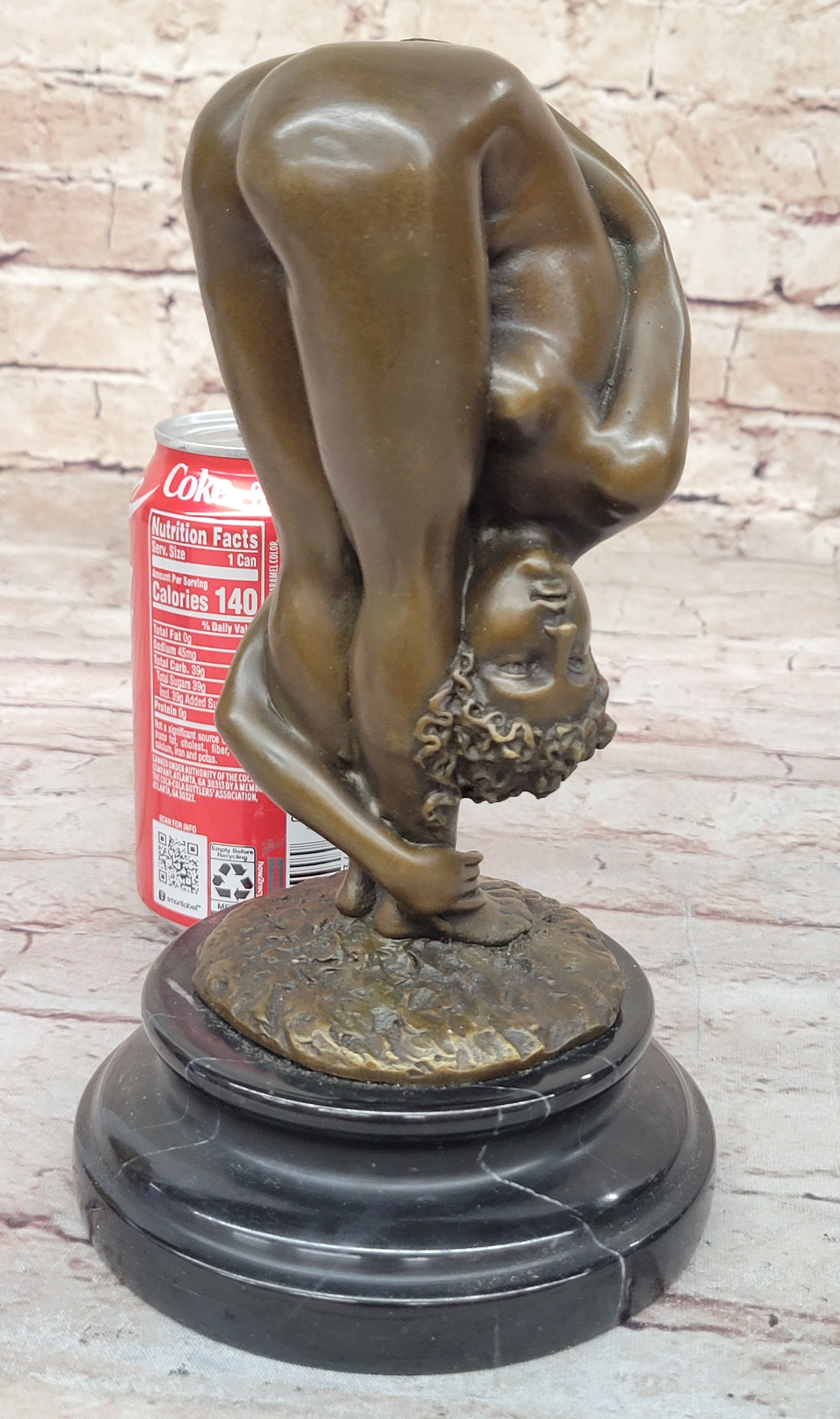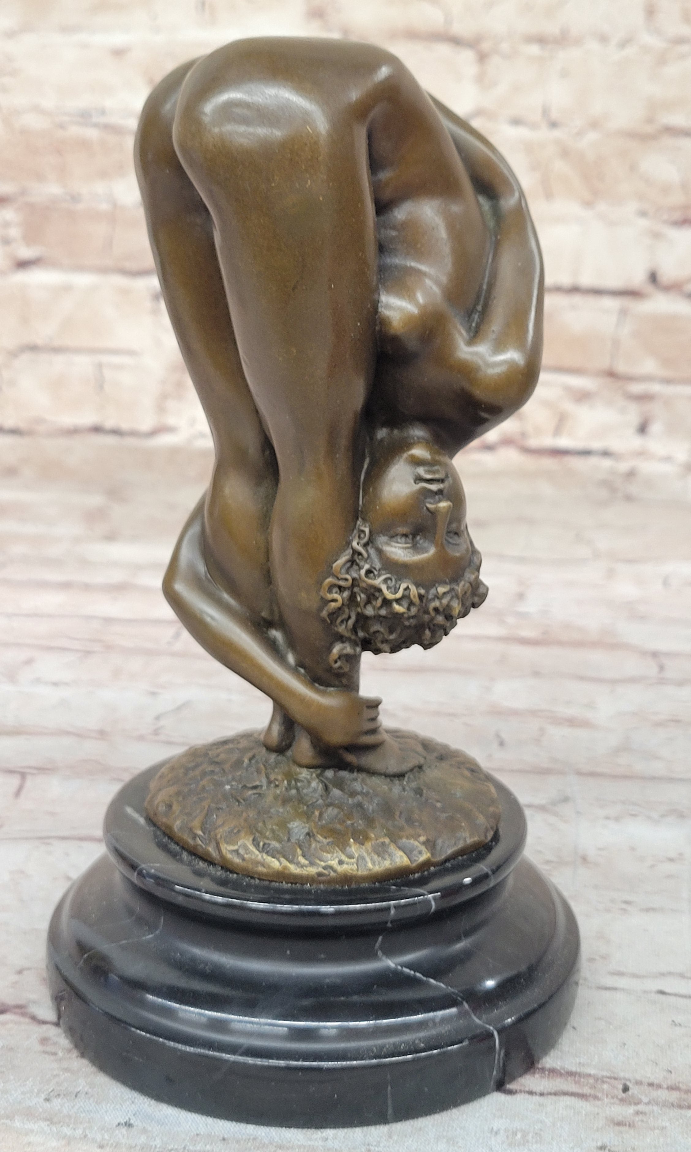 Indulge in the allure of the exquisite nude sculpture as she embraces flexibility, throwing her arms gracefully to the ground. Her cascading hair adds to the allure as her slightly bent legs rest on tiptoes, creating a seductive arch that showcases her shapely form from head to toe. This 100% handmade bronze sculpture was meticulously crafted using the ancient lost-wax casting method, preserving its authenticity. The brown patina finish adds a timeless touch, and the sculpture stands proudly on a black marble base bearing the European Bronze Finery stamp for quality assurance, along with the artist Juno's signature.