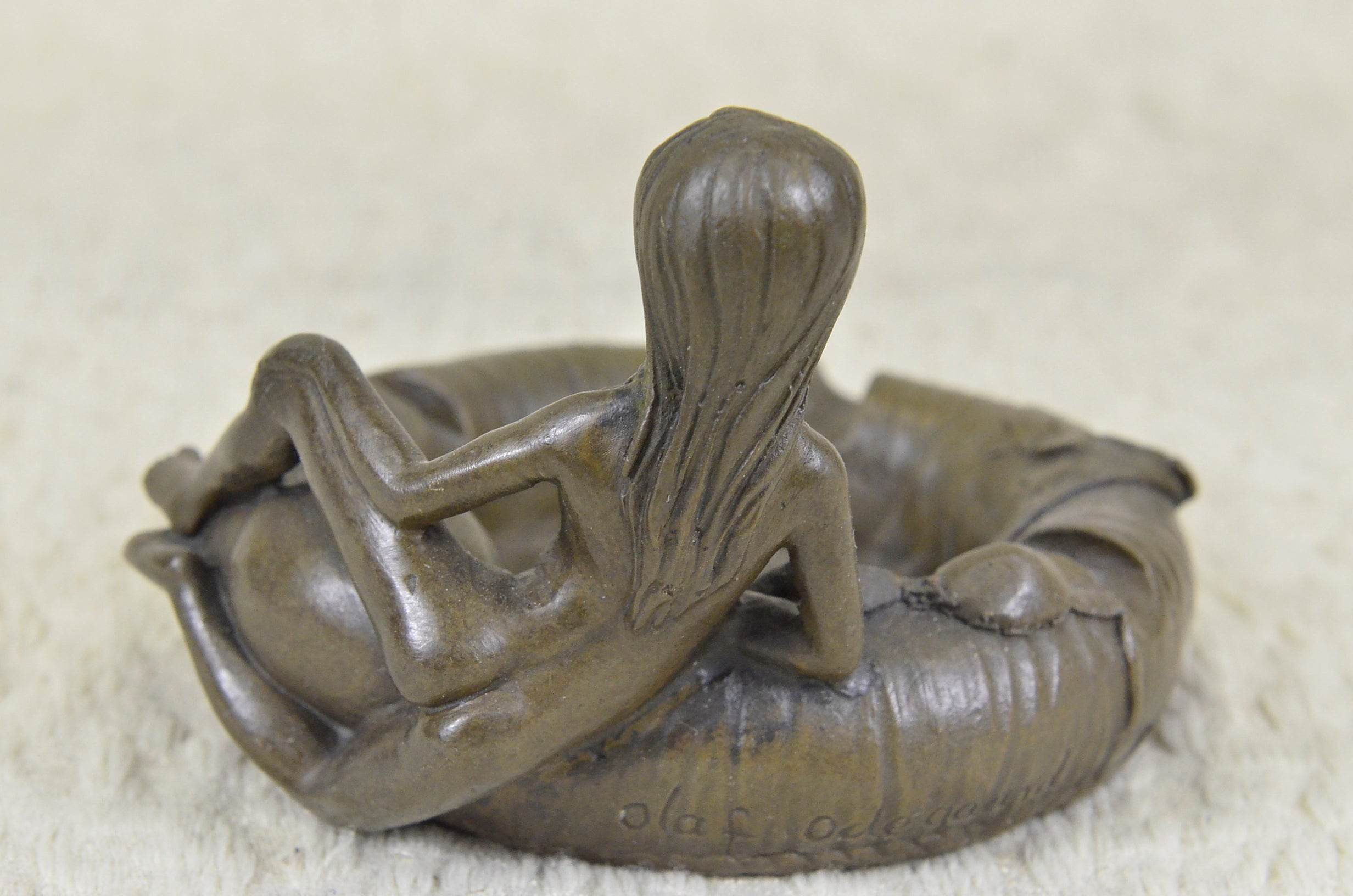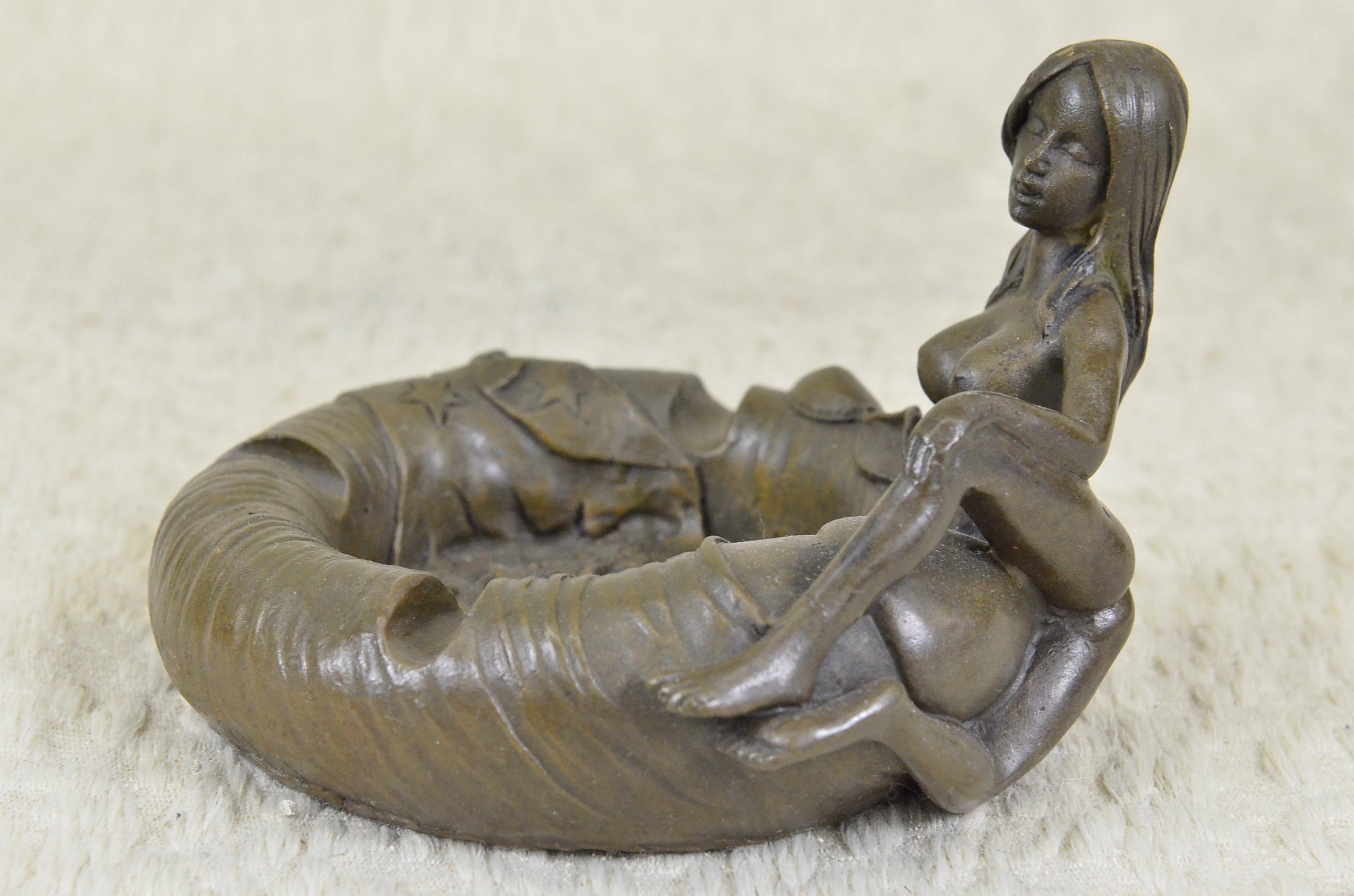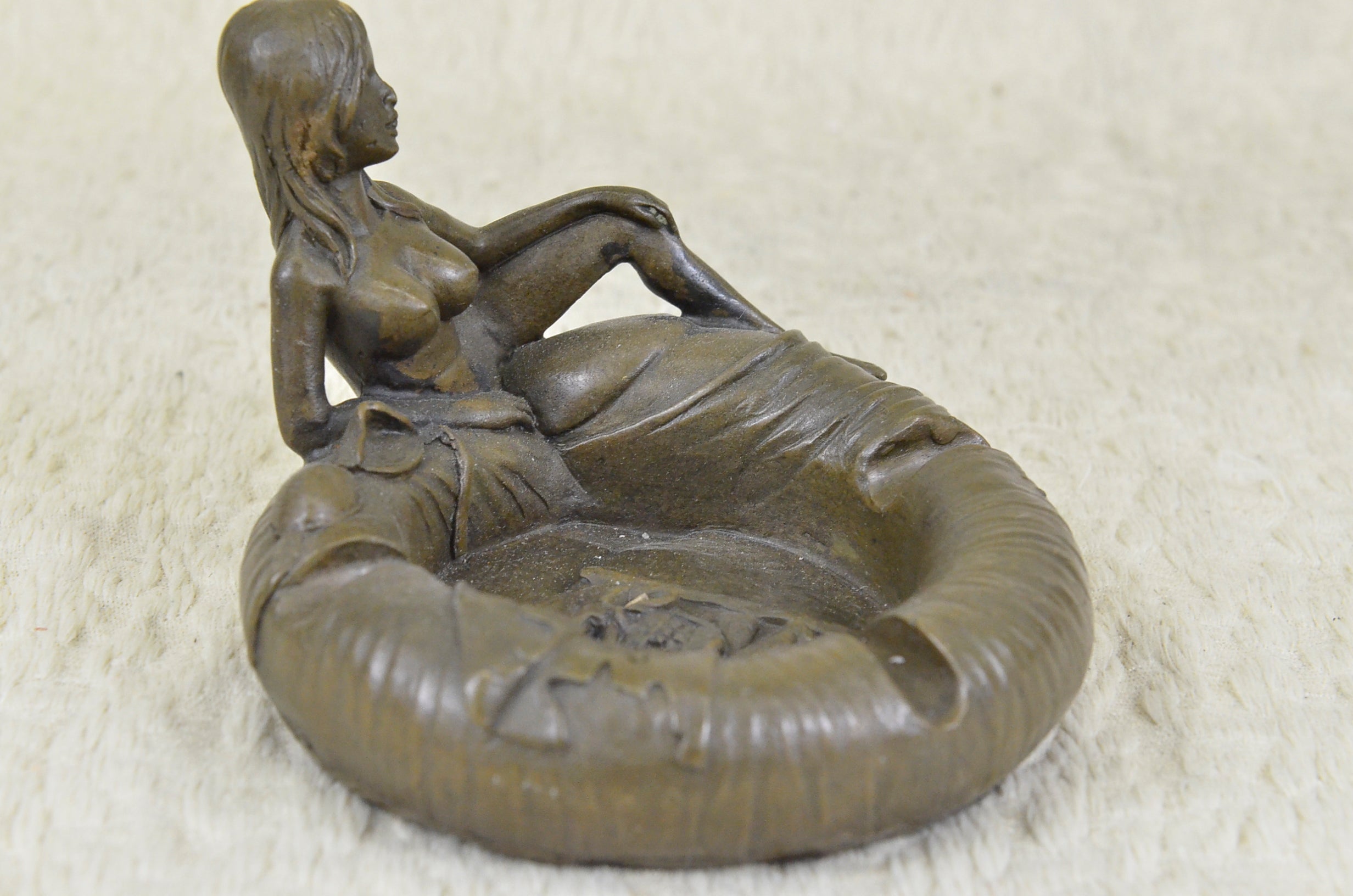 A hard to find collectible Hand crafted ashtray. This pin-up girl beauty will made a great addition to any ashtray collection. This Bronze Sculpture was casted using the “Lost Wax Method” and has a two tone brown patina. This sculpture is 100% bronze and is handmade. This sculpture is signed By artist Olaf Odegaard.Original or Reproduction: Original