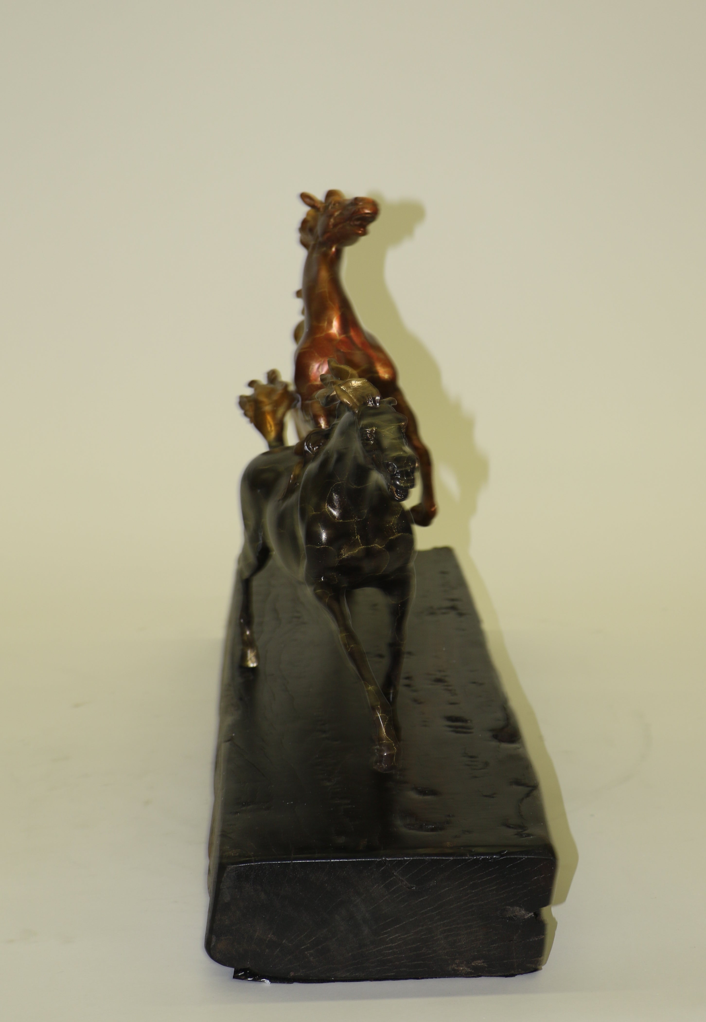 Extra Large Two Racing Horses Stallion on Natural Wood Bronze Sculpture Statue