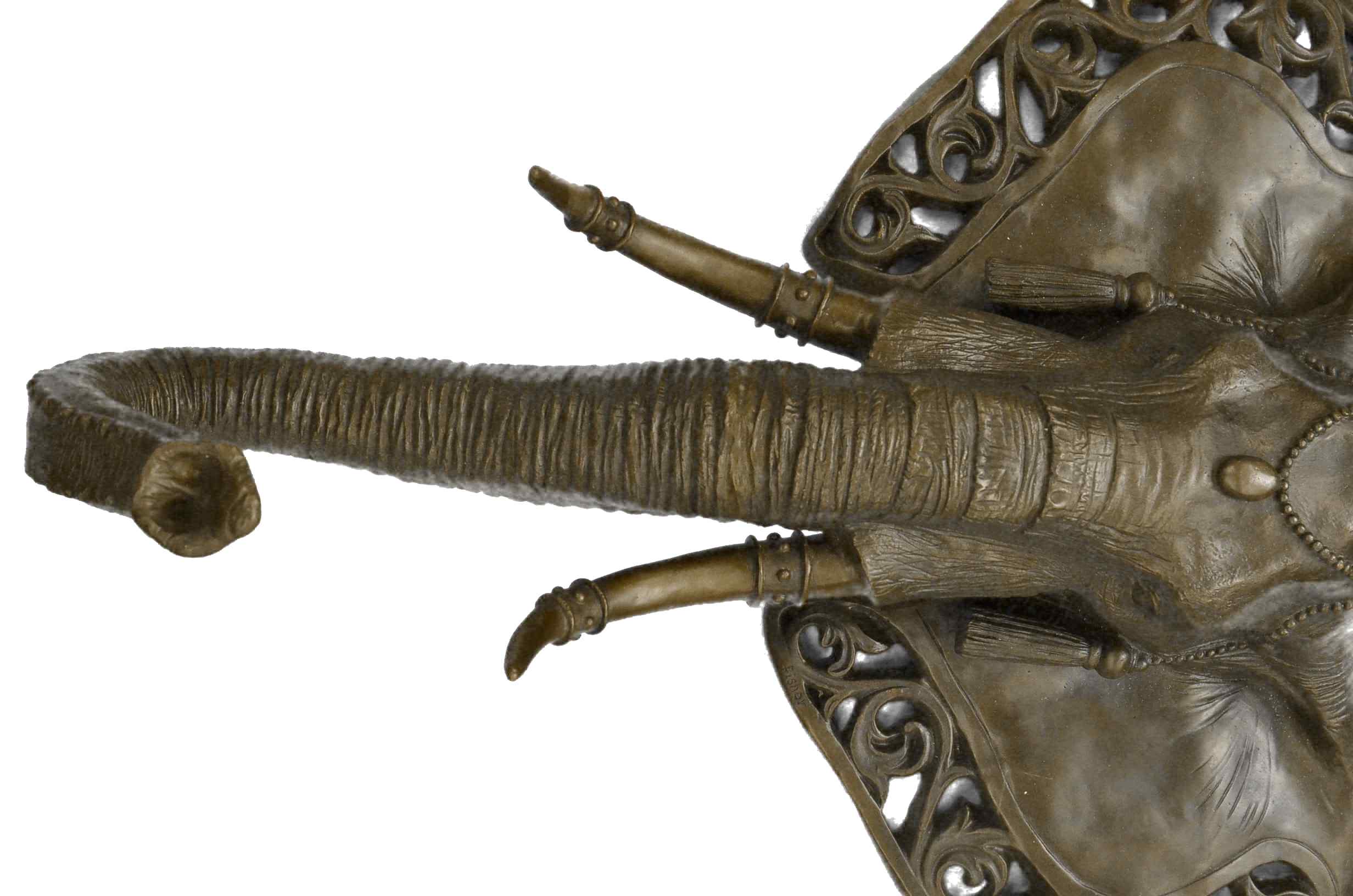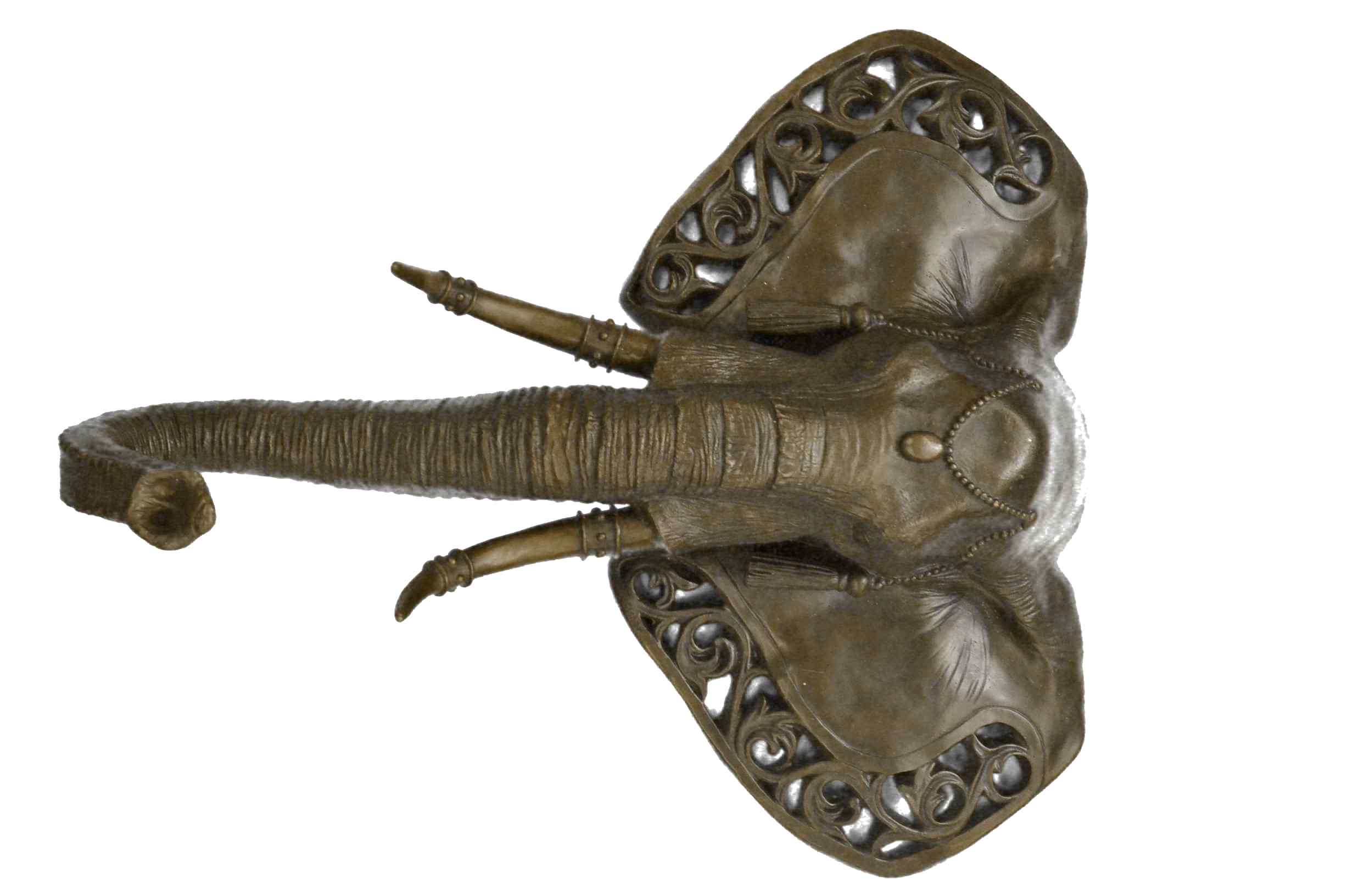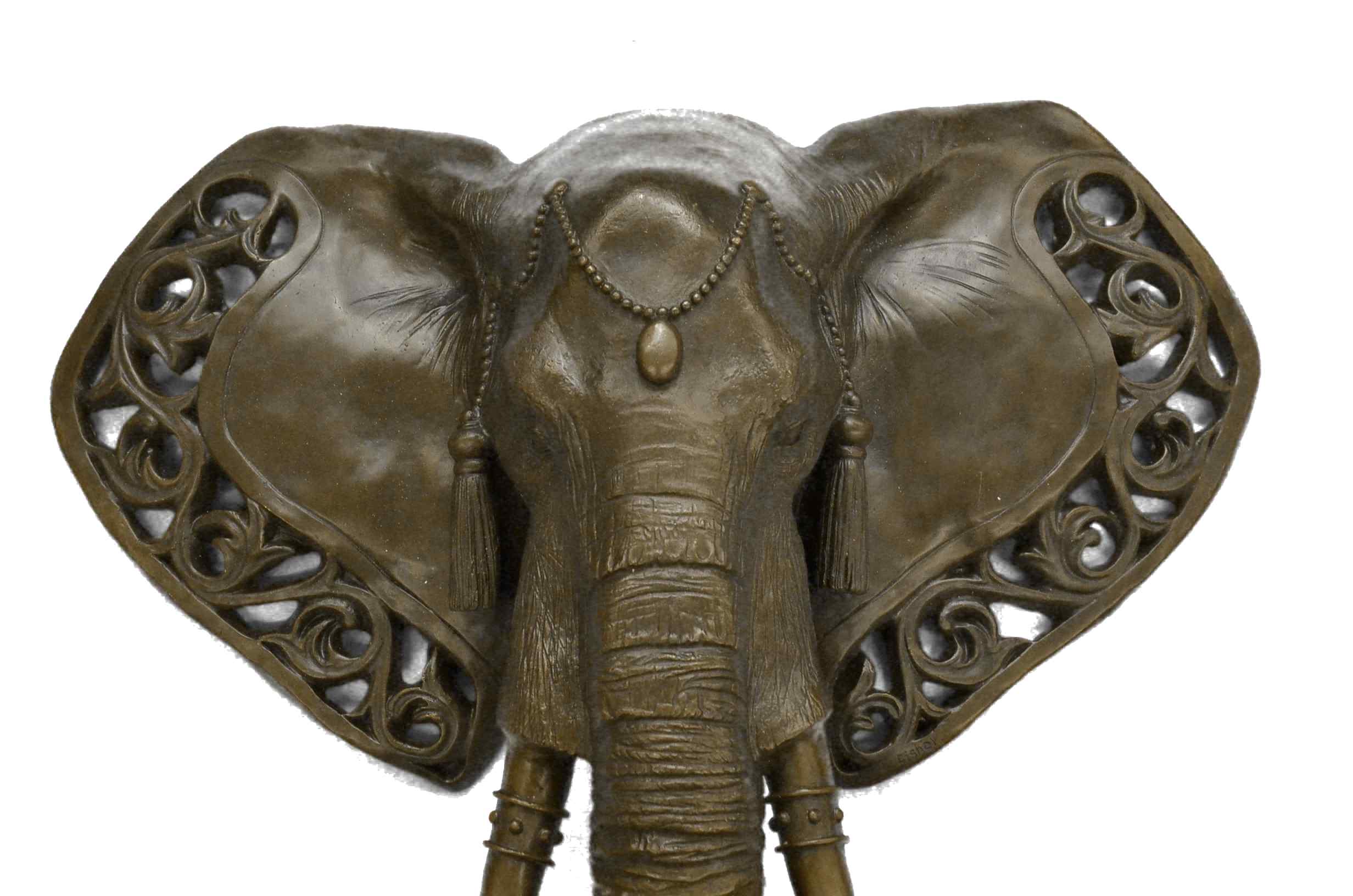 Large-size real bonze Elephant, head mount with ears and tusks, wall decor. Product made from real bronze with life-like features. With our wall mounted heads your favorite animals can come into your living room! Many people around the world are collectors of mounted heads. Mounted heads are usually hanged on a wall. In our handmade mounted heads collection you can find faces of pleasant animals such as horses, zebras and rams. Additionally, you can find some of the world`s most intimidating predators including bears, lions and tigers. All of our mounted heads are meticulously created down to the finest details, and handmade out of pure bronze which is a highly robust and long lasting material. Each model is hand-painted and its finishing touch is done by a special process and signed by artist Fisher which gives the models their authentic look. There`s no need to hunt down and kill an animal in order to enjoy its beauty.Original or Reproduction: Reproduction
