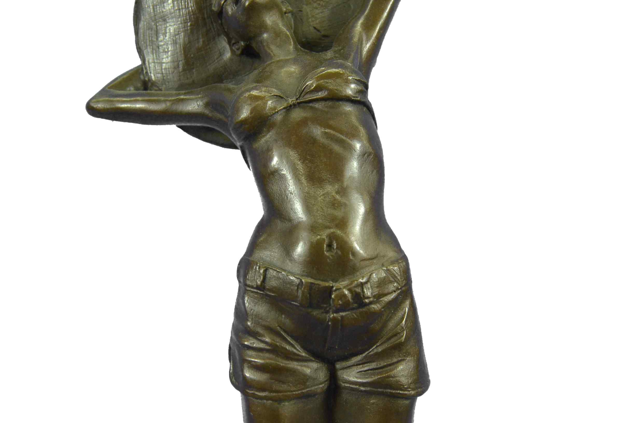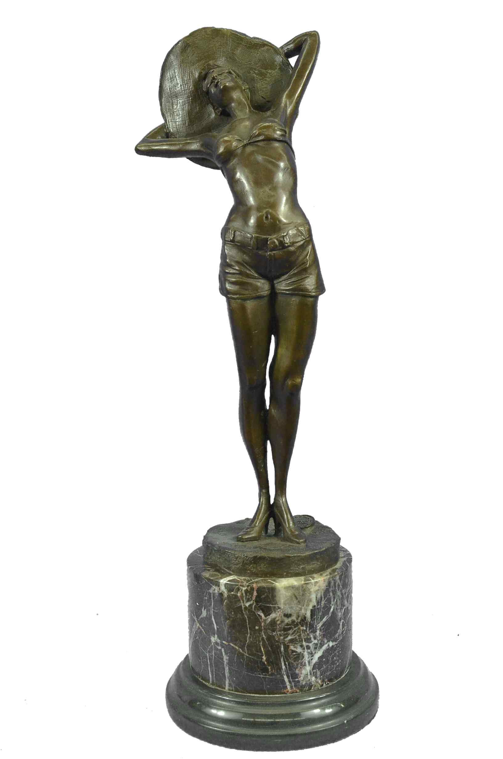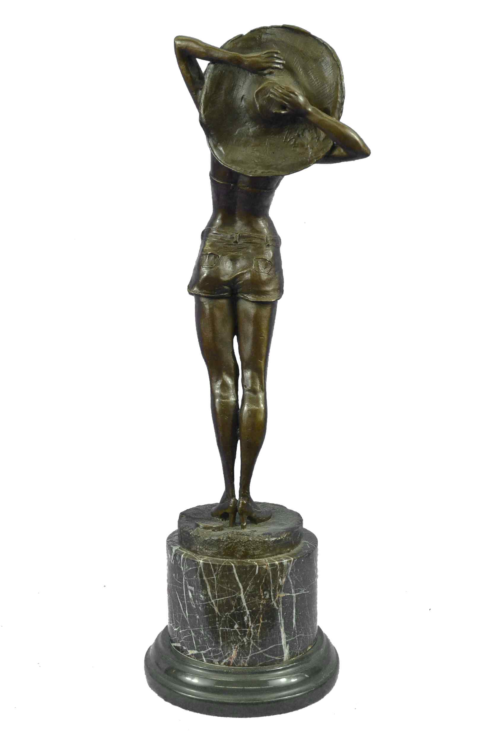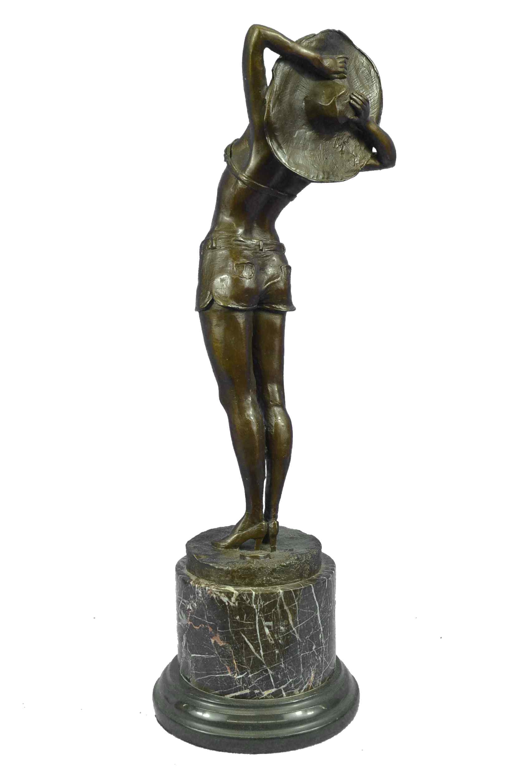 This is a beautiful and amazing piece of art. This woman soaks in the sun while she breathe in the hot summer day weather. She wears the most adorable jean shorts, white bikini top, sunglasses, and a huge old fashion hat that covers all of the sun off her head. She seems to be enjoying the day by herself, and although you cant see because of her sunglasses it seems to me as if she has her eyes closed to picture the beauty around her. She has a wonderful and fit frame as she stretches upwards and puts her arms behind her head to hold on to her hat. This magnificent modern sculpture is cast using the "Lost Wax Method" in a multicolor two tone brown, blue, and white patina. She is mounted atop a gorgeous Brown and a little bit of black marble base, signed by the artist A.Gory.Original or Reproduction: Reproduction