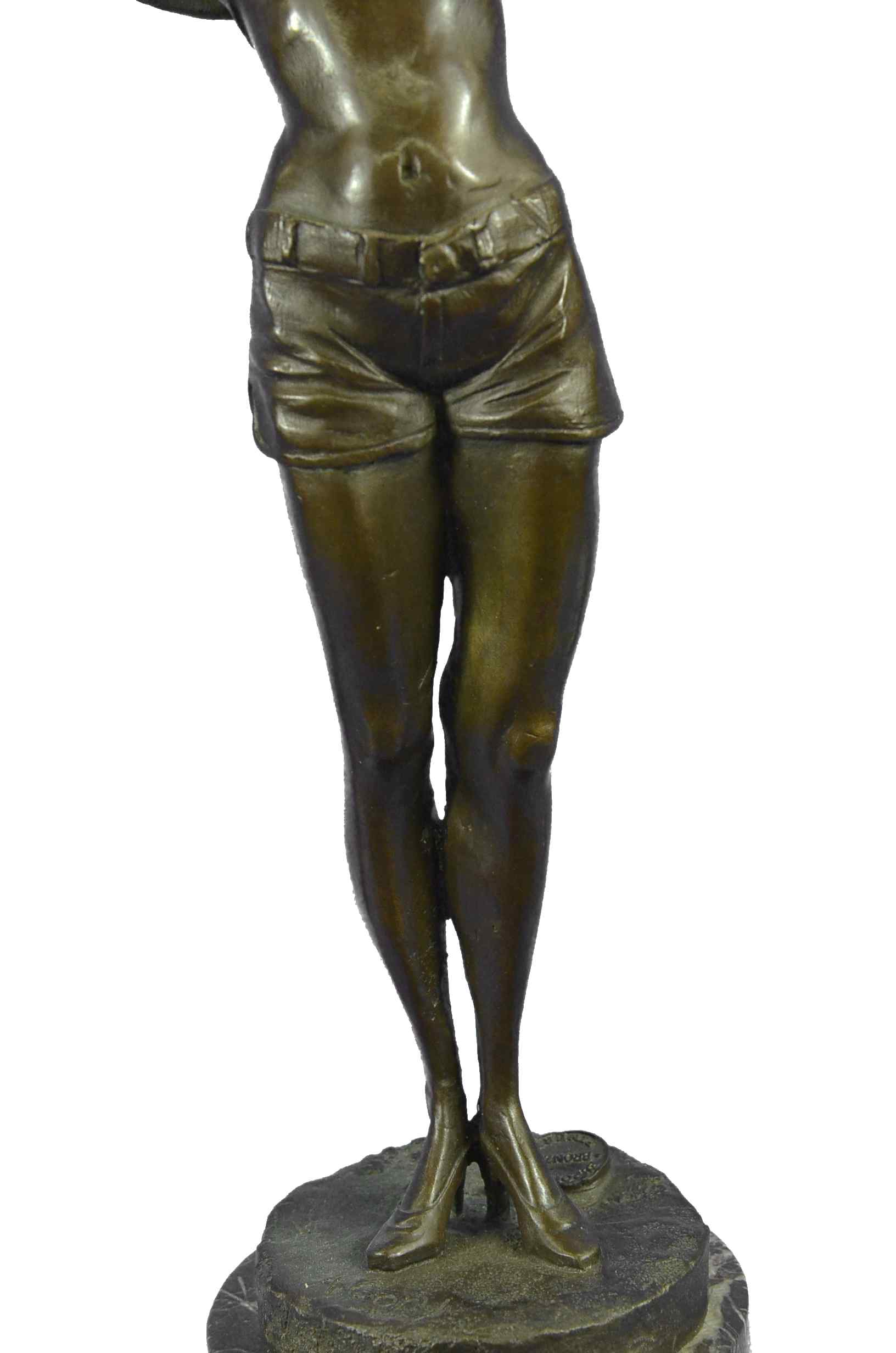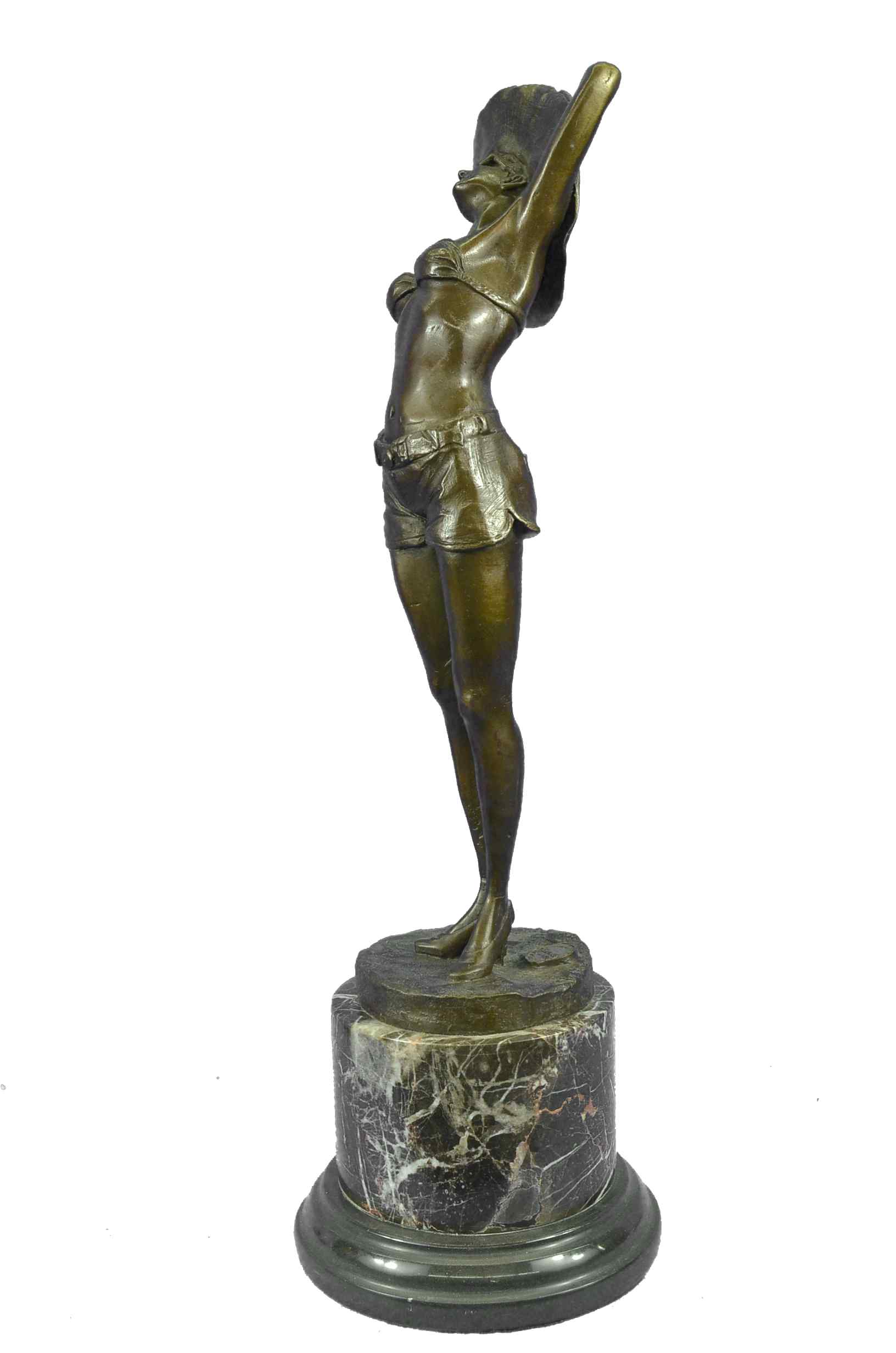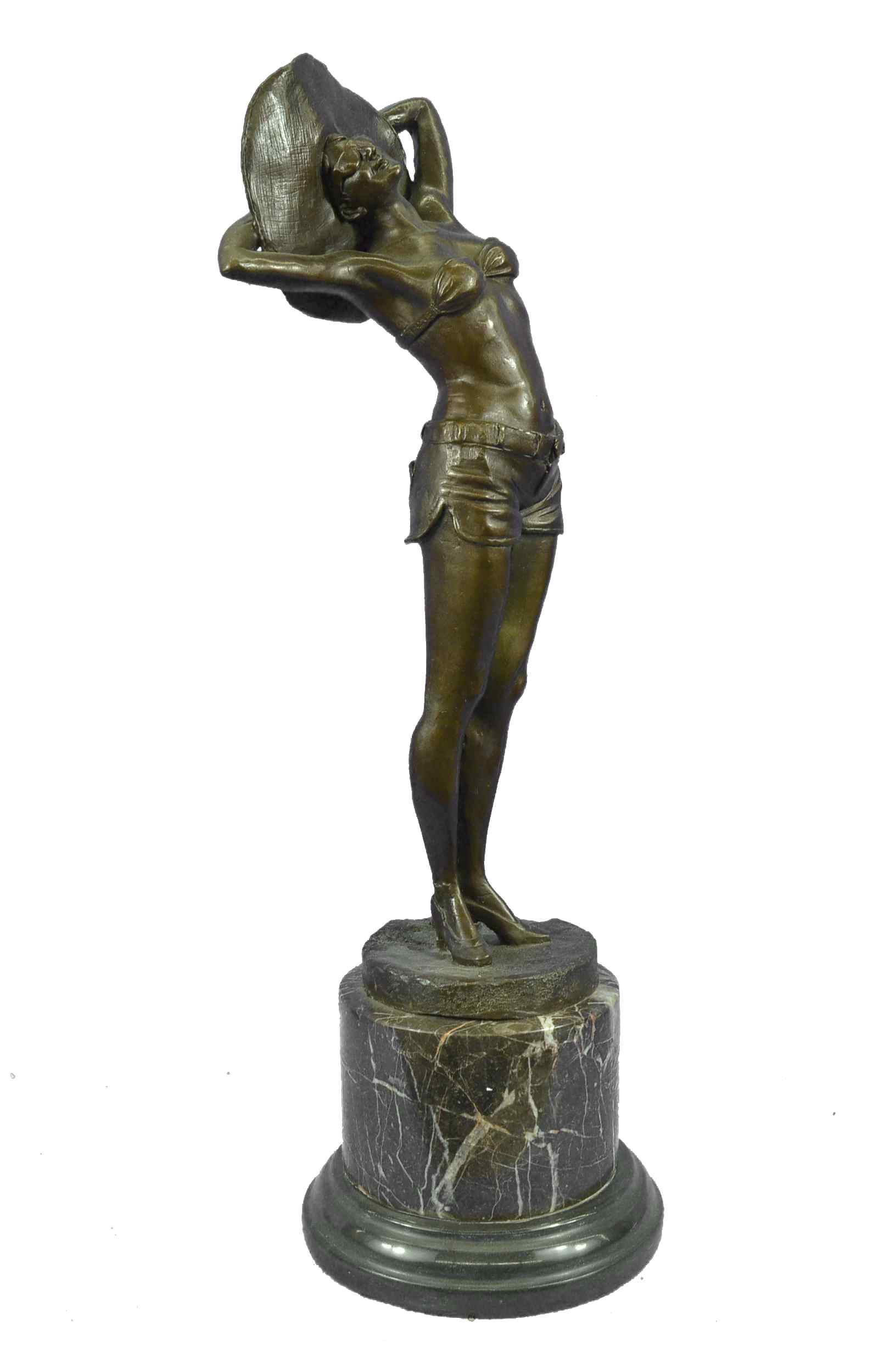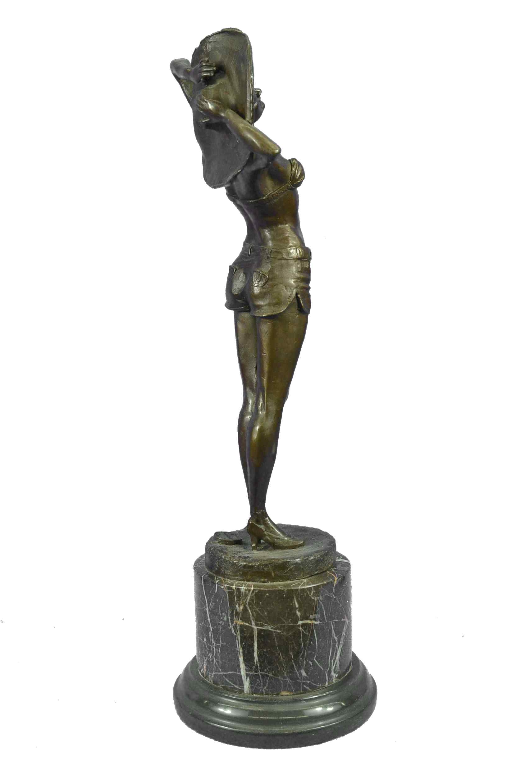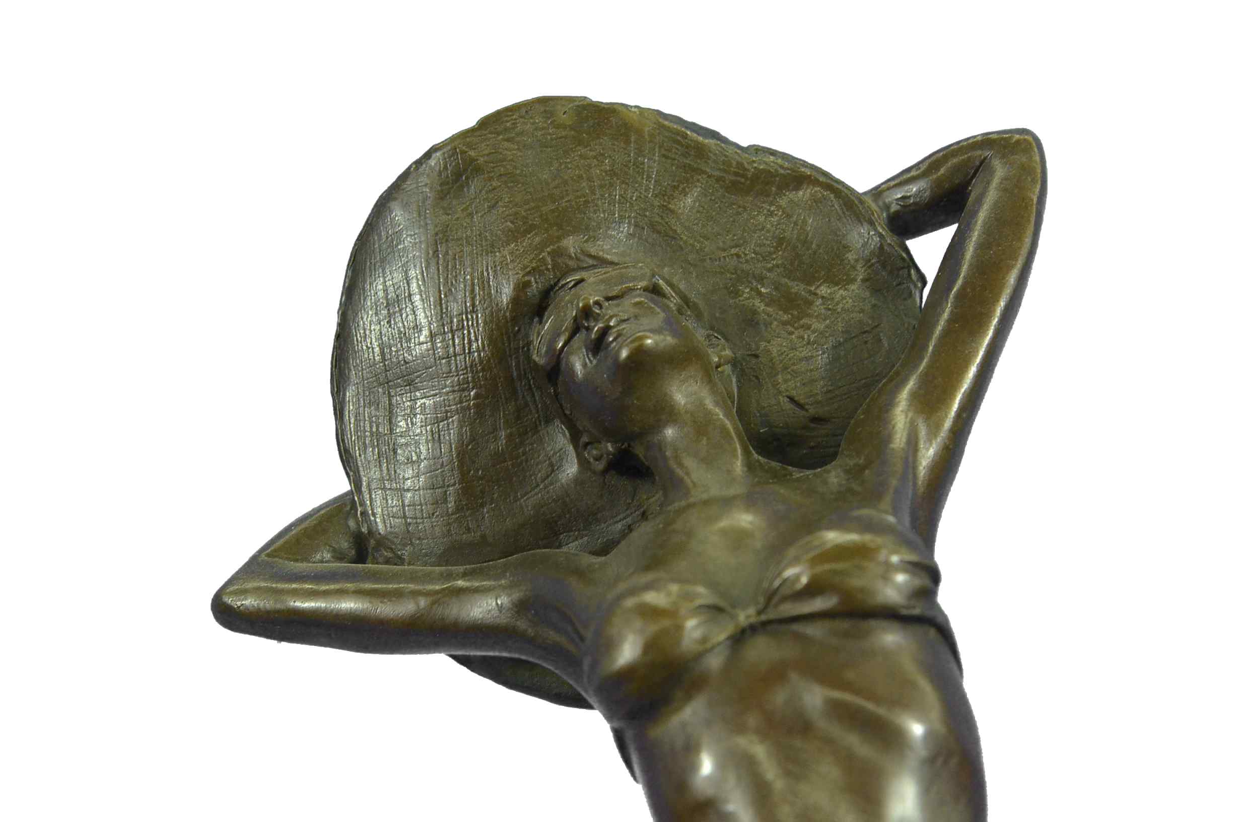 This is a beautiful and amazing piece of art. This woman soaks in the sun while she breathe in the hot summer day weather. She wears the most adorable jean shorts, white bikini top, sunglasses, and a huge old fashion hat that covers all of the sun off her head. She seems to be enjoying the day by herself, and although you cant see because of her sunglasses it seems to me as if she has her eyes closed to picture the beauty around her. She has a wonderful and fit frame as she stretches upwards and puts her arms behind her head to hold on to her hat. This magnificent modern sculpture is cast using the "Lost Wax Method" in a multicolor two tone brown, blue, and white patina. She is mounted atop a gorgeous Brown and a little bit of black marble base, signed by the artist A.Gory.Original or Reproduction: Reproduction