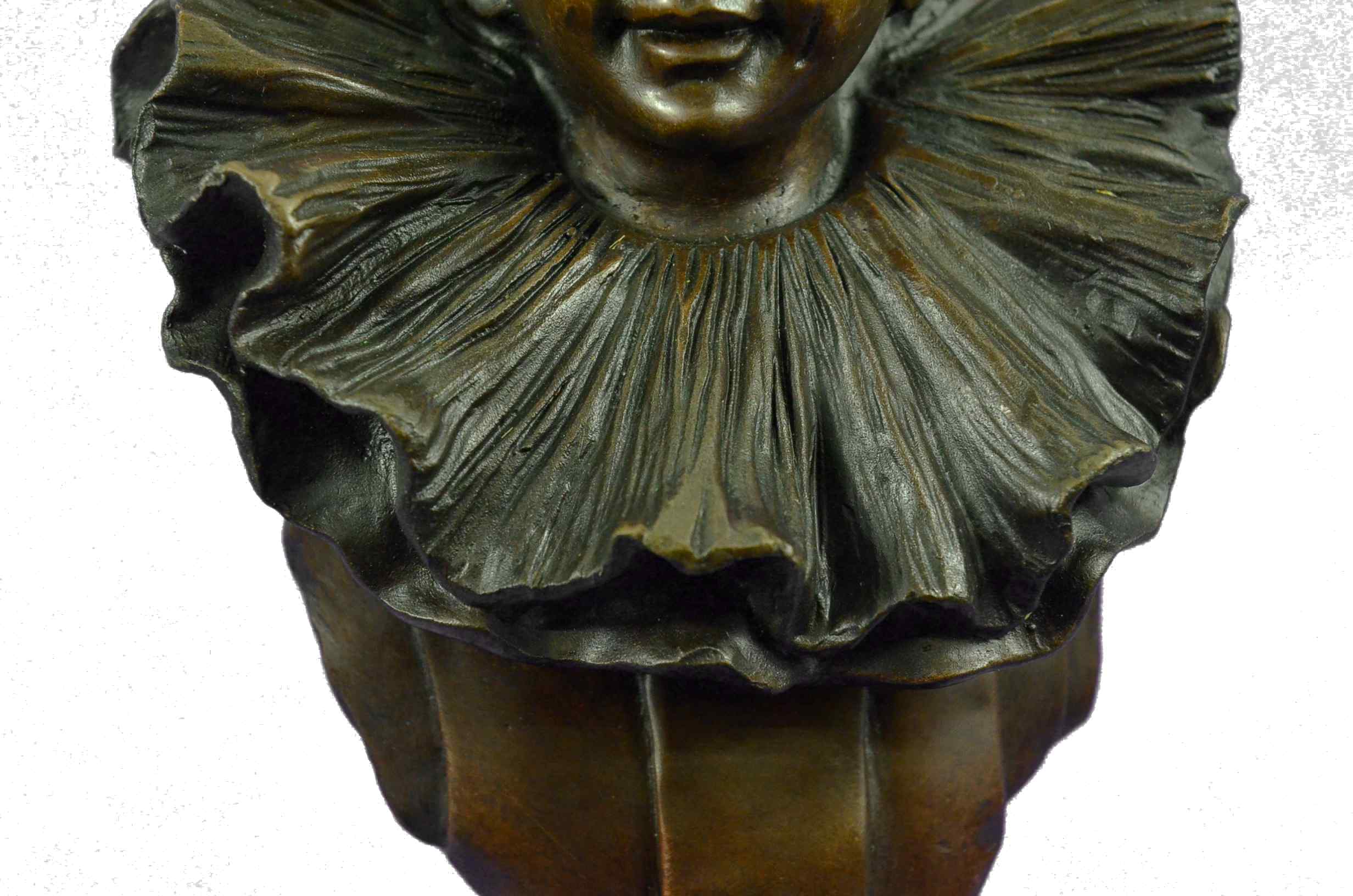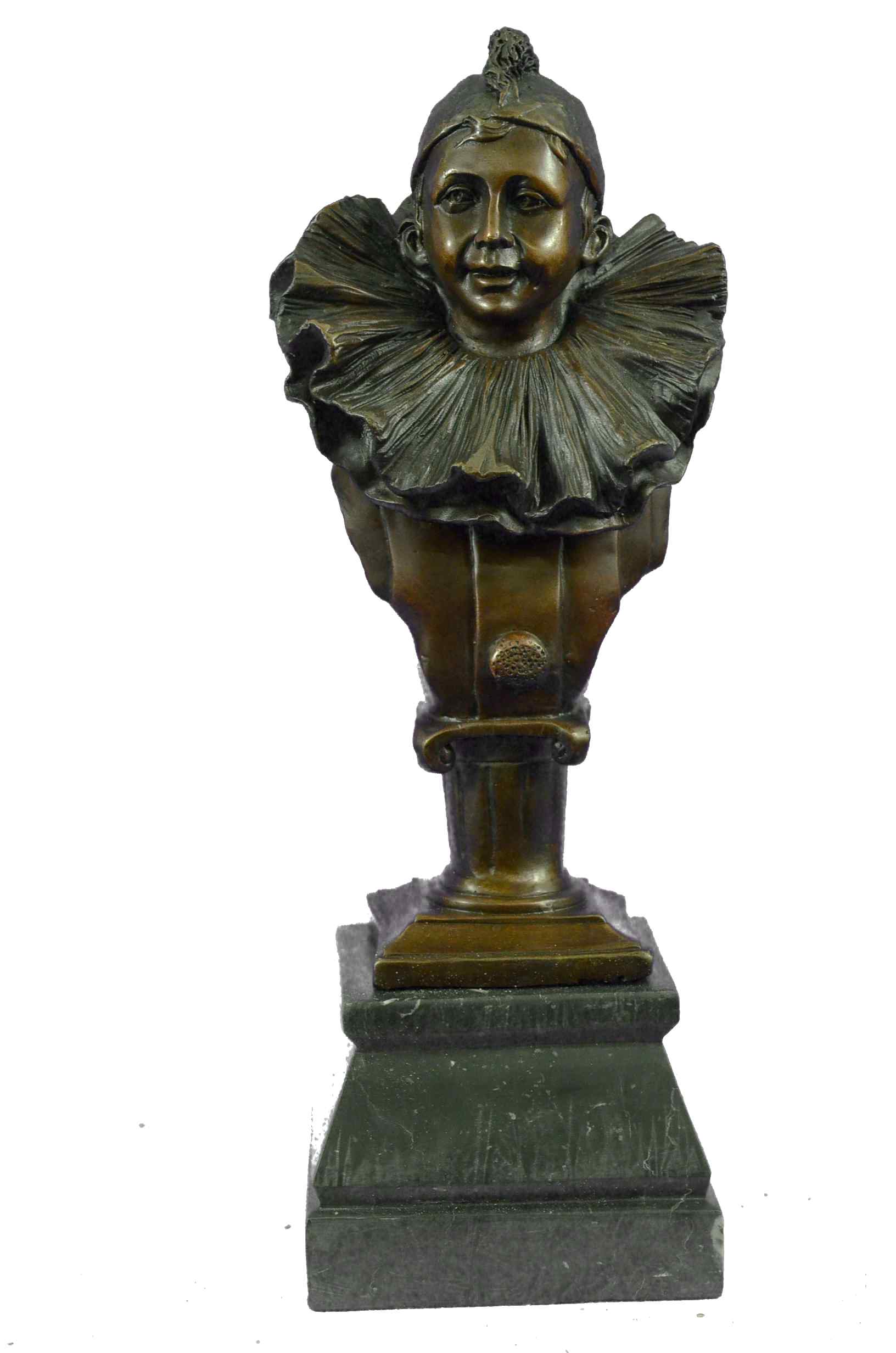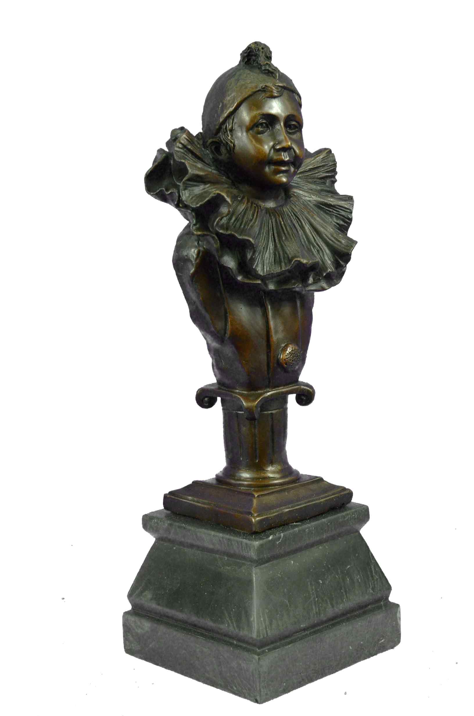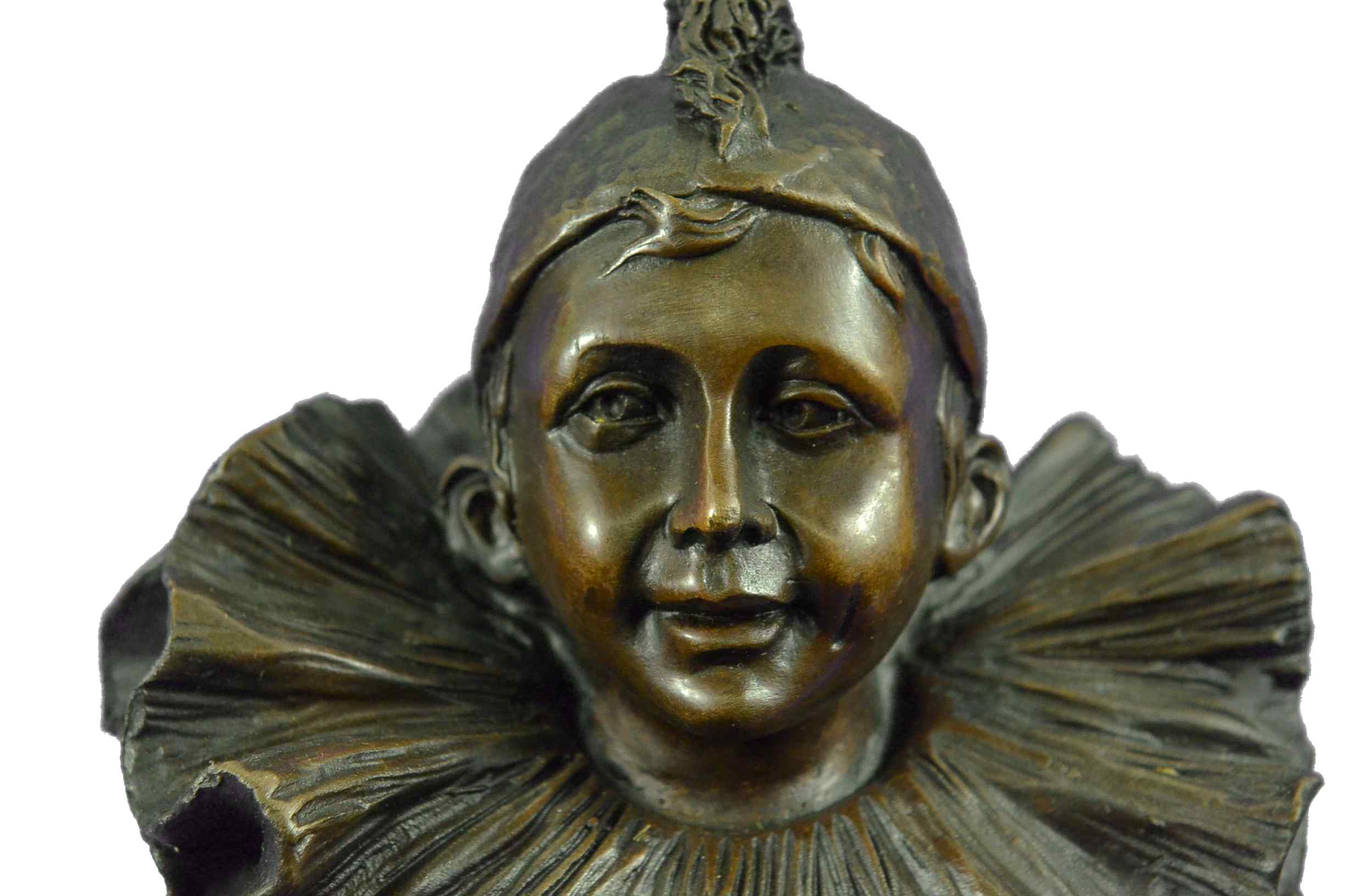 What a happy guy! This vintage production bronze figurine of a clown or pierrot bust has a jolly face. 100% bronze and handmade, this brown patina sculpture was cast using the "Lost Wax Method" and mounted on a black marble base. It is signed by the artist Felix Pierre RichardBronze Dimensions with Marble Base:Height 13" x Width 5"
