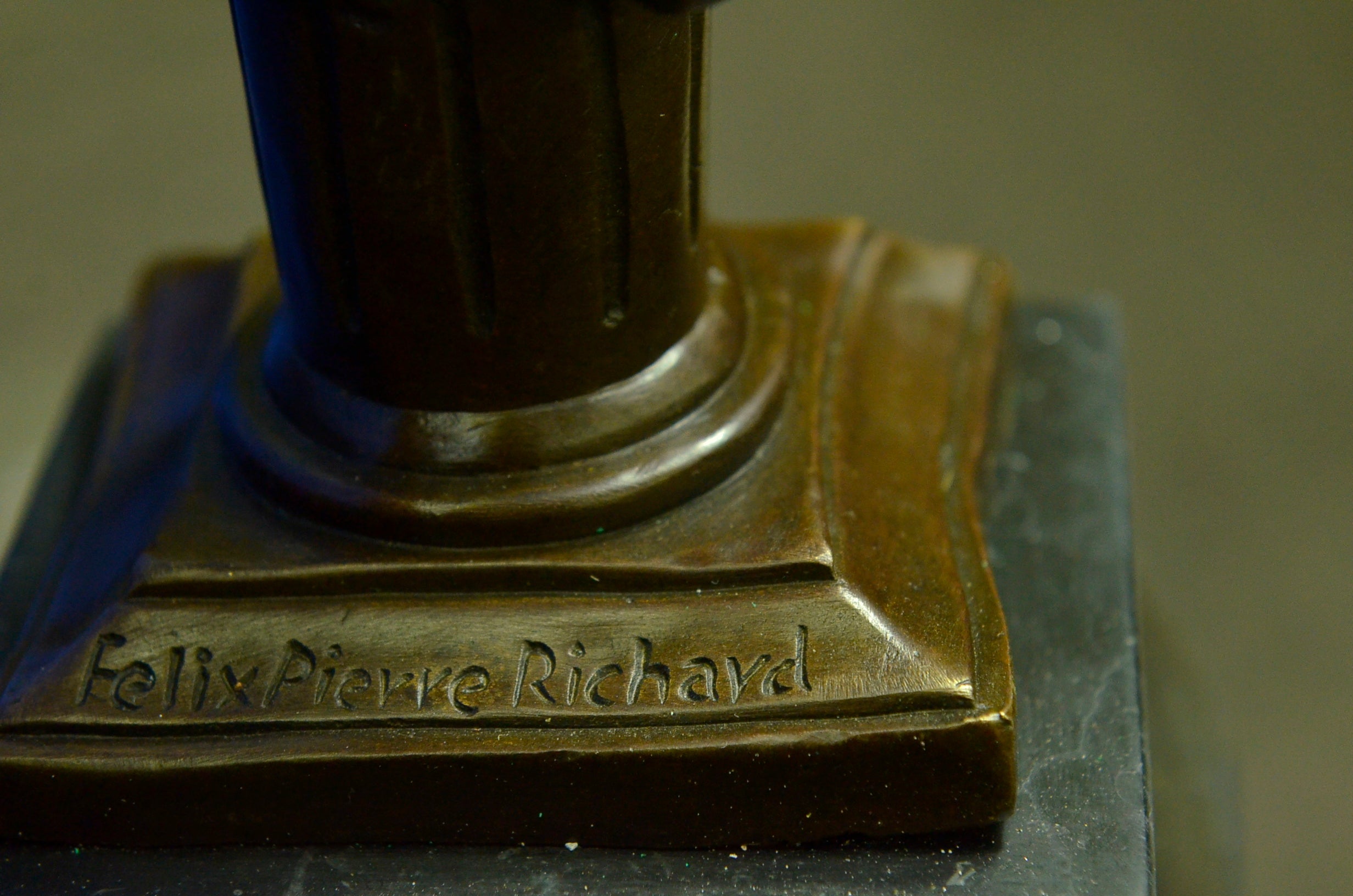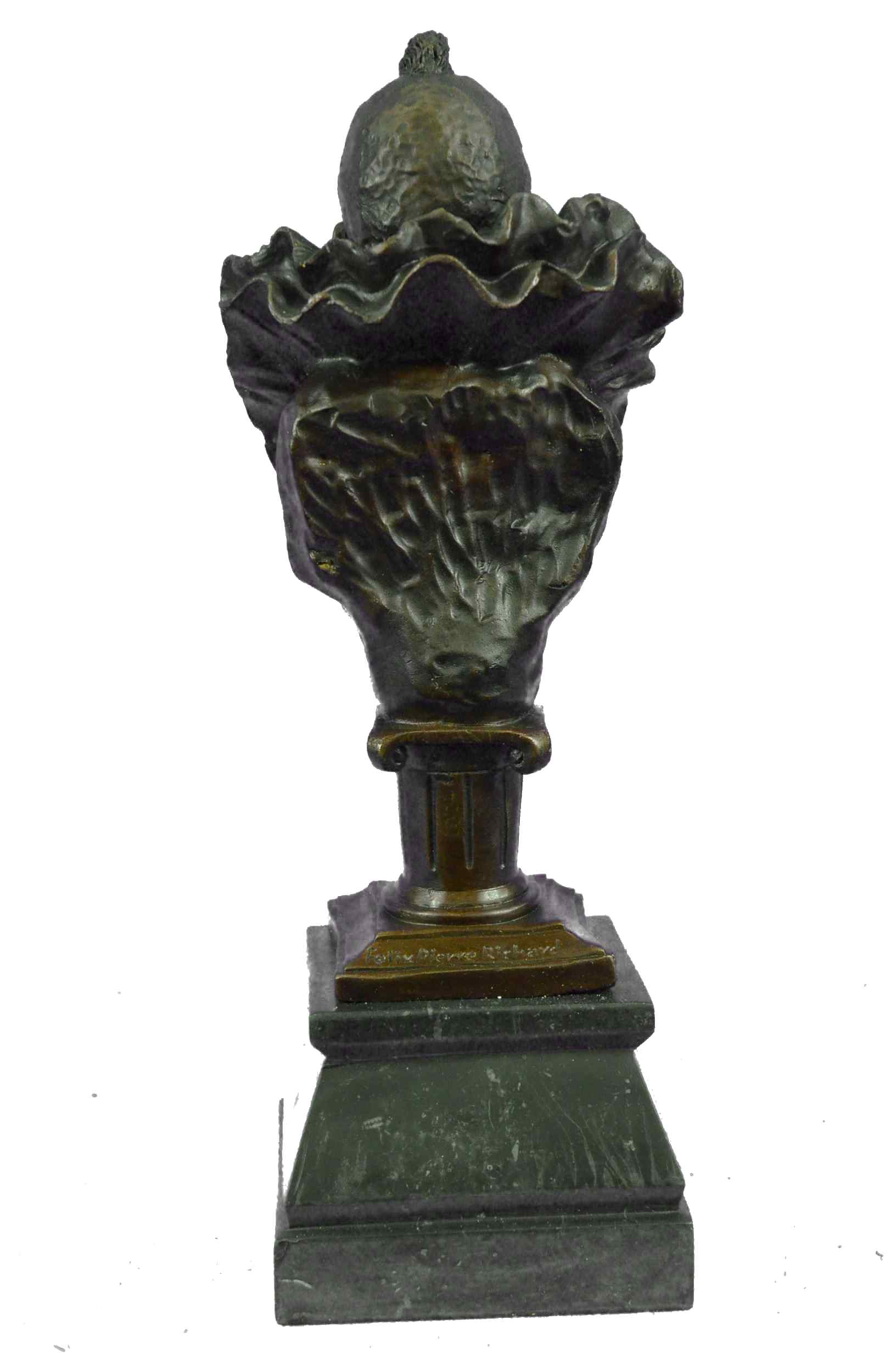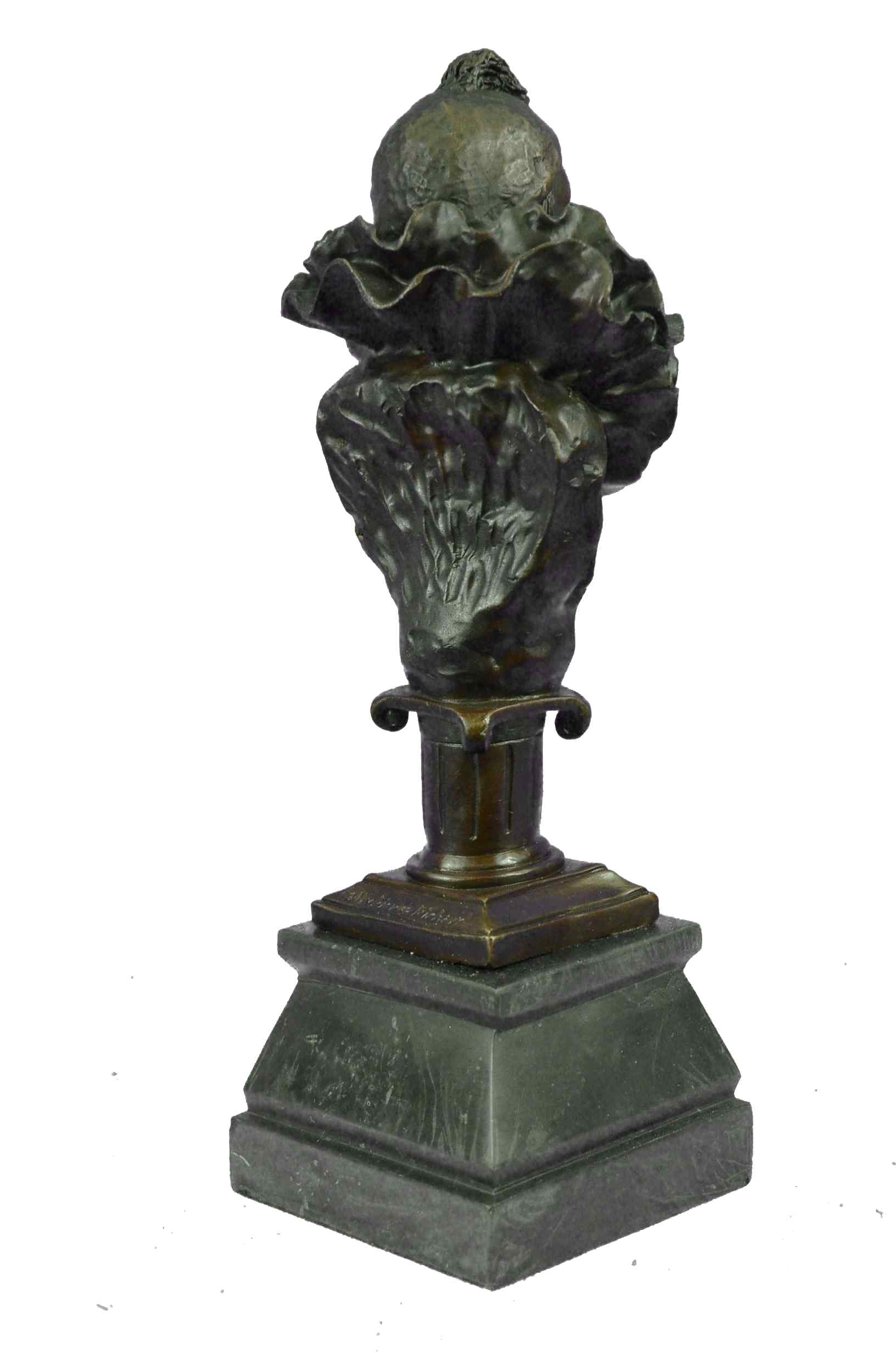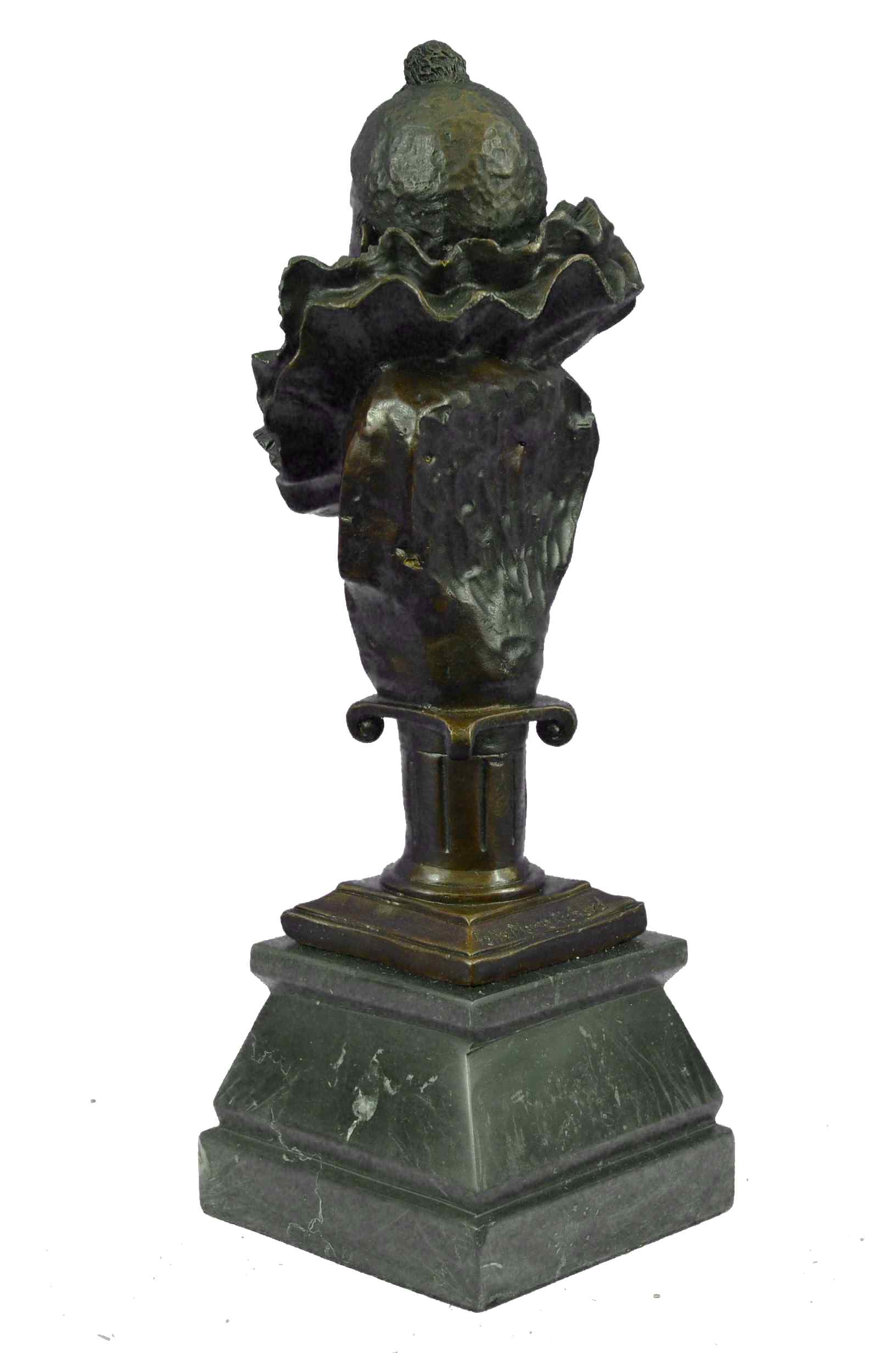 What a happy guy! This vintage production bronze figurine of a clown or pierrot bust has a jolly face. 100% bronze and handmade, this brown patina sculpture was cast using the "Lost Wax Method" and mounted on a black marble base. It is signed by the artist Felix Pierre RichardBronze Dimensions with Marble Base:Height 13" x Width 5"