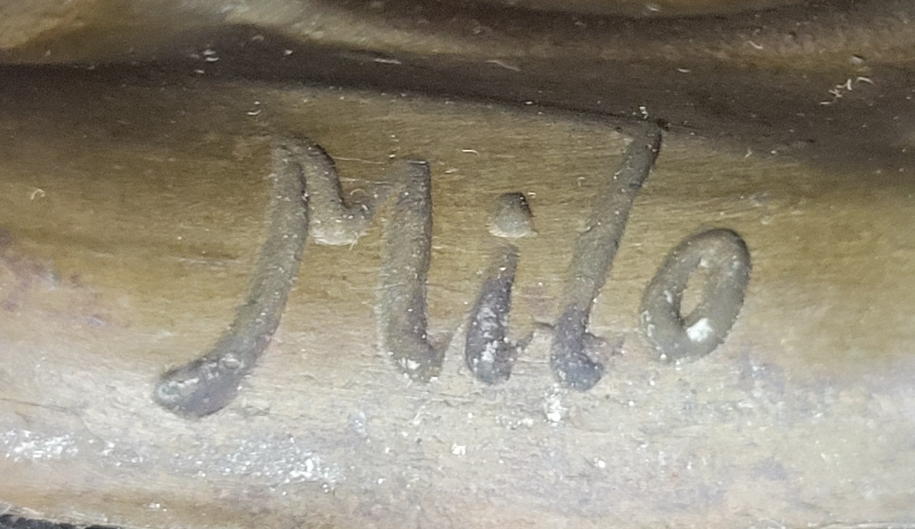 Elevate your decor with this exquisite handcrafted bronze sculpture depicting a graceful female figure holding a flower cornucopia. Signed by the renowned artist Milo, this stunning piece is a testament to masterful artistry and attention to detail. Crafted using the traditional lost wax method, it features a rich two-tone brown patina that enhances its elegant design and intricate textures.