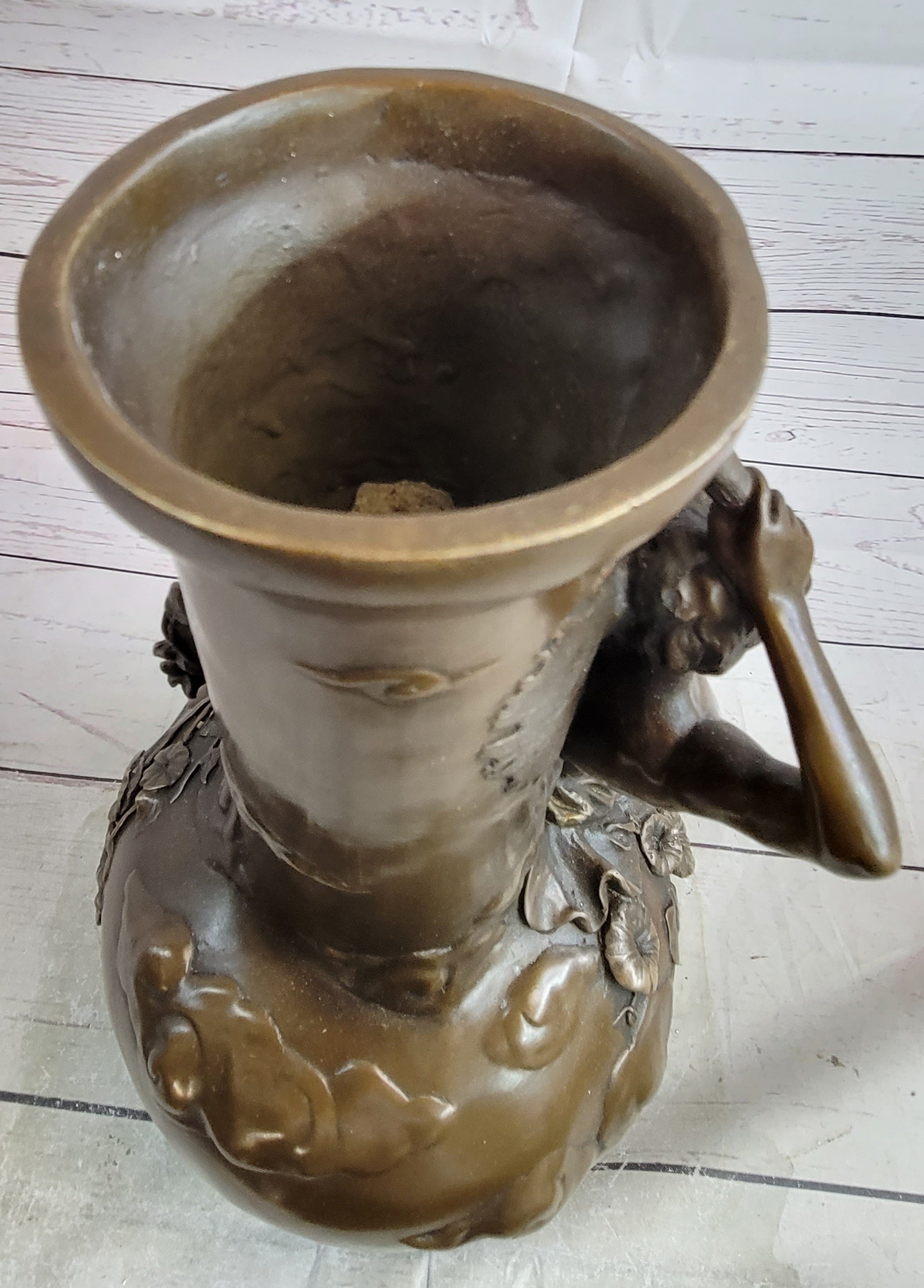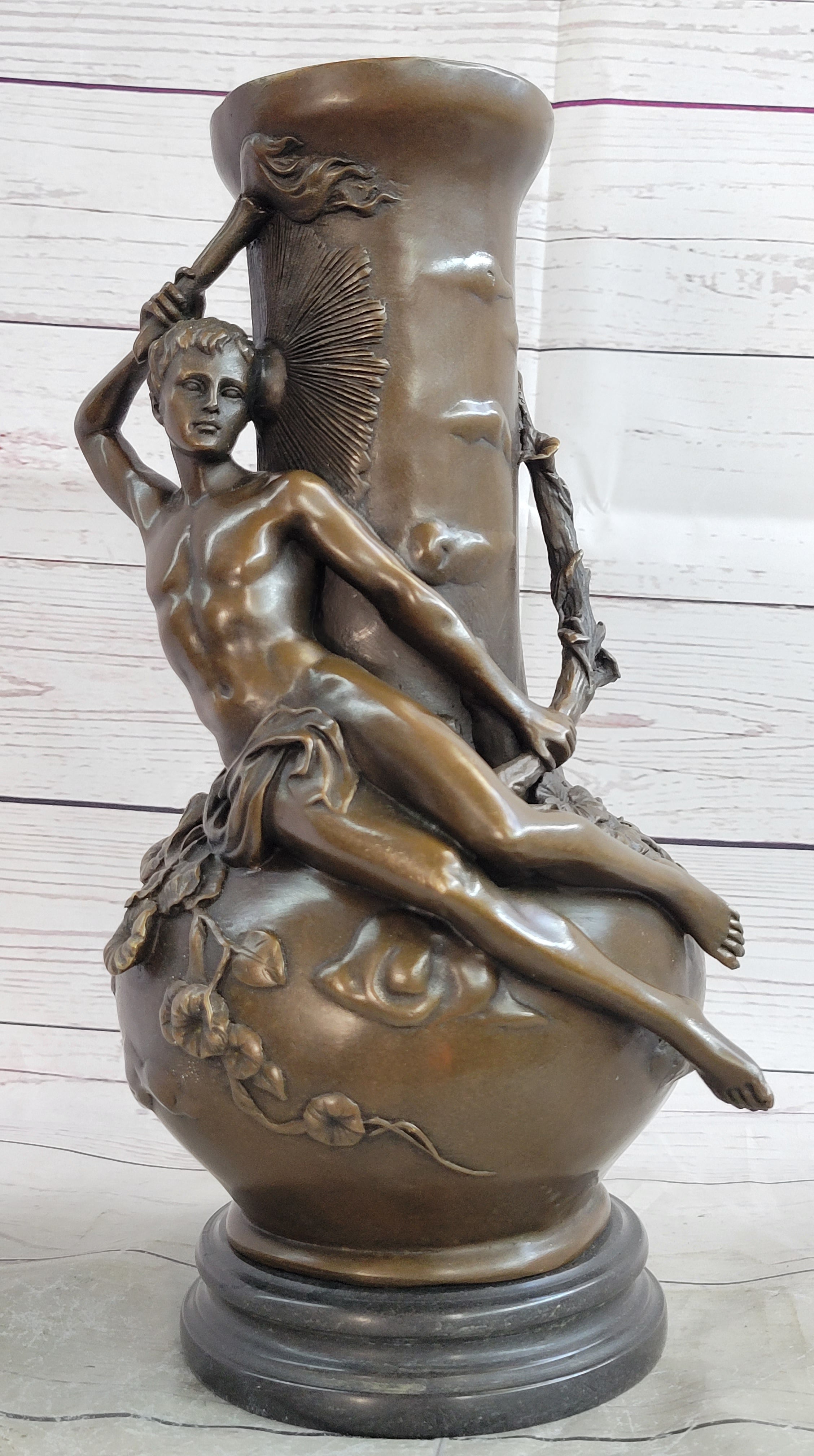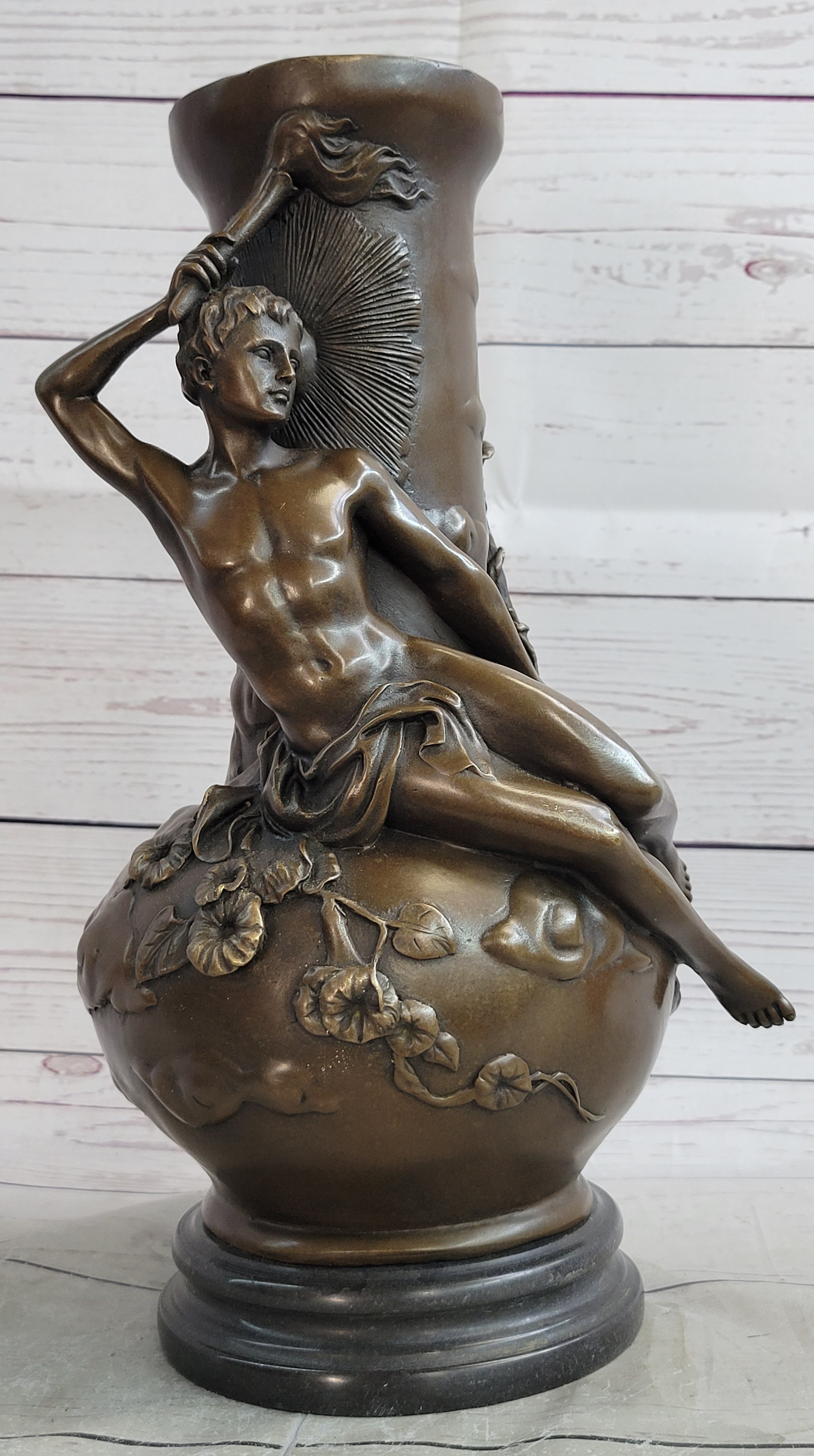 Figurative Nude Male Antique Vintage Style Bronze Metal Vase on Marble Base